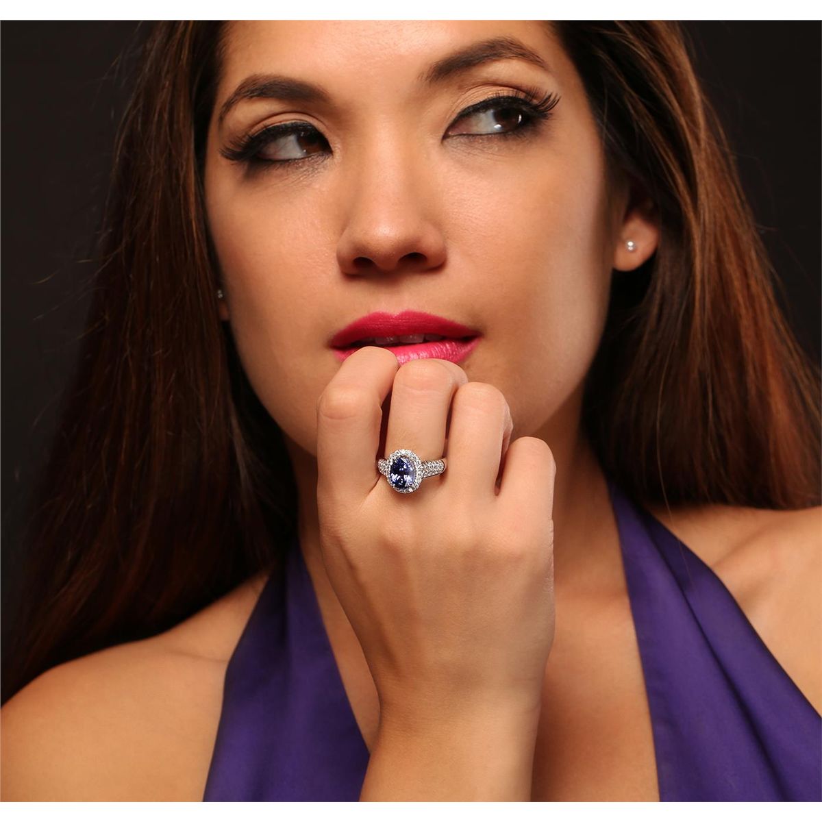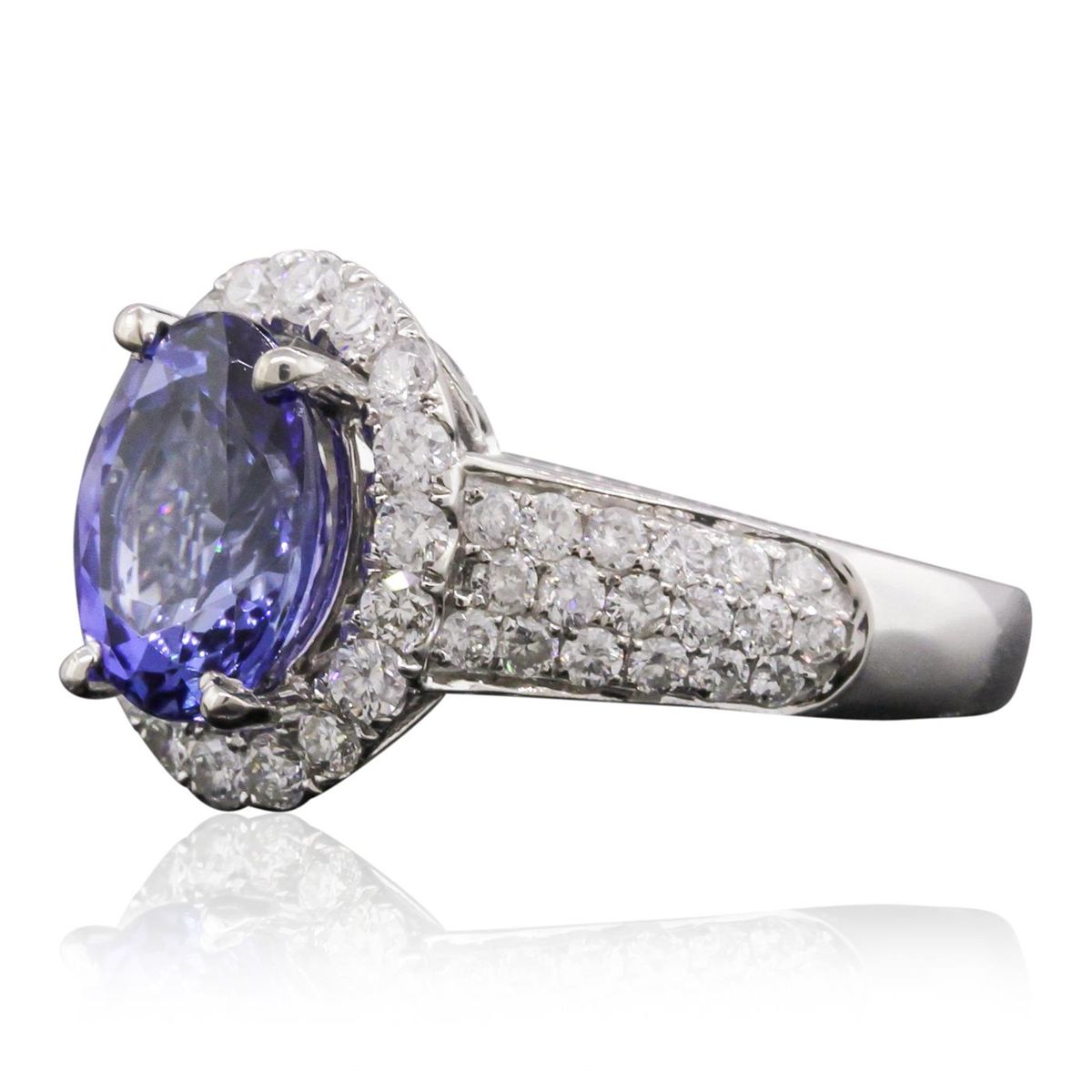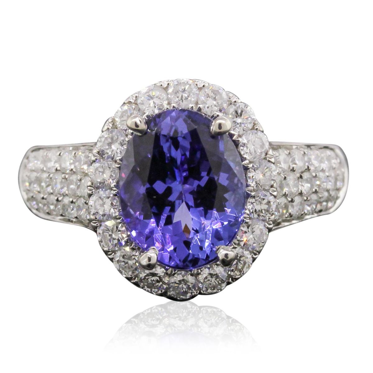 One electronically tested 14KT white gold Ladies combination cast & assembled ring with a bright polish finish. Condition is new. Identified with markings of "14K". Containing: Fifty-Four bead set round brilliant cut diamonds, measuring 1.70 - 1.70 x 1.02mm (depth est.) approximate. Total Weight of 54 Stones = 1.24ct. Clarity: I-1 to I-2. Color: H - I, Cut is Good. One prong set oval modified brilliant cut natural tanzanite, measuring 10.00 x 7.80 x 5.40mm, exact weight 2.88ct., clarity is eye clean, type I, medium light, very slightly grayish, violet color, (GIA V 4/3), cut is very good. Colored gemstones are presumed to have been subjected to commonly used color/clarity enhancement processes. Total Weight of Colored Stones 2.88ct. Total Weight of Diamonds 1.24ct. Total Weight of Ring 5.90 grams. GGL Appraised at $8,570.00.