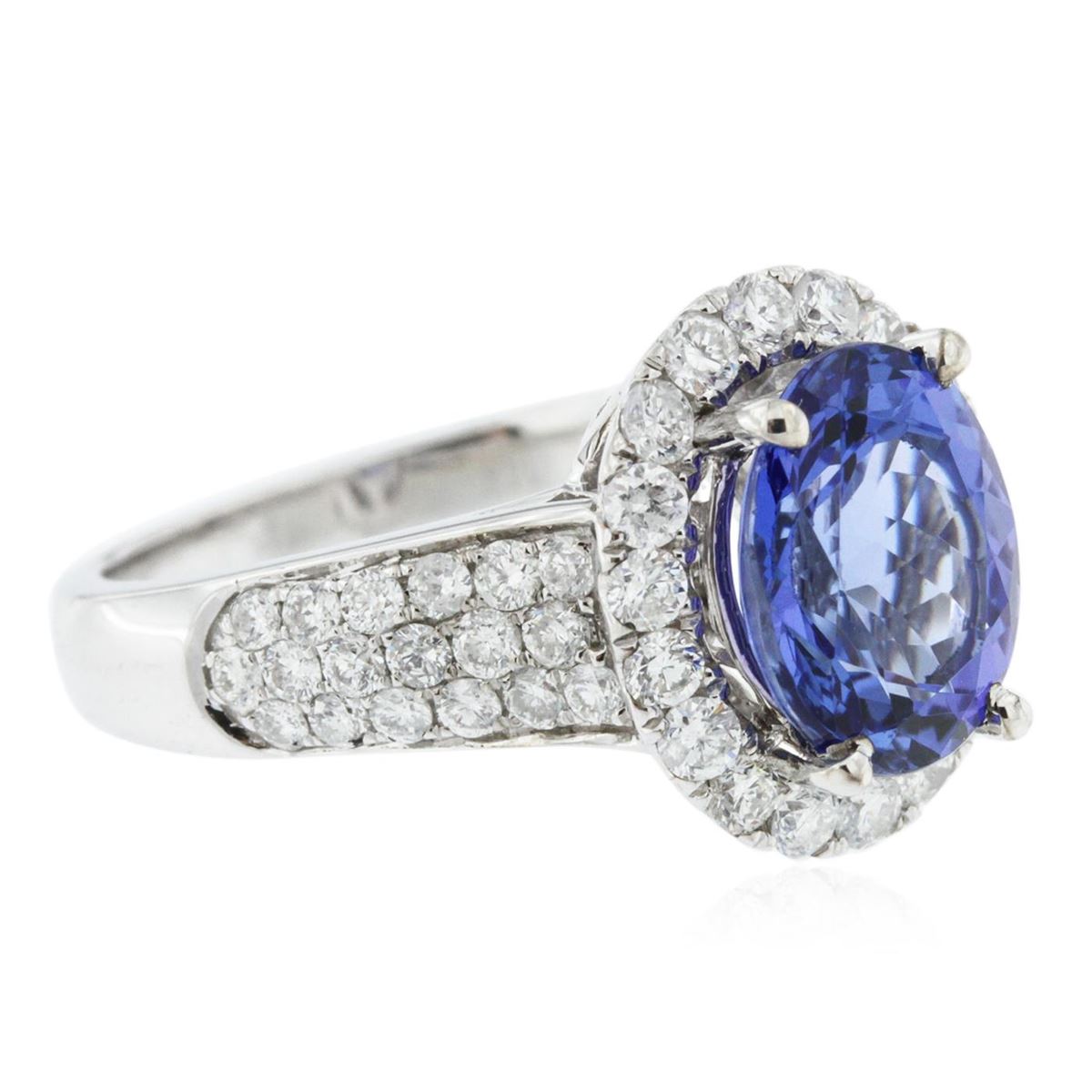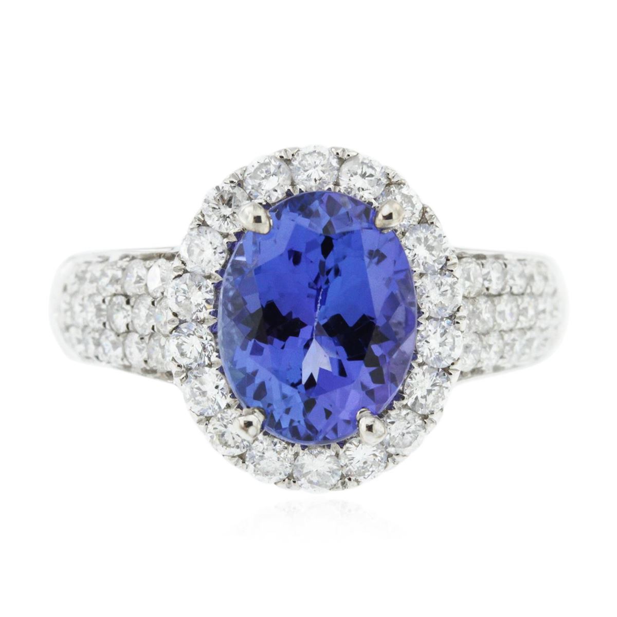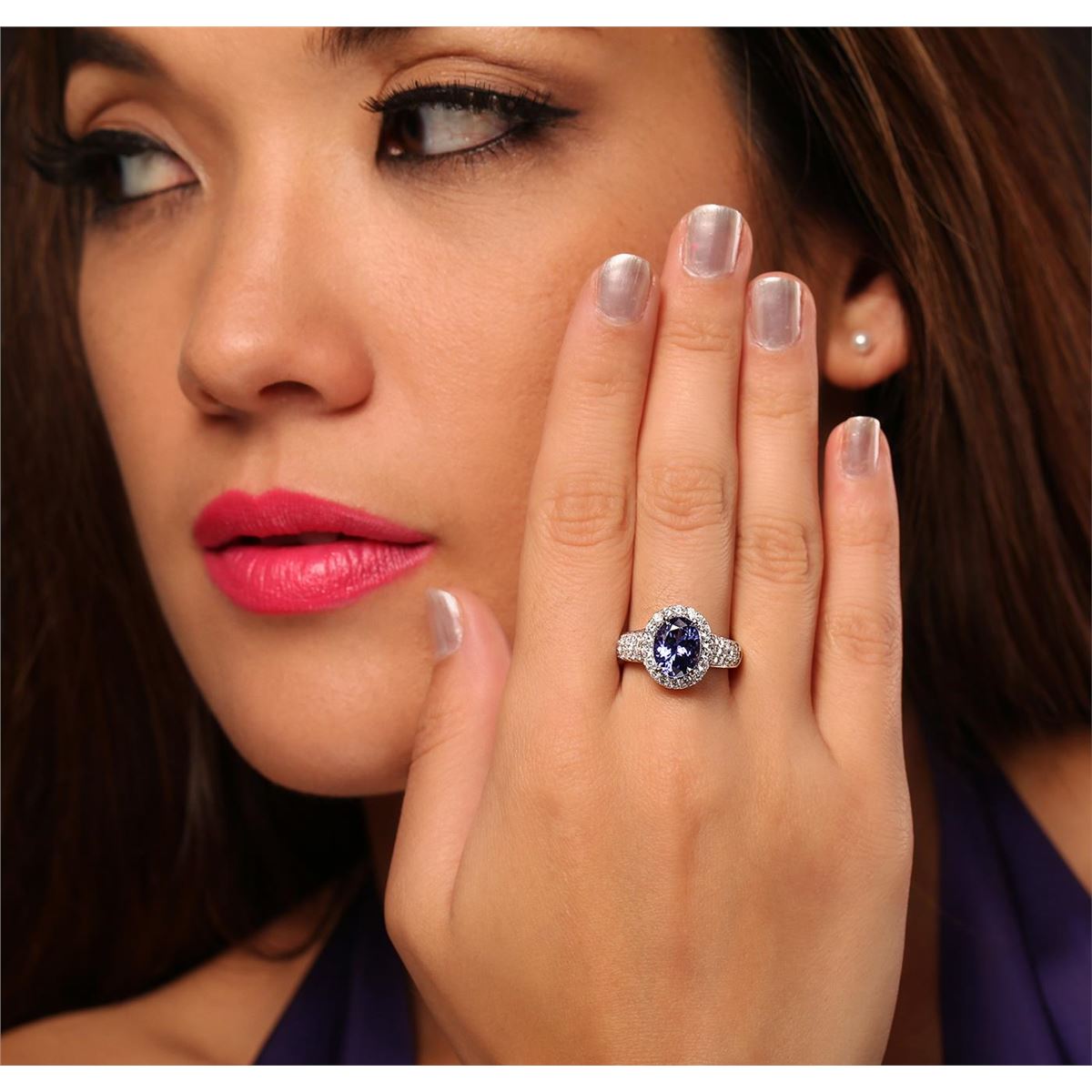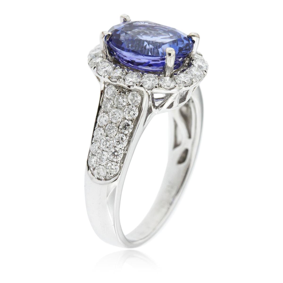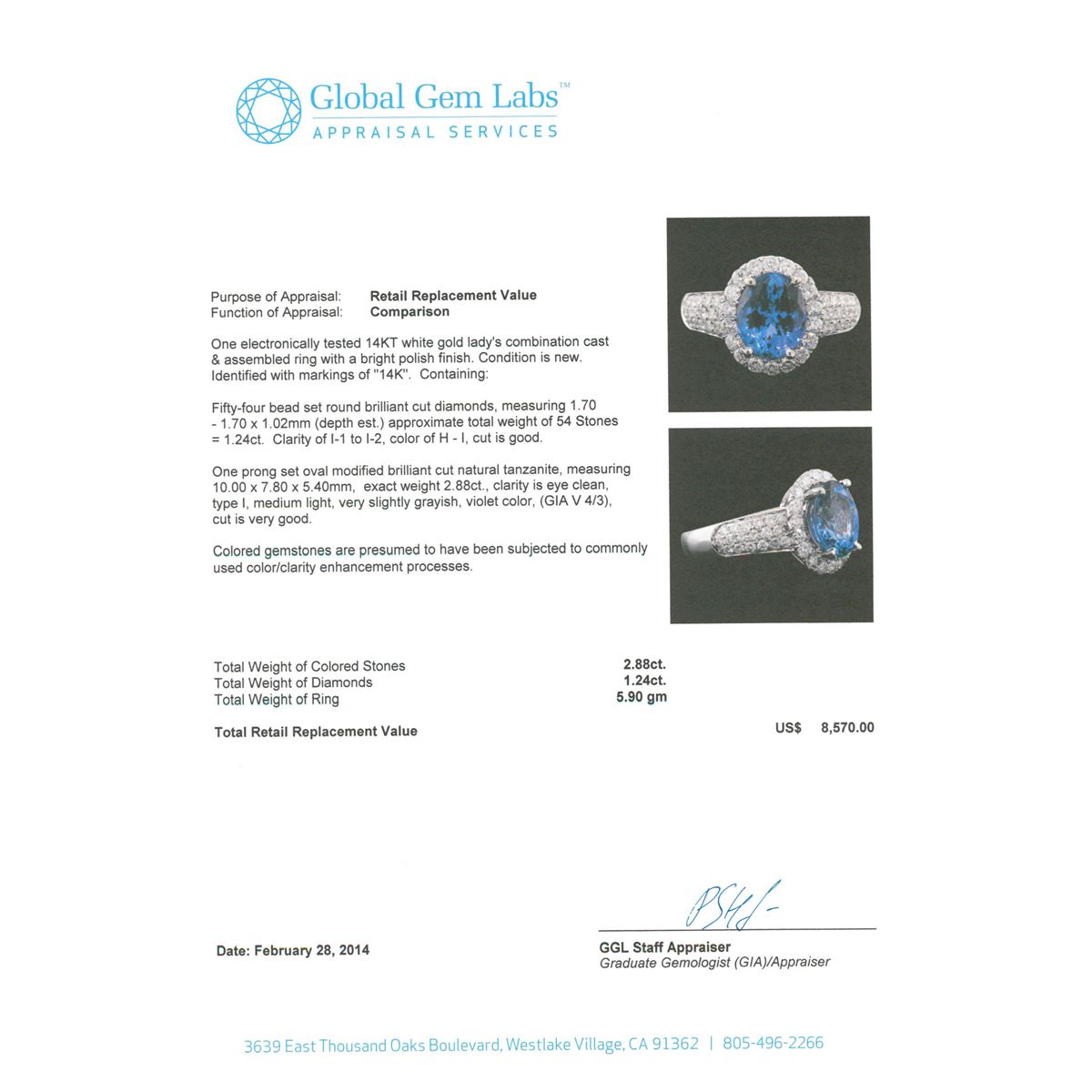 One electronically tested 14KT white gold Ladies combination cast & assembled ring with a bright polish finish. Condition is new. Identified with markings of "14K". Containing: Fifty-Four bead set round brilliant cut diamonds, measuring 1.70 - 1.70 x 1.02mm (depth est.) approximate. Total Weight of 54 Stones = 1.24ct. Clarity: I-1 to I-2. Color: H - I, Cut is Good. One prong set oval modified brilliant cut natural tanzanite, measuring 10.00 x 7.80 x 5.40mm, exact weight 2.88ct., clarity is eye clean, type I, medium light, very slightly grayish, violet color, (GIA V 4/3), cut is very good. Colored gemstones are presumed to have been subjected to commonly used color/clarity enhancement processes. Total Weight of Colored Stones 2.88ct. Total Weight of Diamonds 1.24ct. Total Weight of Ring 5.90 grams. GGL Appraised at $8,570.00.