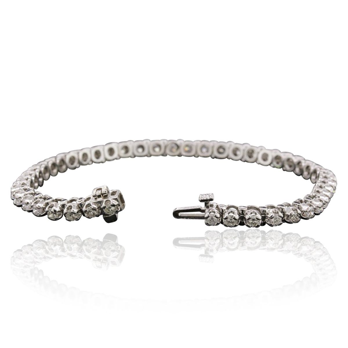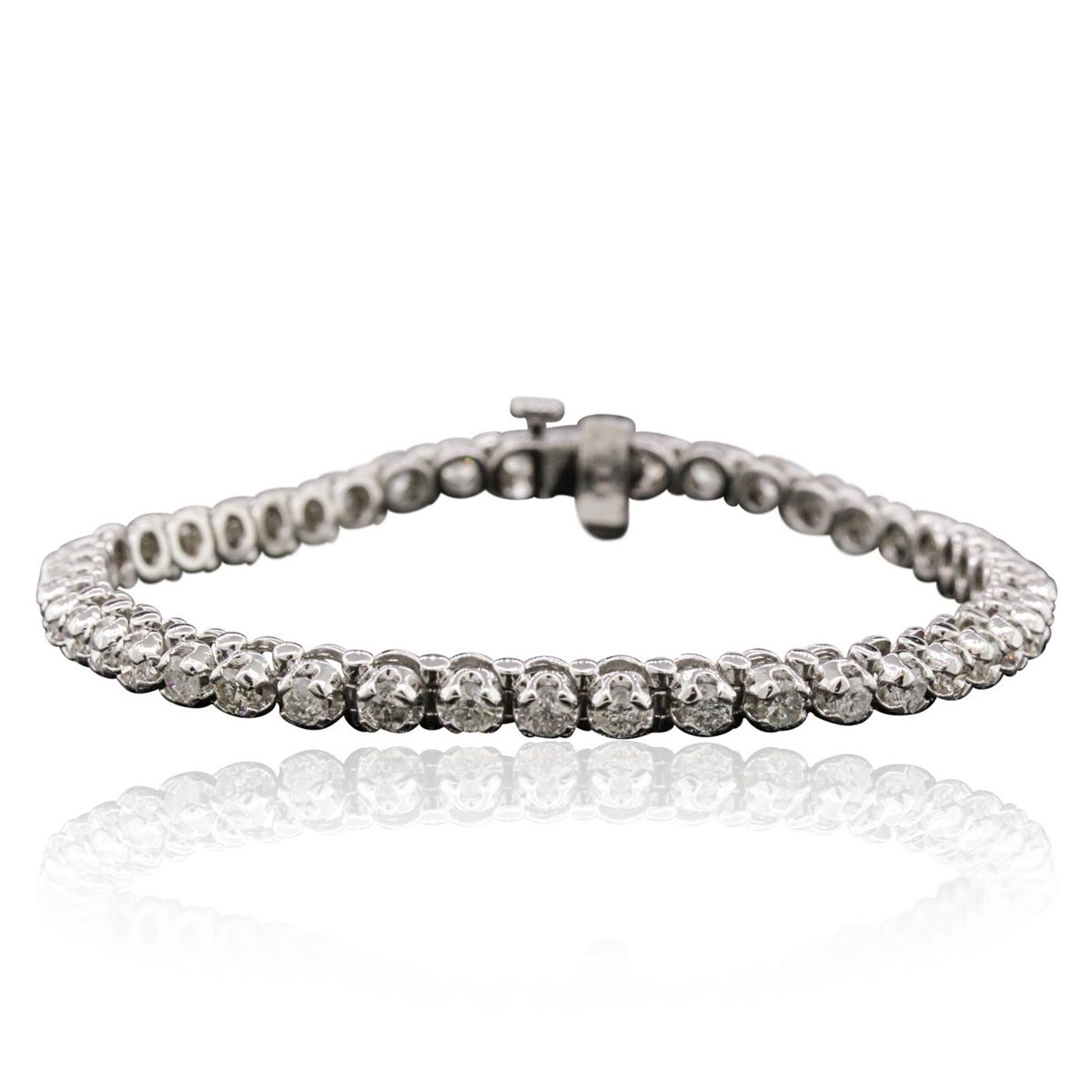 One electronically tested 14KT white gold ladies combination cast & assembled tennis bracelet with a hidden box clasp with a bright polish finish. Condition is new. Measurements: 7" in length. Identified with markings of "14K". Containing: Forty-Five prong set round brilliant cut diamonds, measuring 2.60 - 2.60 x 1.56mm (depth est.) approximate total weight of 45 Stones = 2.89ct. Clarity: SI-2 to I-2. Color: I - J, Cut is Good. All diamonds are graded in the mounting, unless otherwise stated. Total Weight of Diamonds 2.89ct. Total Weight of Bracelet 13.20 grams. GGL Appraised at $14,260.00.