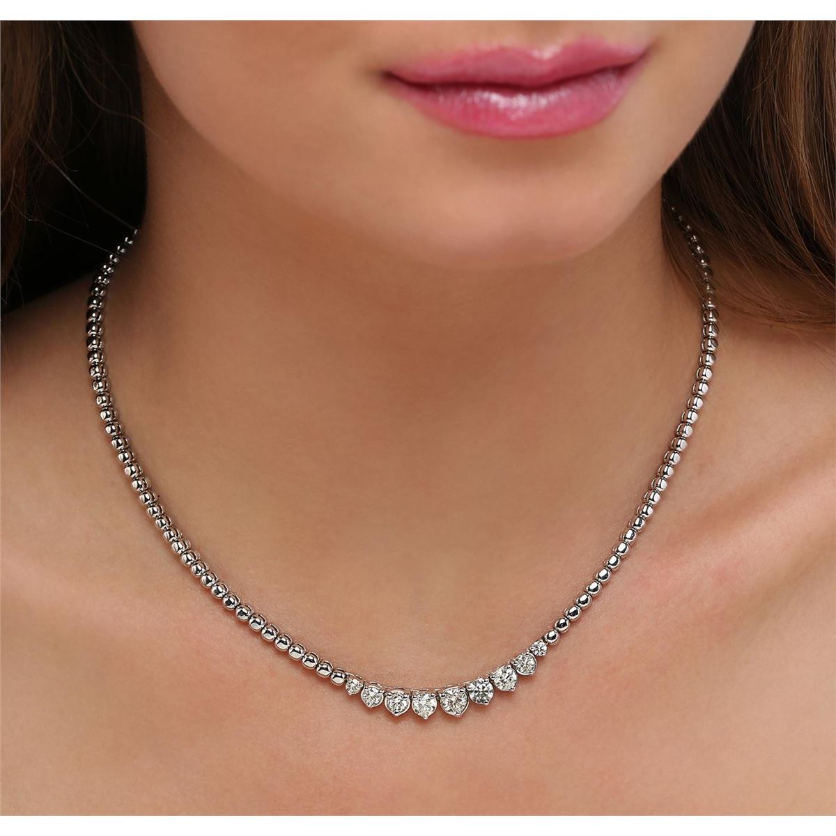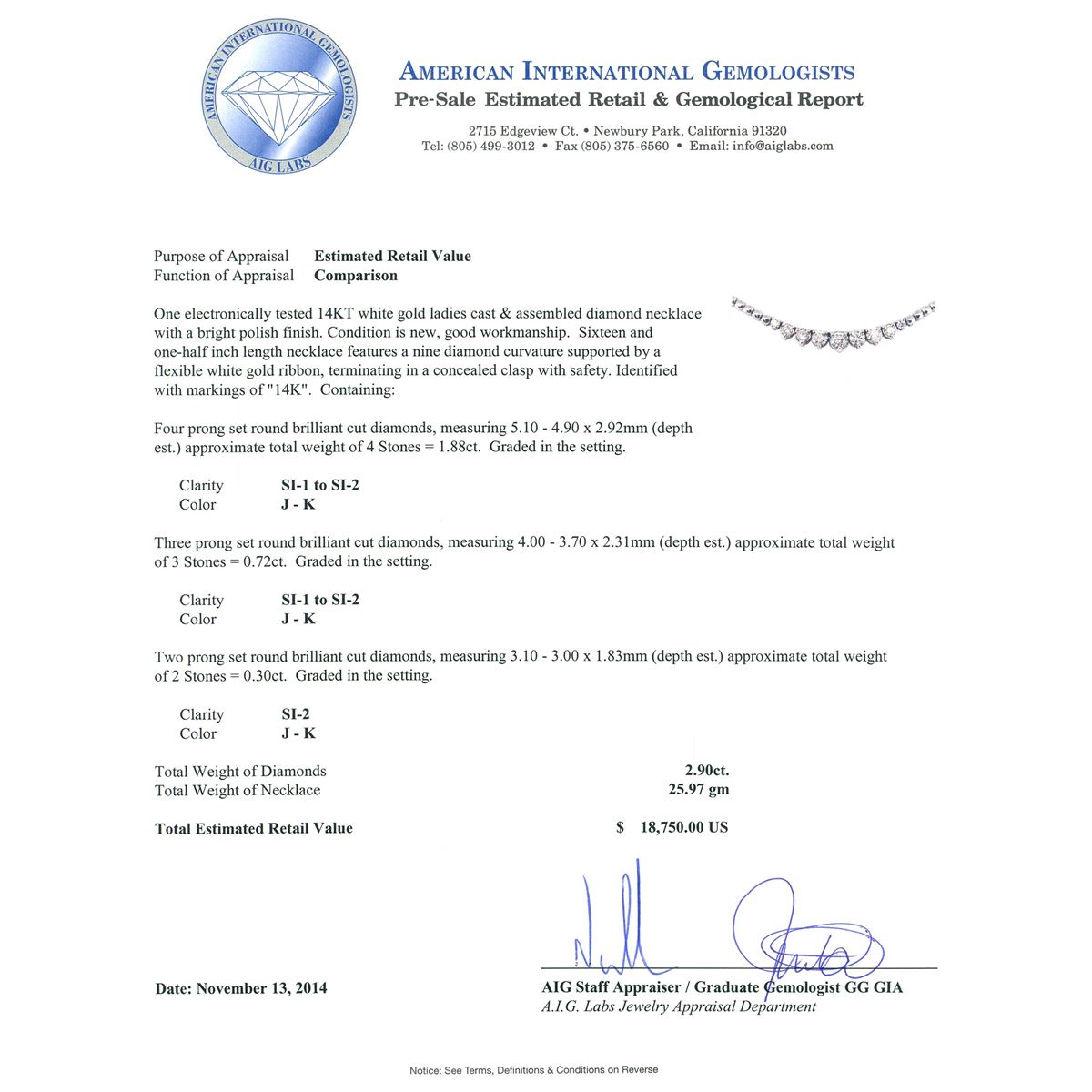 One electronically tested 14KT white gold ladies cast & assembled diamond necklace with a bright polish finish. Sixteen and one-half inch length necklace features a nine diamond curvature supported by a flexible white gold ribbon, terminating in a concealed clasp with safety. Identified with markings of "14K". Condition is new, good workmanship. Containing: Four prong set round brilliant cut diamonds, measuring 5.10 - 4.90 x 2.92mm (depth est.) approximate total weight of 4 Stones = 1.88ct. Graded in the setting. Clarity: SI-1 to SI-2. Color: J - K Three prong set round brilliant cut diamonds, measuring 4.00 - 3.70 x 2.31mm (depth est.) approximate total weight of 3 Stones = 0.72ct. Graded in the setting. Clarity: SI-1 to SI-2. Color: J - K Two prong set round brilliant cut diamonds, measuring 3.10 - 3.00 x 1.83mm (depth est.) approximate total weight of 2 Stones = 0.30ct. Graded in the setting. Clarity: SI-2. Color: J - K. Total Weight of Diamonds 2.90ct. Total Weight of Necklace 25.97 grams. AIG Appraised at $18,750.00.