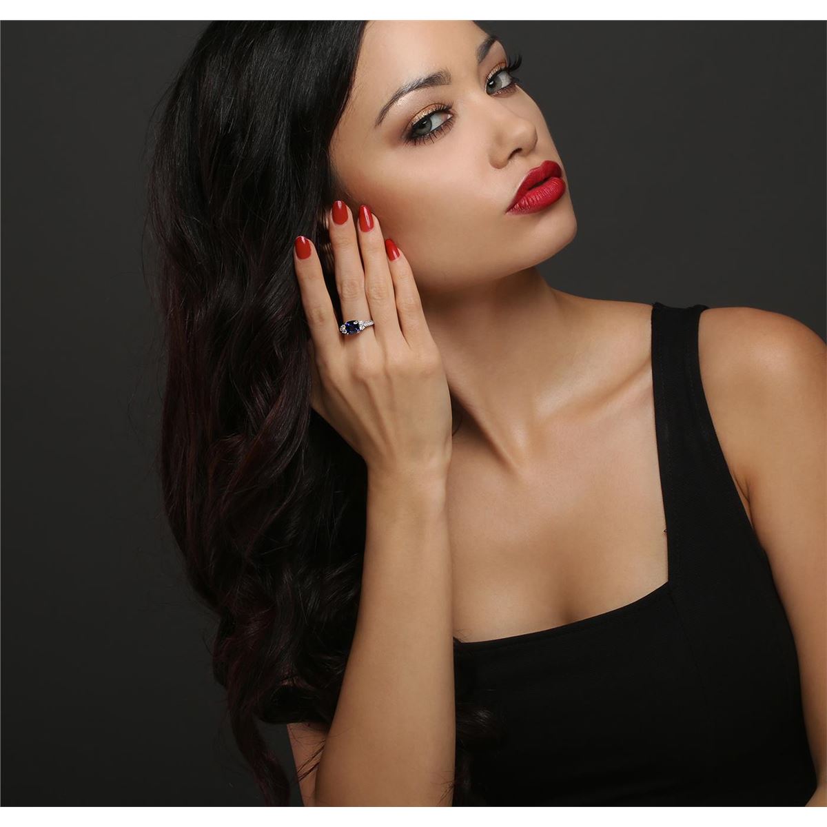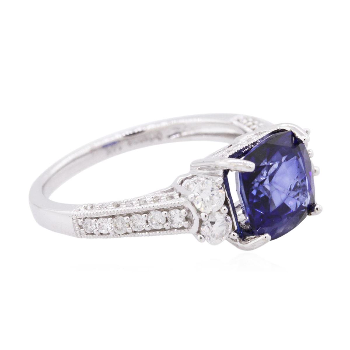 One electronically tested 14KT white gold ladies cast sapphire and diamond ring. The featured sapphire is set within a diamond accented basket supported by diamond set shoulders, completed by a one and one-half millimeter wide band. Bright polish finish with milgrain detailing throughout. Trademark is Orianne. Identified with markings of "14K". Condition is new, good workmanship. Containing: One prong set square cushion brilliant cut natural blue sapphire, measuring 7.85 x 7.80 x 4.80mm, 5% bulge factor, approximate weight of 2.90ct., clarity is slightly included, type II, dark, very slightly grayish, blue color, (GIA B 7/3), cut is good. Transmitting light with a minimum of distortion, transparent. Naturally occurring internal & external characteristics are present. Indications of laboratory high temperature diffusion treatment. Graded in the setting. Four prong set round brilliant cut diamonds, measuring 2.70 - 2.60 x 1.59mm (depth est.) approximate total weight of 4 Stones = 0.30ct. Graded in the setting. Clarity: SI-2 to I-1. Color: G - H Fifty-Two prong set round brilliant cut diamonds, measuring 1.50 - 1.10 x 0.78mm (depth est.) approximate total weight of 52 Stones = 0.51ct. Graded in the setting. Clarity: SI-1 to I-1. Color: G - I. Total Weight of Colored Stones 2.90ct. Total Weight of Diamonds 0.81ct. Total Weight of Ring 4.20 grams. AIG Appraised at $5,200.00.
