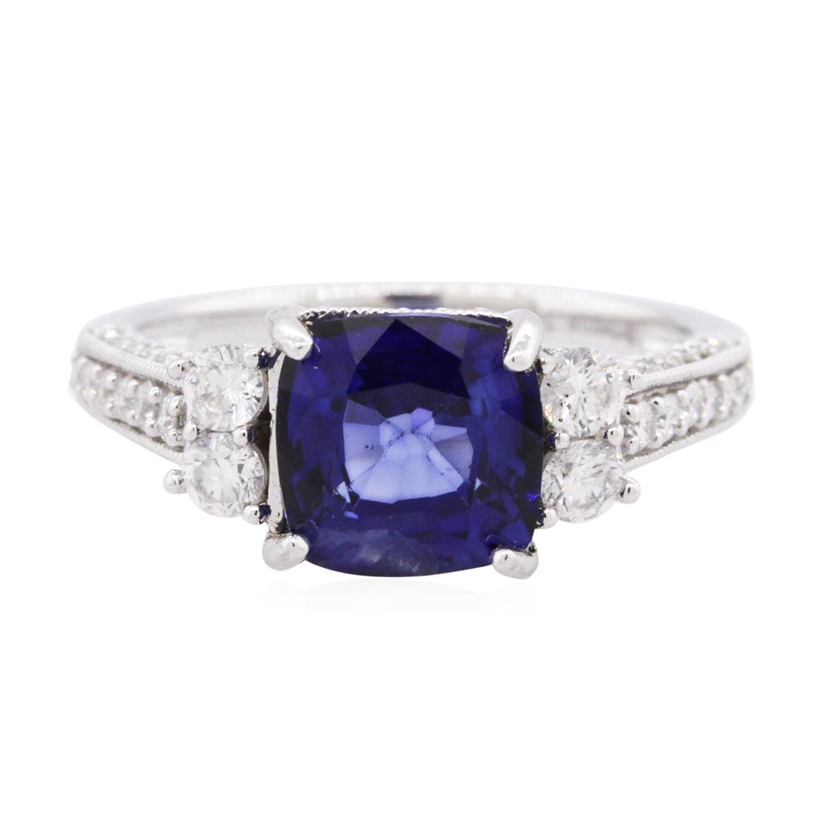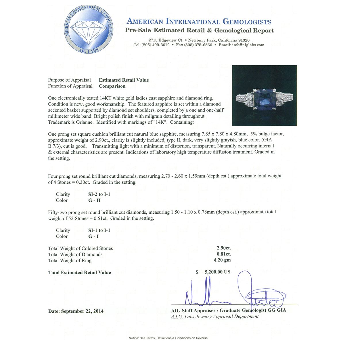 One electronically tested 14KT white gold ladies cast sapphire and diamond ring. The featured sapphire is set within a diamond accented basket supported by diamond set shoulders, completed by a one and one-half millimeter wide band. Bright polish finish with milgrain detailing throughout. Trademark is Orianne. Identified with markings of "14K". Condition is new, good workmanship. Containing: One prong set square cushion brilliant cut natural blue sapphire, measuring 7.85 x 7.80 x 4.80mm, 5% bulge factor, approximate weight of 2.90ct., clarity is slightly included, type II, dark, very slightly grayish, blue color, (GIA B 7/3), cut is good. Transmitting light with a minimum of distortion, transparent. Naturally occurring internal & external characteristics are present. Indications of laboratory high temperature diffusion treatment. Graded in the setting. Four prong set round brilliant cut diamonds, measuring 2.70 - 2.60 x 1.59mm (depth est.) approximate total weight of 4 Stones = 0.30ct. Graded in the setting. Clarity: SI-2 to I-1. Color: G - H Fifty-Two prong set round brilliant cut diamonds, measuring 1.50 - 1.10 x 0.78mm (depth est.) approximate total weight of 52 Stones = 0.51ct. Graded in the setting. Clarity: SI-1 to I-1. Color: G - I. Total Weight of Colored Stones 2.90ct. Total Weight of Diamonds 0.81ct. Total Weight of Ring 4.20 grams. AIG Appraised at $5,200.00.