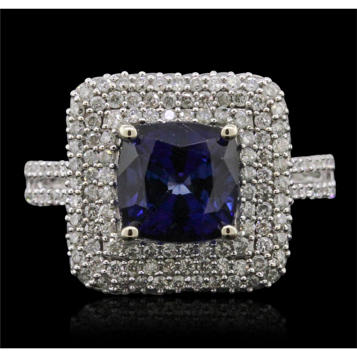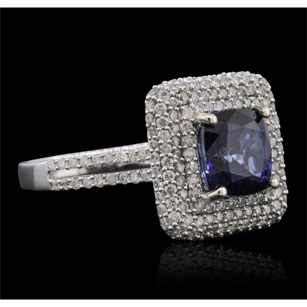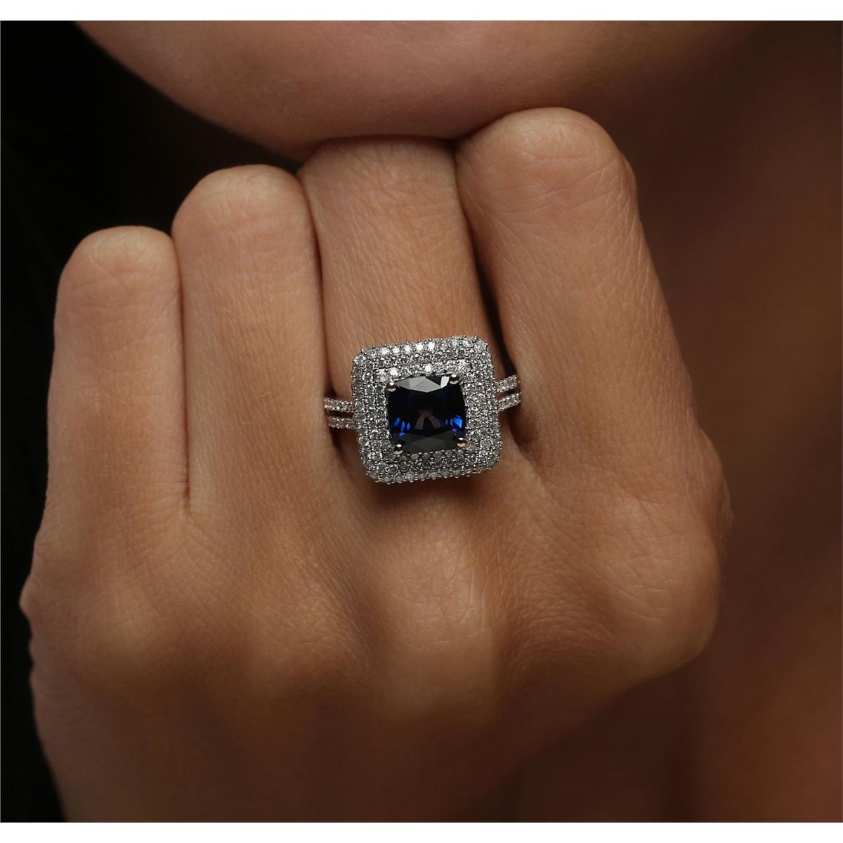 One electronically tested 14KT white gold ladies combination cast & assembled sapphire and diamond ring with a split shank with a bright polish finish. Identified with markings of "14K". Condition is new. Containing: One prong set square cushion modified brilliant cut natural blue sapphire, measuring 7.71 x 7.76 x 5.15mm, approximate weight of 2.90ct., clarity is eye clean, type II, medium dark, moderately strong, blue color, (GIA B 6/4), cut is very good. One Hundred Forty prong set round brilliant cut diamonds, measuring 1.10 - 1.10 x 0.66mm (depth est.) approximate total weight of 140 Stones = 0.67ct. Clarity: I-1 to I-2. Color: I - J, Cut is Good. Colored gemstones are presumed to have been subjected to commonly used enhancement processes. All diamonds and colored gemstones are graded in the mounting, unless otherwise stated. Total Weight of Colored Stones 2.90ct. Total Weight of Diamonds 0.67ct. Total Weight of Ring 5.10 grams. GGL Appraised at $8,080.00.