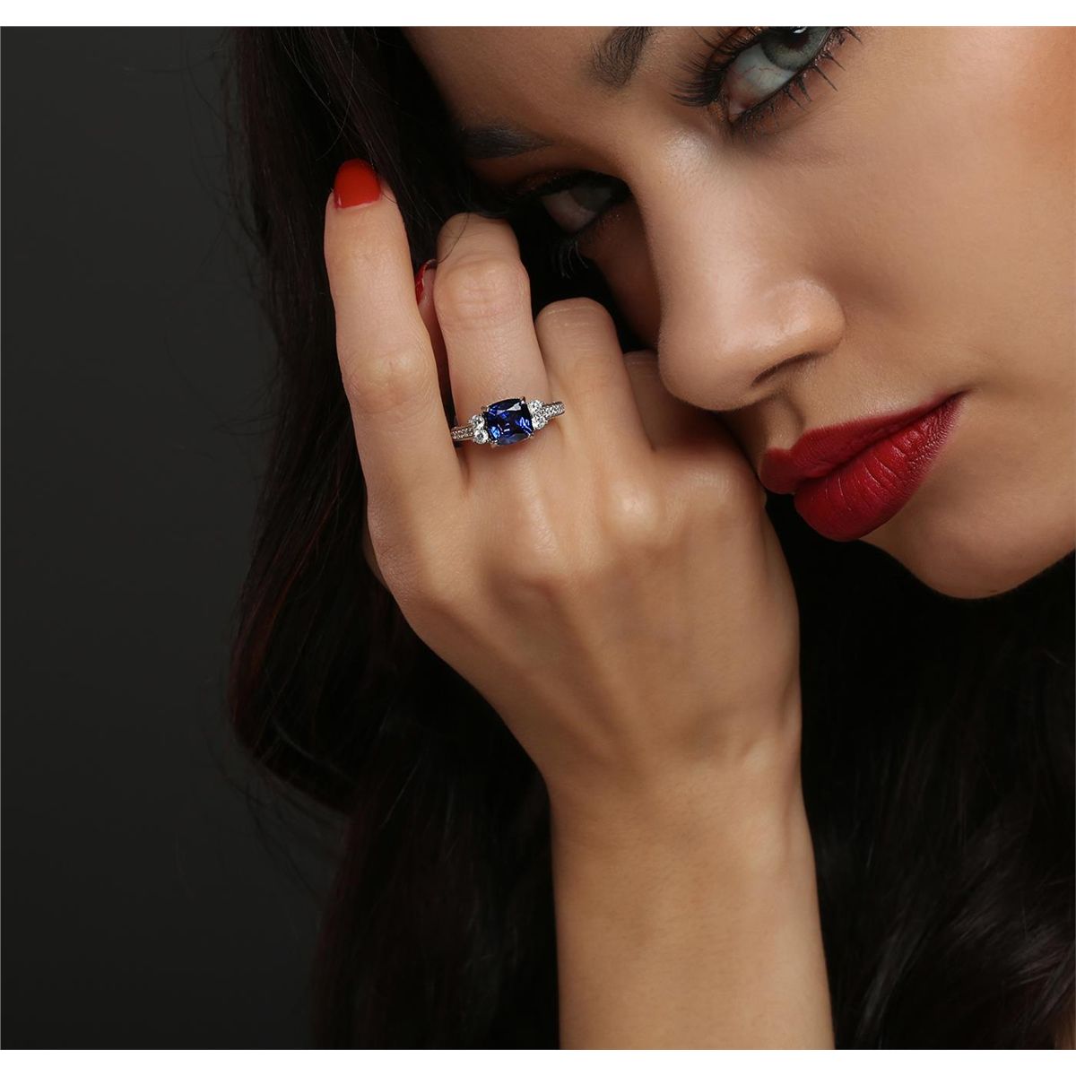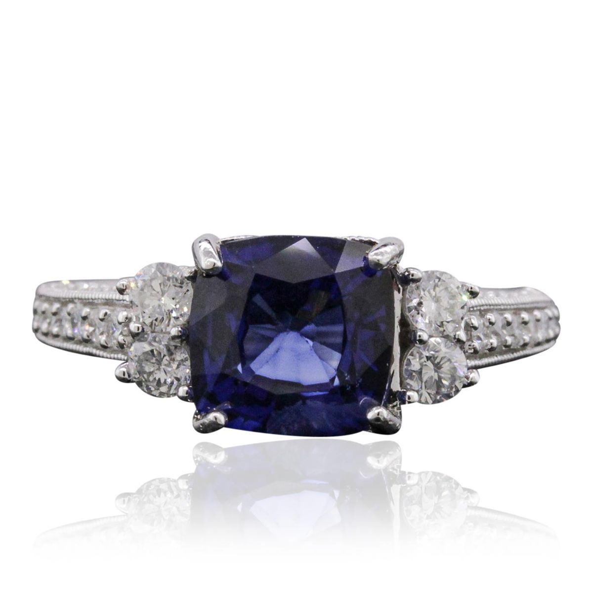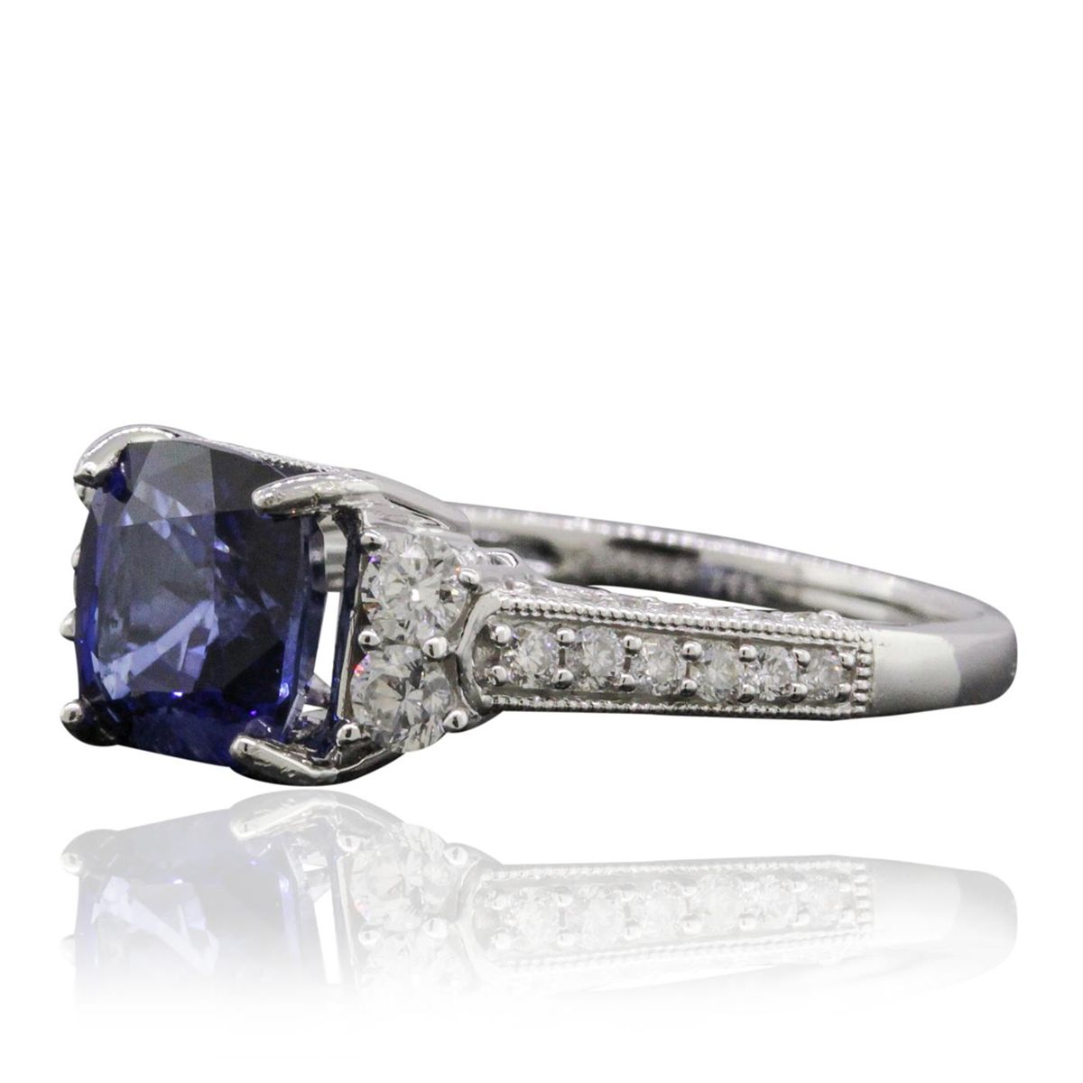 One electronically tested 14KT white gold ladies cast sapphire and diamond ring. The featured sapphire is set within a diamond accented basket supported by diamond set shoulders, completed by a one and one-half millimeter wide band. Bright polish finish with milgrain detailing throughout. Trademark is Orianne. Identified with markings of "14K". Condition is new, good workmanship. Containing: One prong set square cushion brilliant cut natural blue sapphire, measuring 7.85 x 7.80 x 4.80mm, 5% bulge factor, approximate weight of 2.90ct., clarity is slightly included, type II, dark, very slightly grayish, blue color, (GIA B 7/3), cut is good. Transmitting light with a minimum of distortion, transparent. Naturally occurring internal & external characteristics are present. Indications of laboratory high temperature diffusion treatment. Graded in the setting. Four prong set round brilliant cut diamonds, measuring 2.70 - 2.60 x 1.59mm (depth est.) approximate total weight of 4 Stones = 0.30ct. Graded in the setting. Clarity: SI-2 to I-1. Color: G - H Fifty-Two prong set round brilliant cut diamonds, measuring 1.50 - 1.10 x 0.78mm (depth est.) approximate total weight of 52 Stones = 0.51ct. Graded in the setting. Clarity: SI-1 to I-1. Color: G - I. Total Weight of Colored Stones 2.90ct. Total Weight of Diamonds 0.81ct. Total Weight of Ring 4.20 grams. AIG Appraised at $5,200.00.