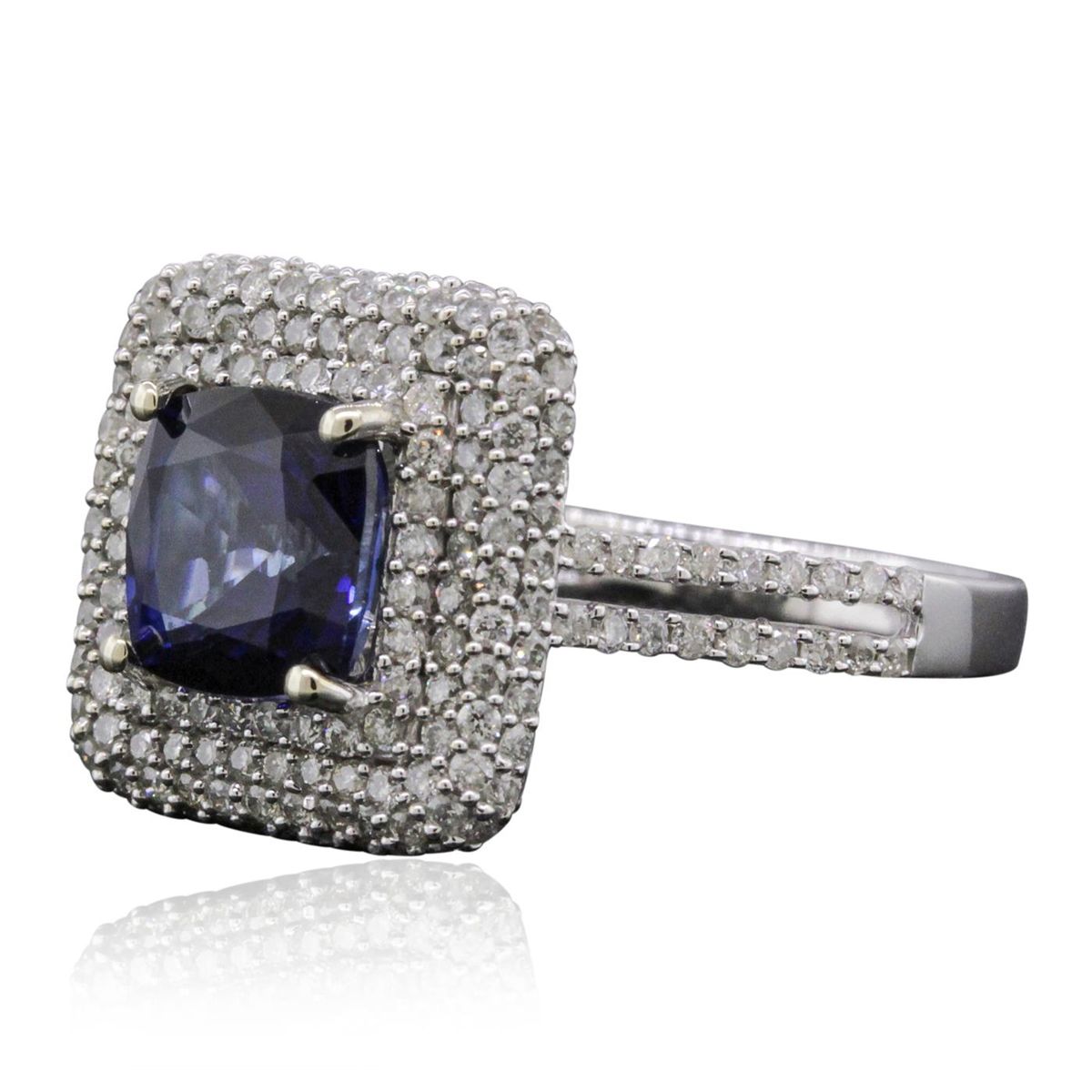 One electronically tested 14KT white gold ladies combination cast & assembled sapphire and diamond ring with a split shank with a bright polish finish. Identified with markings of "14K". Condition is new. Containing: One prong set square cushion modified brilliant cut natural blue sapphire, measuring 7.71 x 7.76 x 5.15mm, approximate weight of 2.90ct., clarity is eye clean, type II, medium dark, moderately strong, blue color, (GIA B 6/4), cut is very good. One Hundred Forty prong set round brilliant cut diamonds, measuring 1.10 - 1.10 x 0.66mm (depth est.) approximate total weight of 140 Stones = 0.67ct. Clarity: I-1 to I-2. Color: I - J, Cut is Good. Colored gemstones are presumed to have been subjected to commonly used enhancement processes. All diamonds and colored gemstones are graded in the mounting, unless otherwise stated. Total Weight of Colored Stones 2.90ct. Total Weight of Diamonds 0.67ct. Total Weight of Ring 5.10 grams. GGL Appraised at $8,080.00.