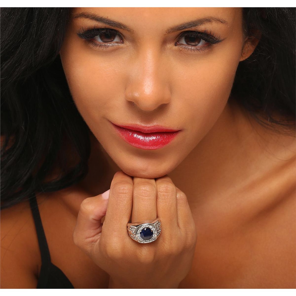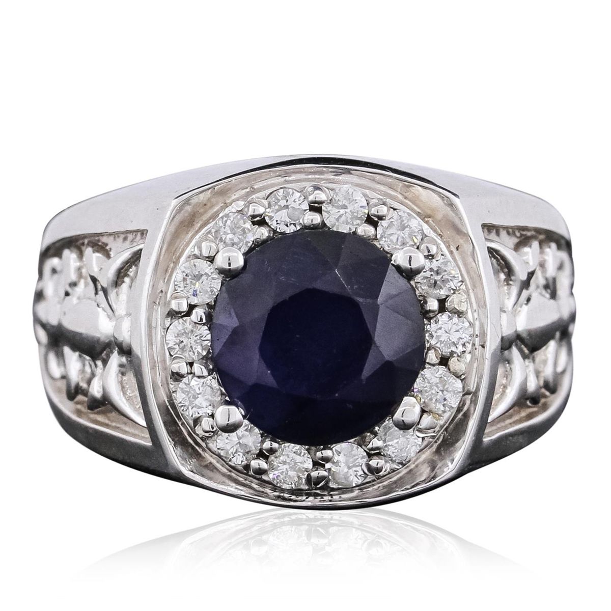 One electronically tested 14KT white gold gents cast sapphire and diamond ring with a bright polish finish. The featured sapphire is set within a diamond bezel supported by tapering fleur-de-lis accented shoulders, completed by a four millimeter wide band. Condition is new, good workmanship. Containing: One prong set round brilliant cut natural blue sapphire, measuring 9.30 - 9.25 x 3.95 mm, 6% bulge factor, approximate weight of 2.90ct., clarity is heavily included, type II, dark, very slightly grayish, violetish blue color, (GIA vB 7/3), cut is good. Transmitting light somewhat diffusely, translucent. Naturally occurring internal & external characteristics are present. Indications of multiple laboratory enhancements, including high temperature diffusion treatment. Graded in the setting. Fourteen prong set round brilliant cut diamonds, measuring 2.10 - 2.00 x 1.23mm (depth est.) approximate total weight of 14 Stones = 0.54ct. Graded in the setting. Clarity: I-1 to I-2 . Color: H - J. Total Weight of Colored Stones 2.90ct.. Total Weight of Diamonds 0.54ct.. Total Weight of Ring 15.92 grams. AIG Appraised at $4,745.00.