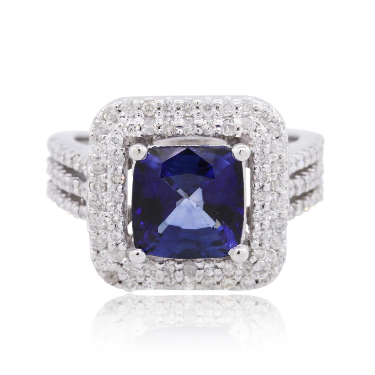 One electronically tested 14KT white gold ladies combination cast & assembled sapphire and diamond ring with a bright polish finish. Identified with markings of "14K". Condition is new. Containing: One prong set square cushion modified brilliant cut natural blue sapphire, measuring 7.80 x 7.80 x 5.07mm, approximate weight of 2.90ct., clarity is eye clean, type II, medium, moderately strong, blue color, (GIA B 5/4), cut is very good. One Hundred Four prong set round brilliant cut diamonds, measuring 1.20 - 1.20 x 0.72mm (depth est.) approximate total weight of 104 Stones = 0.66ct. Clarity: I-1 to I-2. Color: I - J, Cut is Good. Colored gemstones are presumed to have been subjected to commonly used enhancement processes. All diamonds and colored gemstones are graded in the mounting, unless otherwise stated. Total Weight of Colored Stones 2.90ct. Total Weight of Diamonds 0.66ct. Total Weight of Ring 6.90 grams. GGL Appraised at $5,915.00.