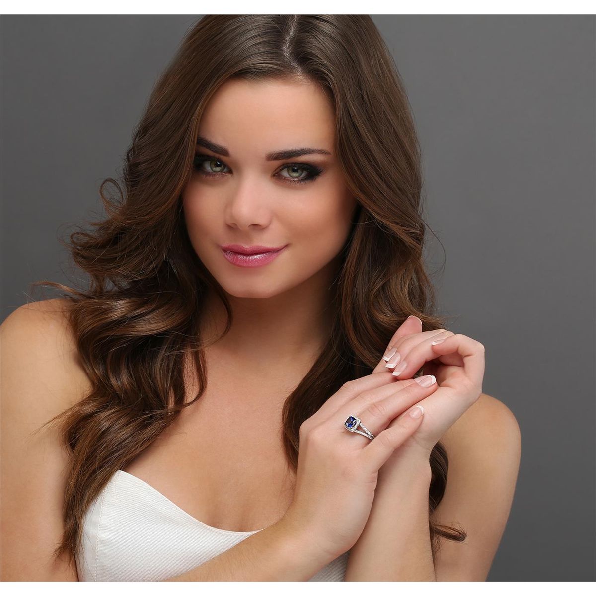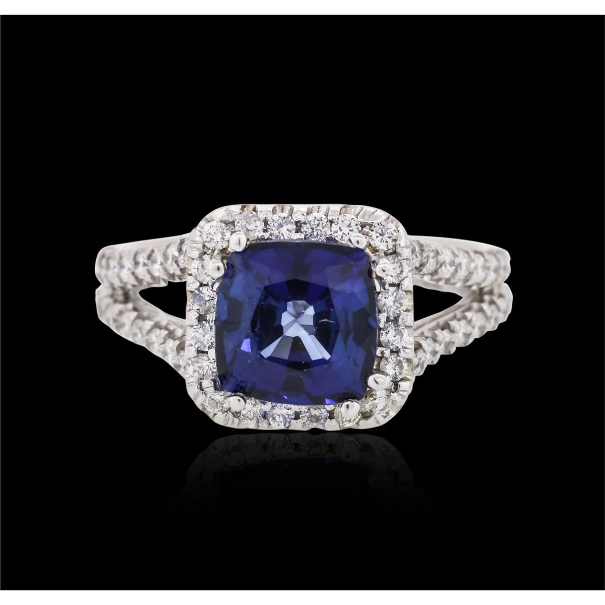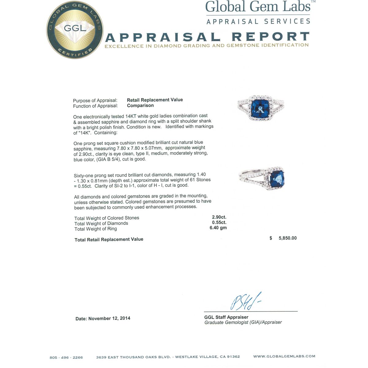 One electronically tested 14KT white gold ladies combination cast & assembled sapphire and diamond ring with a split shoulder shank with a bright polish finish. Identified with markings of "14K". Condition is new. Containing: One prong set square cushion modified brilliant cut natural blue sapphire, measuring 7.80 x 7.80 x 5.07mm, approximate weight of 2.90ct., clarity is eye clean, type II, medium, moderately strong, blue color, (GIA B 5/4), cut is good. Sixty-One prong set round brilliant cut diamonds, measuring 1.40 - 1.30 x 0.81mm (depth est.) approximate total weight of 61 Stones = 0.55ct. Clarity: SI-2 to I-1. Color: H - I, Cut is Good. All diamonds and colored gemstones are graded in the mounting, unless otherwise stated. Colored gemstones are presumed to have been subjected to commonly used enhancement processes. Total Weight of Colored Stones 2.90ct. Total Weight of Diamonds 0.55ct. Total Weight of Ring 6.40 grams. GGL Appraised at $5,850.00.