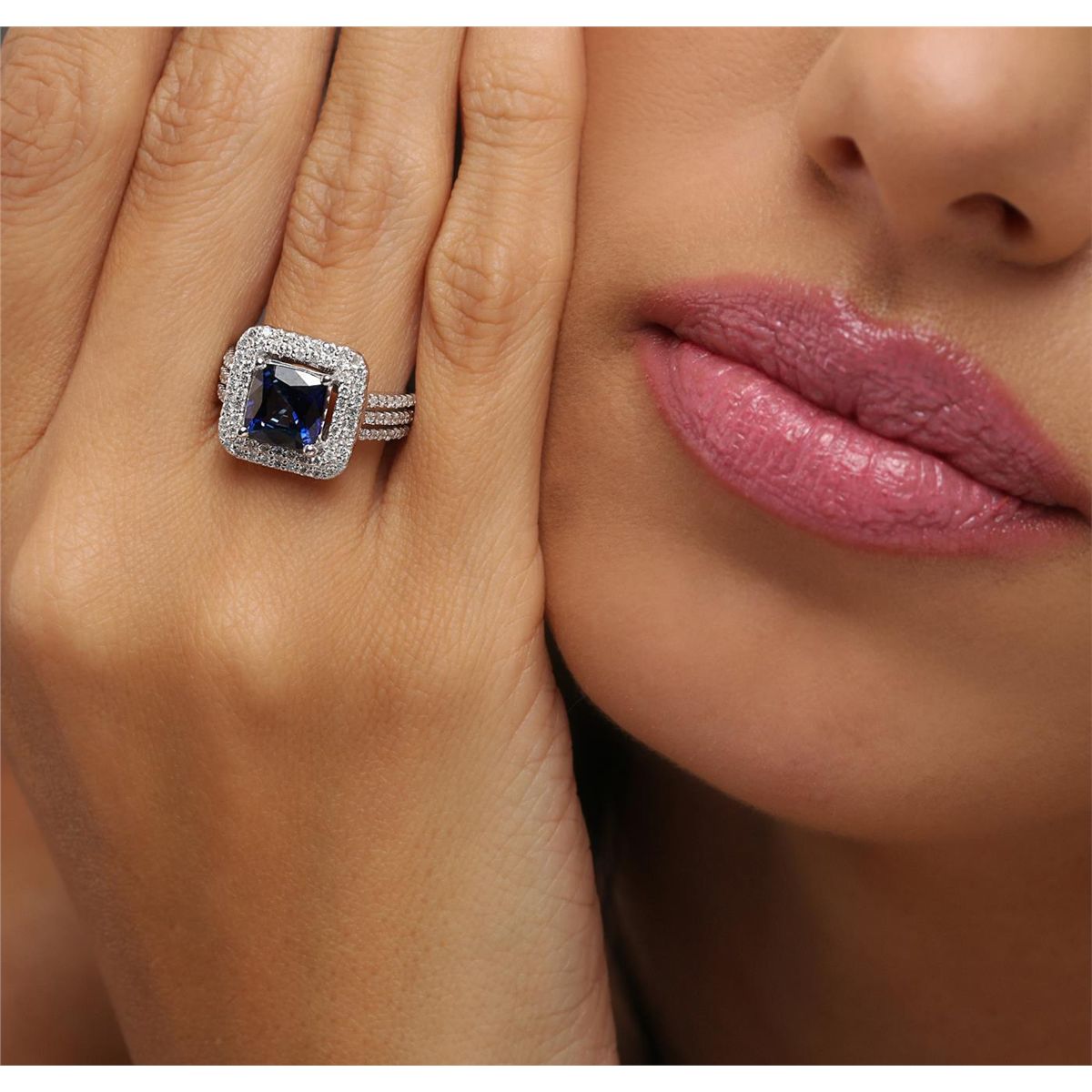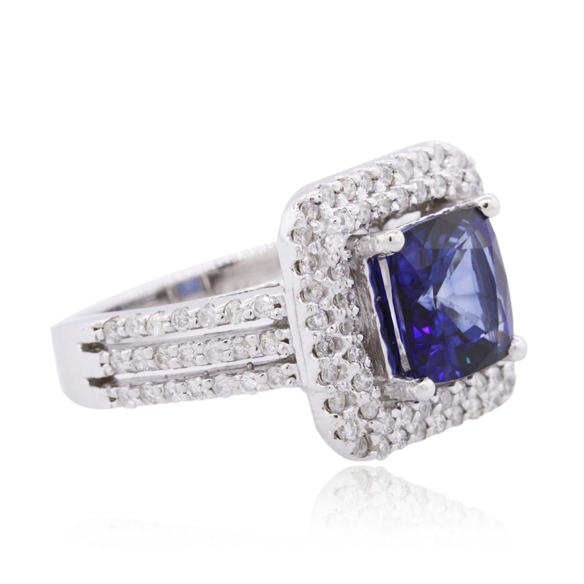 One electronically tested 14KT white gold ladies combination cast & assembled sapphire and diamond ring with a bright polish finish. Identified with markings of "14K". Condition is new. Containing: One prong set square cushion modified brilliant cut natural blue sapphire, measuring 7.80 x 7.80 x 5.07mm, approximate weight of 2.90ct., clarity is eye clean, type II, medium, moderately strong, blue color, (GIA B 5/4), cut is very good. One Hundred Four prong set round brilliant cut diamonds, measuring 1.20 - 1.20 x 0.72mm (depth est.) approximate total weight of 104 Stones = 0.66ct. Clarity: I-1 to I-2. Color: I - J, Cut is Good. Colored gemstones are presumed to have been subjected to commonly used enhancement processes. All diamonds and colored gemstones are graded in the mounting, unless otherwise stated. Total Weight of Colored Stones 2.90ct. Total Weight of Diamonds 0.66ct. Total Weight of Ring 6.90 grams. GGL Appraised at $5,915.00.