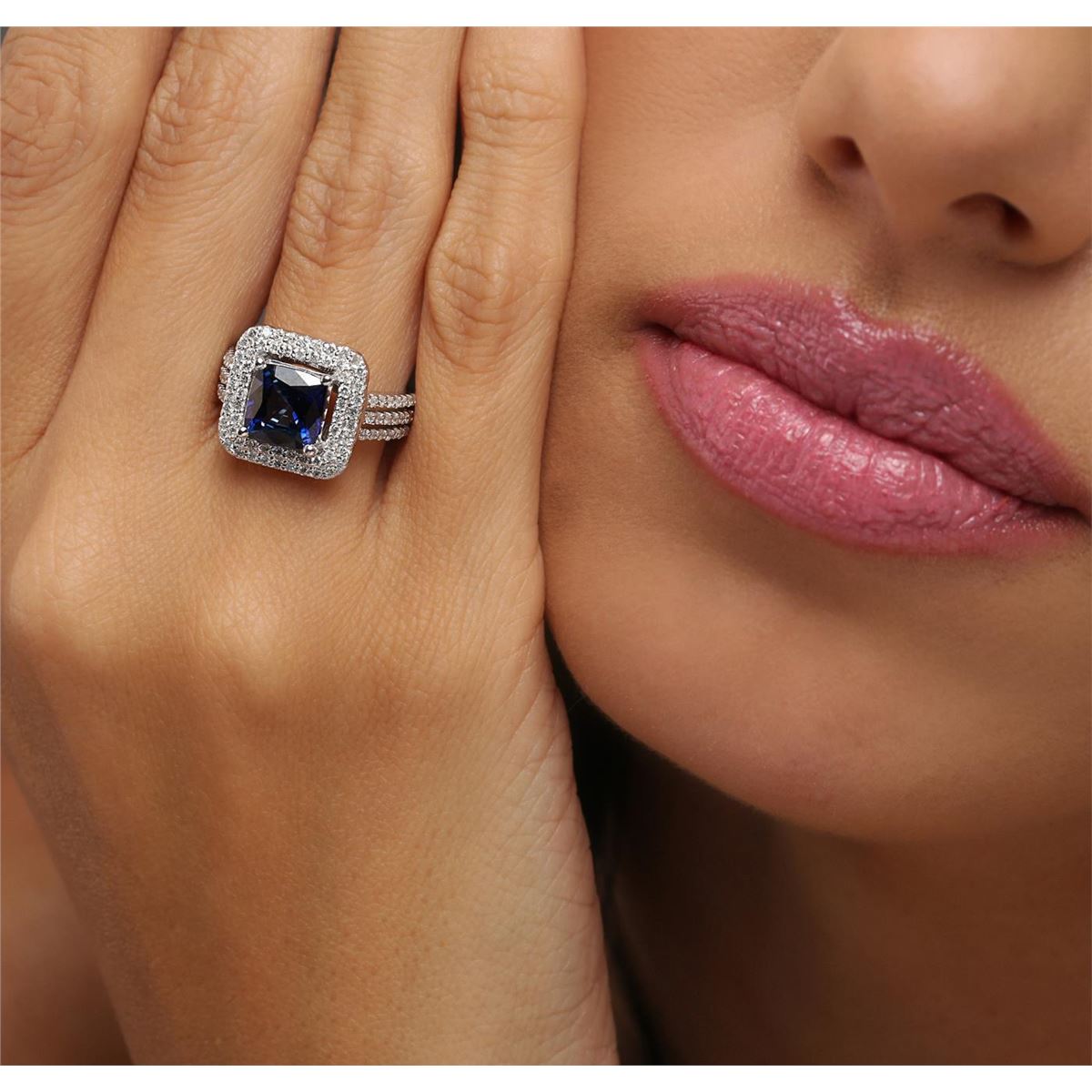 One electronically tested 14KT white gold ladies combination cast & assembled sapphire and diamond ring with a bright polish finish. Identified with markings of "14K". Condition is new. Containing: One prong set square cushion modified brilliant cut natural blue sapphire, measuring 7.80 x 7.80 x 5.07mm, approximate weight of 2.90ct., clarity is eye clean, type II, medium, moderately strong, blue color, (GIA B 5/4), cut is very good. One Hundred Four prong set round brilliant cut diamonds, measuring 1.20 - 1.20 x 0.72mm (depth est.) approximate total weight of 104 Stones = 0.66ct. Clarity: I-1 to I-2. Color: I - J, Cut is Good. Colored gemstones are presumed to have been subjected to commonly used enhancement processes. All diamonds and colored gemstones are graded in the mounting, unless otherwise stated. Total Weight of Colored Stones 2.90ct. Total Weight of Diamonds 0.66ct. Total Weight of Ring 6.90 grams. GGL Appraised at $5,915.00.