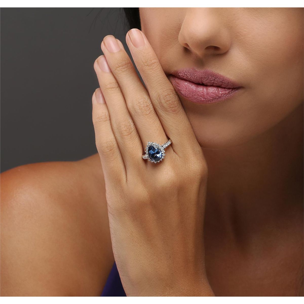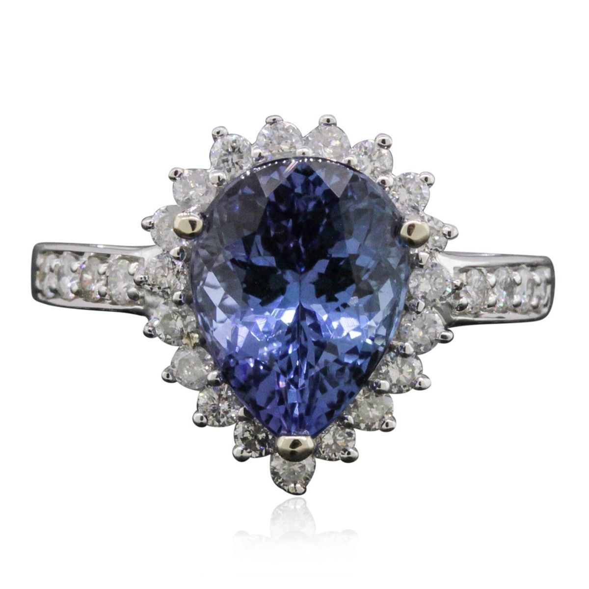 One electronically tested 14KT white gold ladies combination cast & assembled tanzanite and diamond ring with a flat shank with a bright polish finish. Identified with markings of "14K". Condition is new. Containing: One prong set pear modified brilliant cut natural tanzanite, measuring 10.00 x 8.16 x 5.30mm, approximate weight of 2.90ct., clarity is eye clean, type I, medium, very slightly grayish, violet color, (GIA V 5/3), cut is good. Twenty-Seven prong set round brilliant cut diamonds, measuring 1.70 - 1.50 x 0.96mm (depth est.) approximate total weight of 27 Stones = 0.40ct. Clarity: I-1 to I-2. Color: I - J, Cut is Good. Colored gemstones are presumed to have been subjected to commonly used enhancement processes. All diamonds and colored gemstones are graded in the mounting, unless otherwise stated. Total Weight of Colored Stones 2.90ct. Total Weight of Diamonds 0.40ct. Total Weight of Ring 3.60 grams. GGL Appraised at $6,525.00.