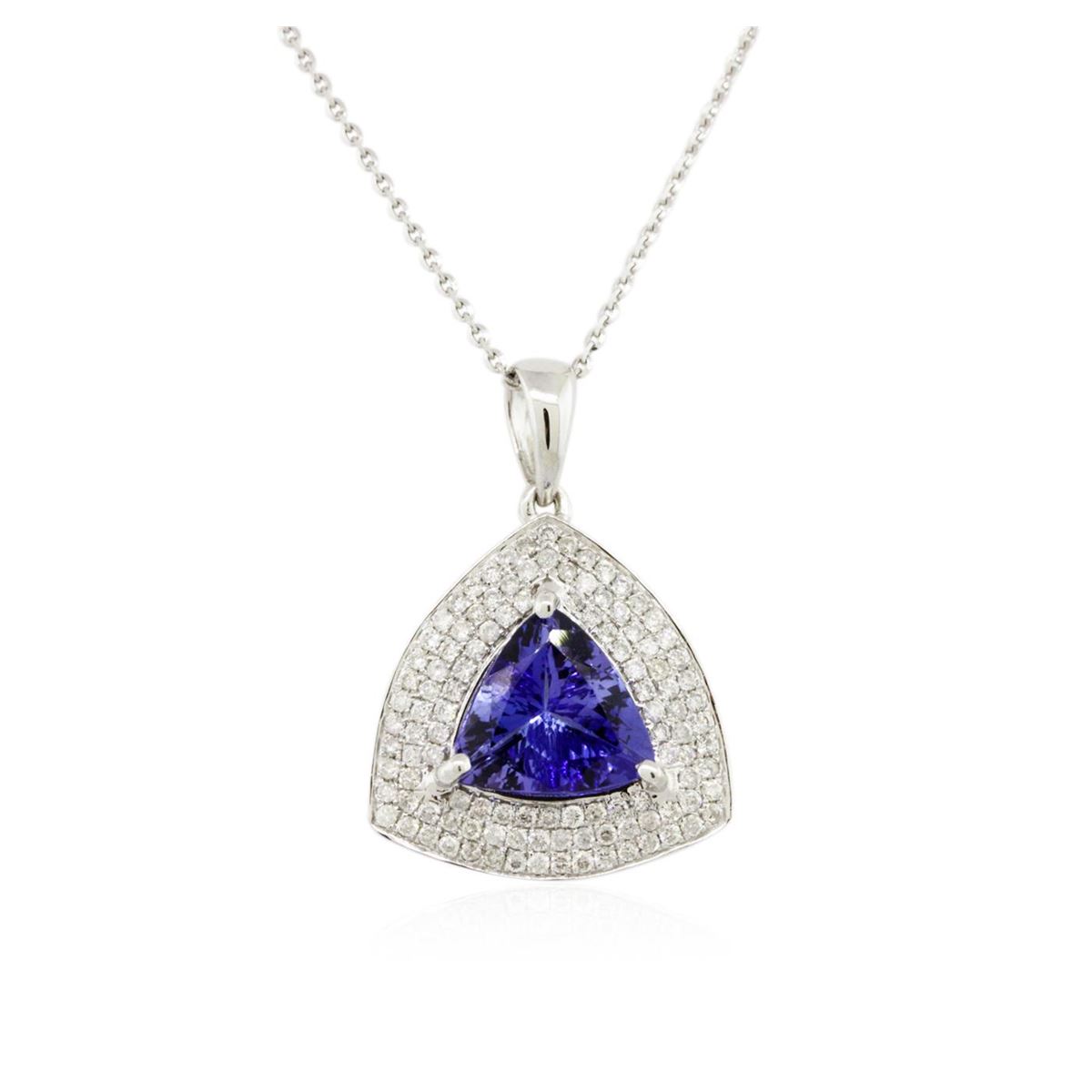 One electronically tested 14KT white gold ladies cast & assembled tanzanite and diamond pendant with chain. Condition is new, good workmanship. The pendant features a tanzanite is set within a diamond lattice gallery, completed by a white gold bail. The pendant is supported by an eighteen inch length 14KT white gold designer style chain, terminating in a spring ring clasp. Bright polish finish. Trademark is Orianne. Identified with markings of "14K". Containing: One prong set triangle mixed cut natural tanzanite, measuring 9.60 x 9.50 x 5.00mm, 6%. bulge factor, approximate weight of 2.91ct., clarity is eye clean, type I, medium dark, moderately strong, violetish blue color, (GIA vB 6/4), cut is good. Transmitting light with no distortion, transparent. Graded in the setting. Tanzanite is a very rare gemstone that is only found in the country of Tanzania. Originally discovered in 1967. Tiffany & Company, named the stone Tanzanite. It is found in the Usumburu Mountains that border the Umba Valley of northern Tanzania. Tanzanite occurs in gray, brown, violet, blue, reddish-purple, & green. The gem is interesting because of its exceptional pleochroism. Rotated in different directions a tanzanite will exhibit multiple changes of color. Tanzanite has a low tolerance to ultrasonic cleaning, and should not be cleaned using this method. One Hundred Eleven pav‚ set round brilliant cut diamonds, measuring 1.10 - 1.00 x 0.63mm (depth est.) approximate. Total Weight of 111 Stones = 0.58ct. Graded in the setting. Clarity: SI-1 to I-1. Color: G - I. Total Weight of Colored Stones 2.91ct. Total Weight of Diamonds 0.58ct. Total Weight of Pendant With Chain 4.80 grams. AIG Appraised at $9,920.00.