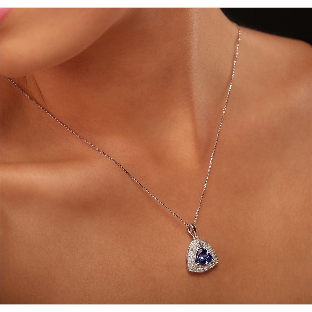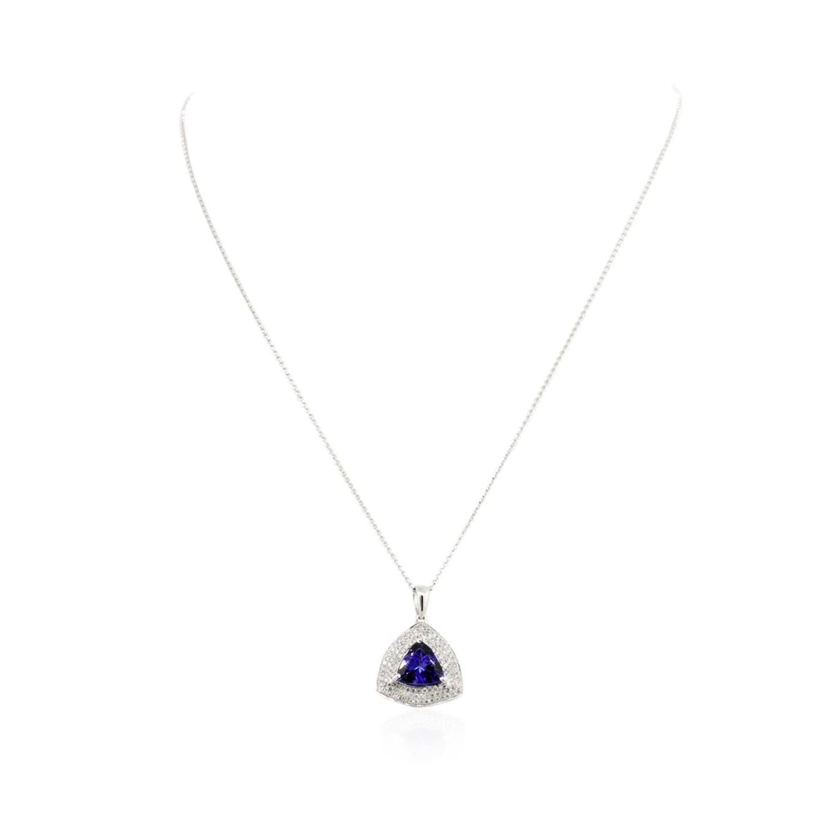 One electronically tested 14KT white gold ladies cast & assembled tanzanite and diamond pendant with chain. Condition is new, good workmanship. The pendant features a tanzanite is set within a diamond lattice gallery, completed by a white gold bail. The pendant is supported by an eighteen inch length 14KT white gold designer style chain, terminating in a spring ring clasp. Bright polish finish. Trademark is Orianne. Identified with markings of "14K". Containing: One prong set triangle mixed cut natural tanzanite, measuring 9.60 x 9.50 x 5.00mm, 6%. bulge factor, approximate weight of 2.91ct., clarity is eye clean, type I, medium dark, moderately strong, violetish blue color, (GIA vB 6/4), cut is good. Transmitting light with no distortion, transparent. Graded in the setting. Tanzanite is a very rare gemstone that is only found in the country of Tanzania. Originally discovered in 1967. Tiffany & Company, named the stone Tanzanite. It is found in the Usumburu Mountains that border the Umba Valley of northern Tanzania. Tanzanite occurs in gray, brown, violet, blue, reddish-purple, & green. The gem is interesting because of its exceptional pleochroism. Rotated in different directions a tanzanite will exhibit multiple changes of color. Tanzanite has a low tolerance to ultrasonic cleaning, and should not be cleaned using this method. One Hundred Eleven pav‚ set round brilliant cut diamonds, measuring 1.10 - 1.00 x 0.63mm (depth est.) approximate. Total Weight of 111 Stones = 0.58ct. Graded in the setting. Clarity: SI-1 to I-1. Color: G - I. Total Weight of Colored Stones 2.91ct. Total Weight of Diamonds 0.58ct. Total Weight of Pendant With Chain 4.80 grams. AIG Appraised at $9,920.00.