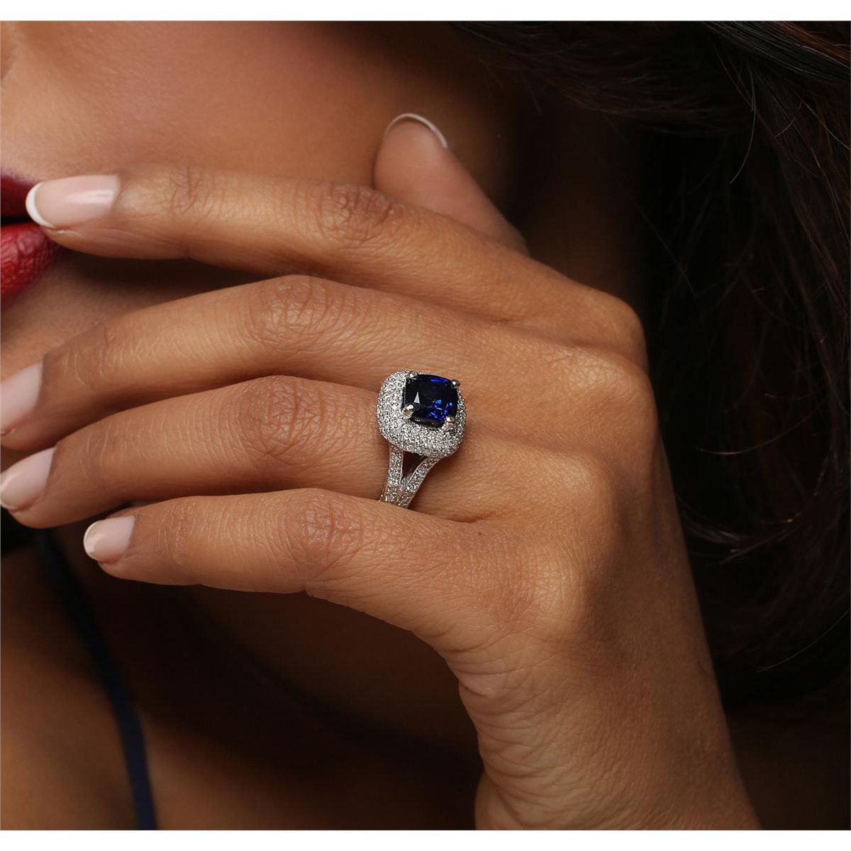 One electronically tested 14KT white gold ladies combination cast & assembled sapphire and diamond ring with a split shank with a bright polish finish. Identified with markings of "K14". Condition is new. Containing: One prong set square cushion modified brilliant cut natural blue sapphire, measuring 7.83 x 7.80 x 5.09mm, approximate weight of 2.92ct., clarity is eye clean, type II, medium dark, moderately strong, blue color, (GIA B 6/4), cut is good. One Hundred Eighty-Eight prong set round brilliant cut diamonds, measuring 1.20 - 1.20 x 0.72mm (depth est.) approximate total weight of 188 Stones = 1.18ct. Clarity: I-1 to I-2. Color: I - J, Cut is Good. All colored gemstones are graded in the mounting, unless otherwise stated. All diamonds and colored gemstones are graded in the mounting, unless otherwise stated. Total Weight of Colored Stones 2.92ct. Total Weight of Diamonds 1.18ct. Total Weight of Ring 6.40 grams. GGL Appraised at $7,710.00.