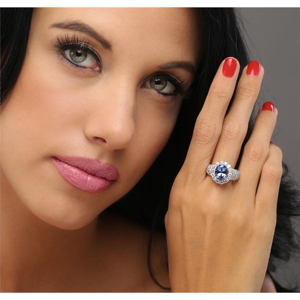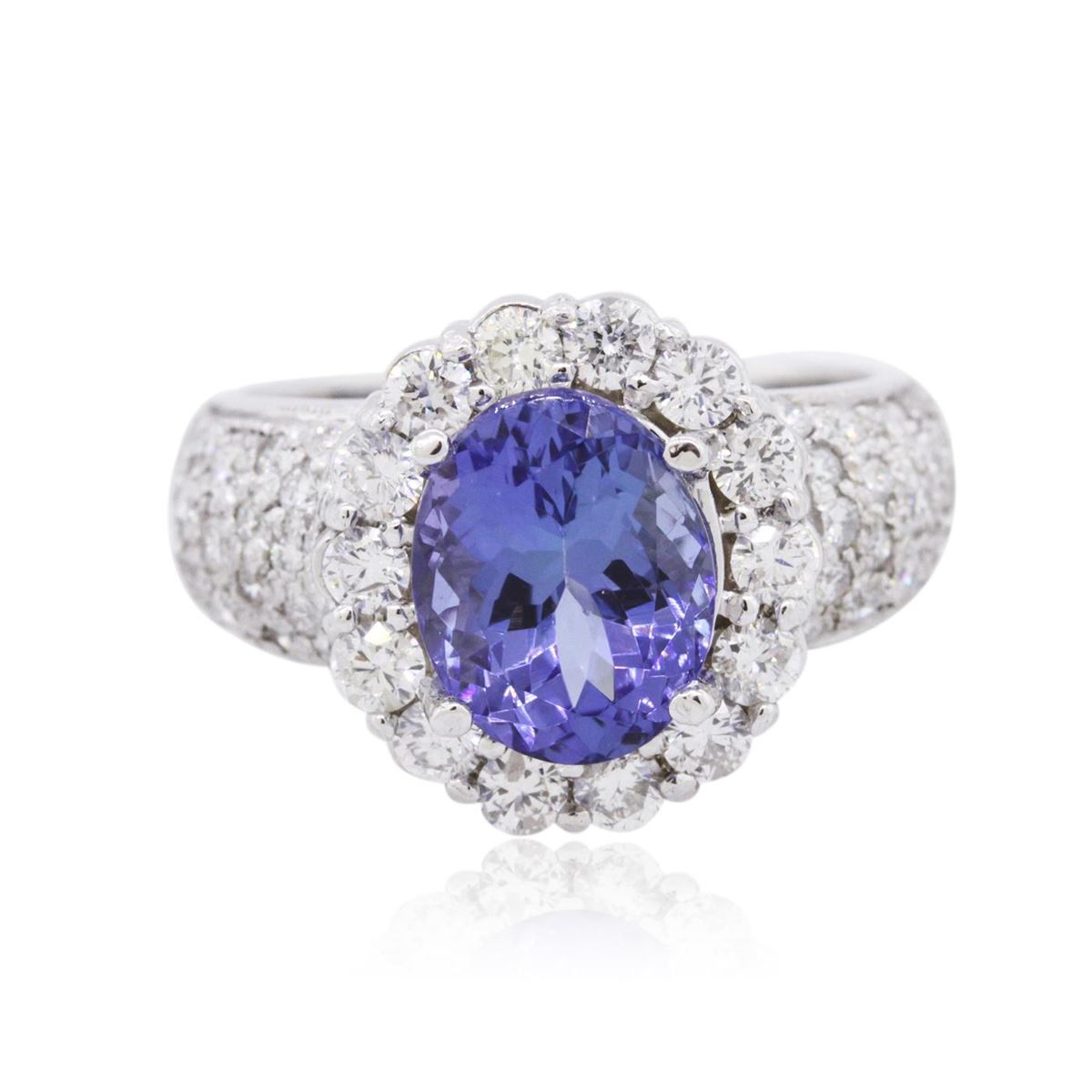 One electronically tested 14KT white gold ladies combination cast & assembled tanzanite and diamond ring with a bright polish finish. Identified with markings of "14K". Condition is new. Containing: One prong set oval modified brilliant cut natural tanzanite, measuring 10.00 x 8.00 x 5.20mm, approximate weight of 2.93ct., clarity is eye clean, type I, medium light, very slightly grayish, violet color, (GIA V 4/3), cut is very good. Thirty-Eight prong set round brilliant cut diamonds, measuring 2.00 - 1.30 x 0.99mm (depth est.) approximate total weight of 38 Stones = 0.62ct. Clarity: SI-2 to I-1. Color: I - J, Cut is Good. Colored gemstones are presumed to have been subjected to commonly used enhancement processes. All diamonds and colored gemstones are graded in the mounting, unless otherwise stated. Total Weight of Colored Stones 2.93ct. Total Weight of Diamonds 0.62ct. Total Weight of Ring 7.70 grams. GGL Appraised at $6,240.00.