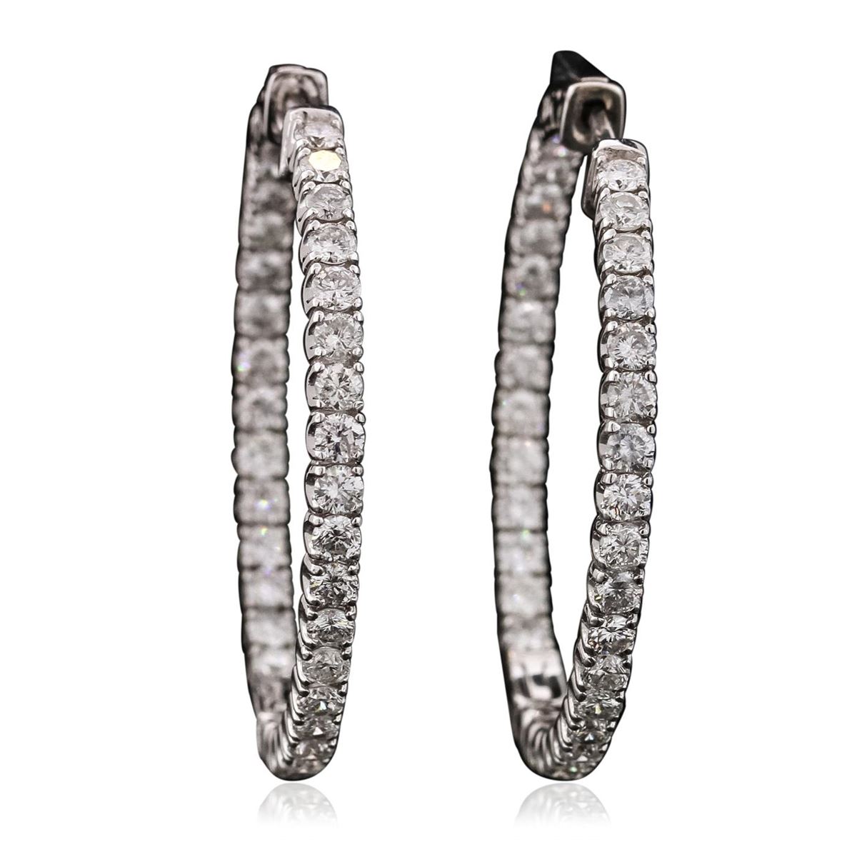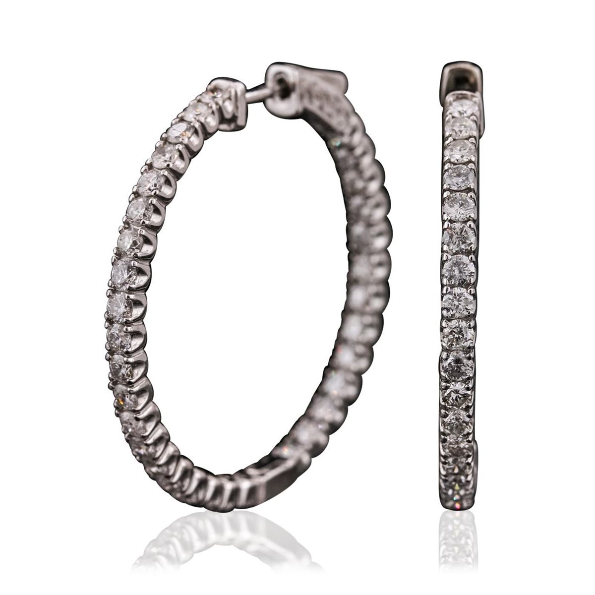 One pair electronically tested 14KT white gold ladies combination cast & assembled diamond hoop earrings with hinged clip backs with a bright polish finish. Identified with markings of "14K". Condition is new. Containing: Sixty-Six prong set round brilliant cut diamonds, measuring 2.30 - 2.30 x 1.38mm (depth est.) approximate total weight of 66 Stones = 2.94ct. Clarity: SI-2 to I-2. Color: H - I, Cut is Good. All diamonds are graded in the mounting, unless otherwise stated. Total Weight of Diamonds 2.94ct. Total Weight of Earrings 10.70 grams. GGL Appraised at $10,370.00.
