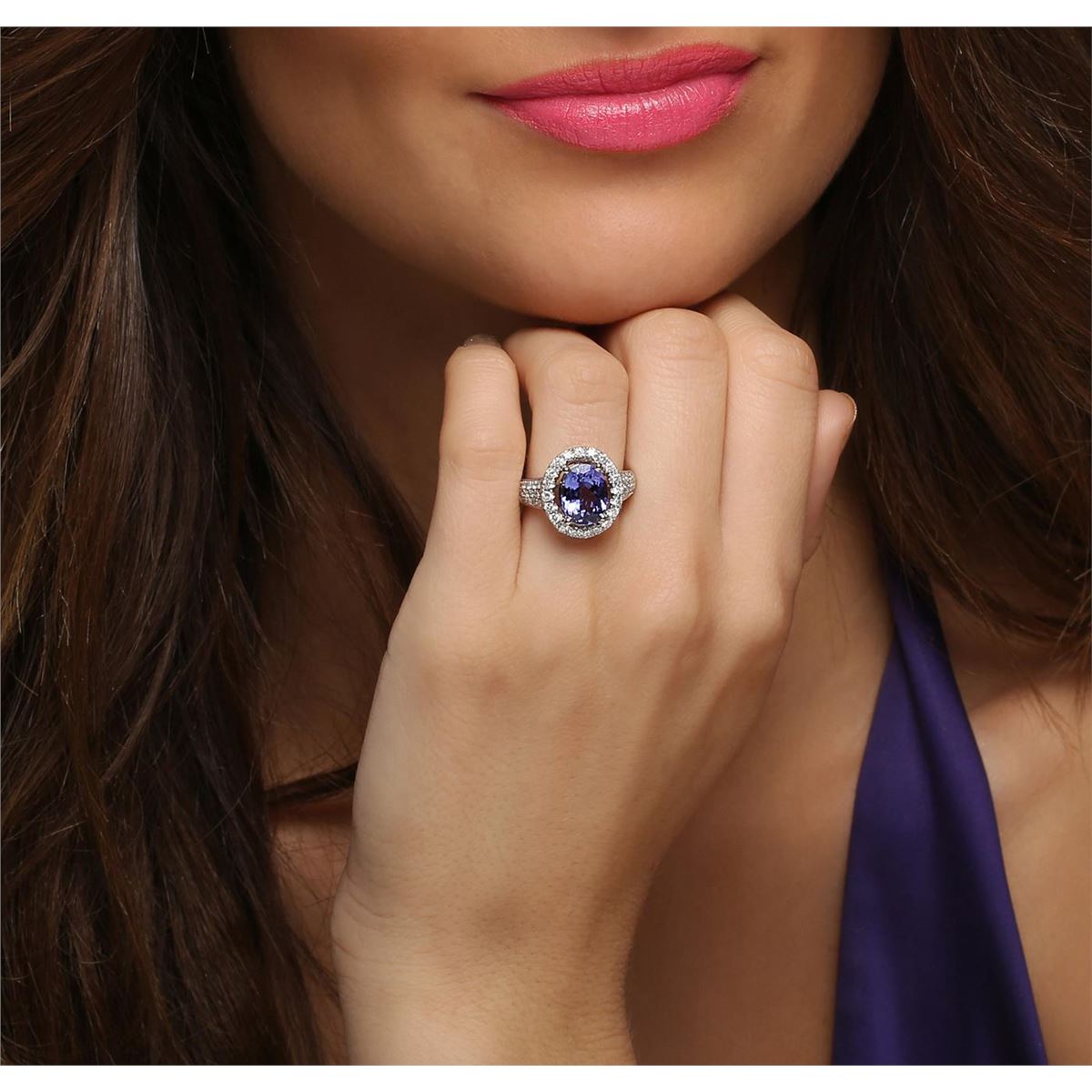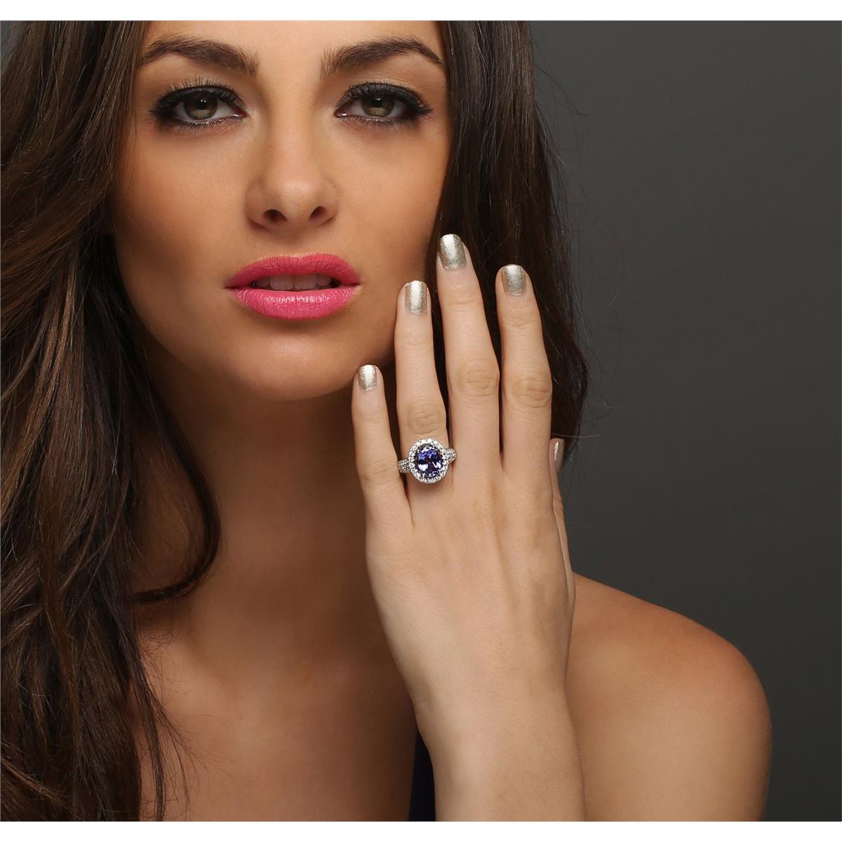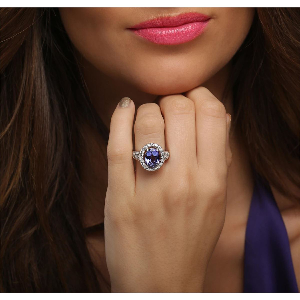 One electronically tested 14KT white gold ladies combination cast & assembled tanzanite and diamond ring with a flat shank with a bright polish finish. Identified with markings of "14K". Condition is new. Containing: One prong set oval modified brilliant cut natural tanzanite, measuring 10.64 x 8.24 x 4.93mm, approximate weight of 2.94ct., clarity is eye clean, type I, medium, very slightly grayish, violet color, (GIA V 5/3), cut is good. Fifty-Five prong set round brilliant cut diamonds, measuring 1.60 - 1.30 x 0.87mm (depth est.) stated total weight of 55 Stones = 0.61ct. Clarity: I-1 to I-2. Color: I - J, Cut is Good. Colored gemstones are presumed to have been subjected to commonly used enhancement processes. All diamonds and colored gemstones are graded in the mounting, unless otherwise stated total weight of Colored Stones 2.94ct. Total Weight of Diamonds 0.61ct. Total Weight of Ring 6.80 grams. GGL Appraised at $7,800.00.