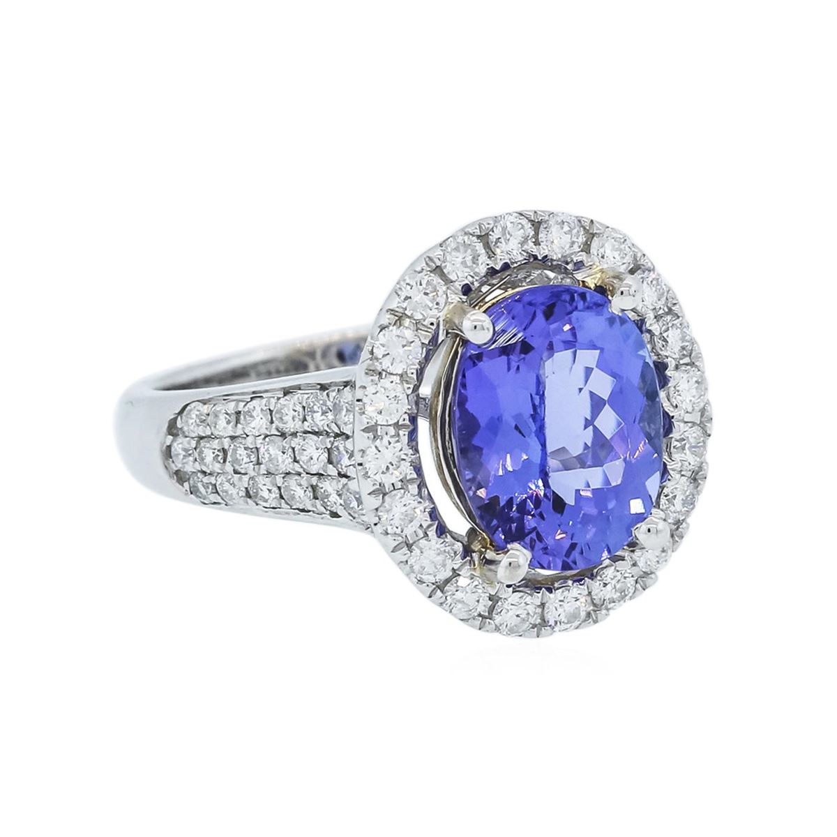 One electronically tested 14KT white gold ladies combination cast & assembled tanzanite and diamond ring with a flat shank with a bright polish finish. Identified with markings of "14K". Condition is new. Containing: One prong set oval modified brilliant cut natural tanzanite, measuring 10.64 x 8.24 x 4.93mm, approximate weight of 2.94ct., clarity is eye clean, type I, medium, very slightly grayish, violet color, (GIA V 5/3), cut is good. Fifty-Five prong set round brilliant cut diamonds, measuring 1.60 - 1.30 x 0.87mm (depth est.) stated total weight of 55 Stones = 0.61ct. Clarity: I-1 to I-2. Color: I - J, Cut is Good. Colored gemstones are presumed to have been subjected to commonly used enhancement processes. All diamonds and colored gemstones are graded in the mounting, unless otherwise stated total weight of Colored Stones 2.94ct. Total Weight of Diamonds 0.61ct. Total Weight of Ring 6.80 grams. GGL Appraised at $7,800.00.