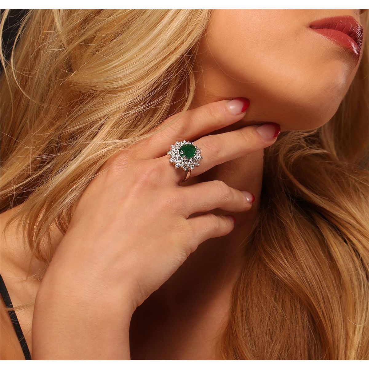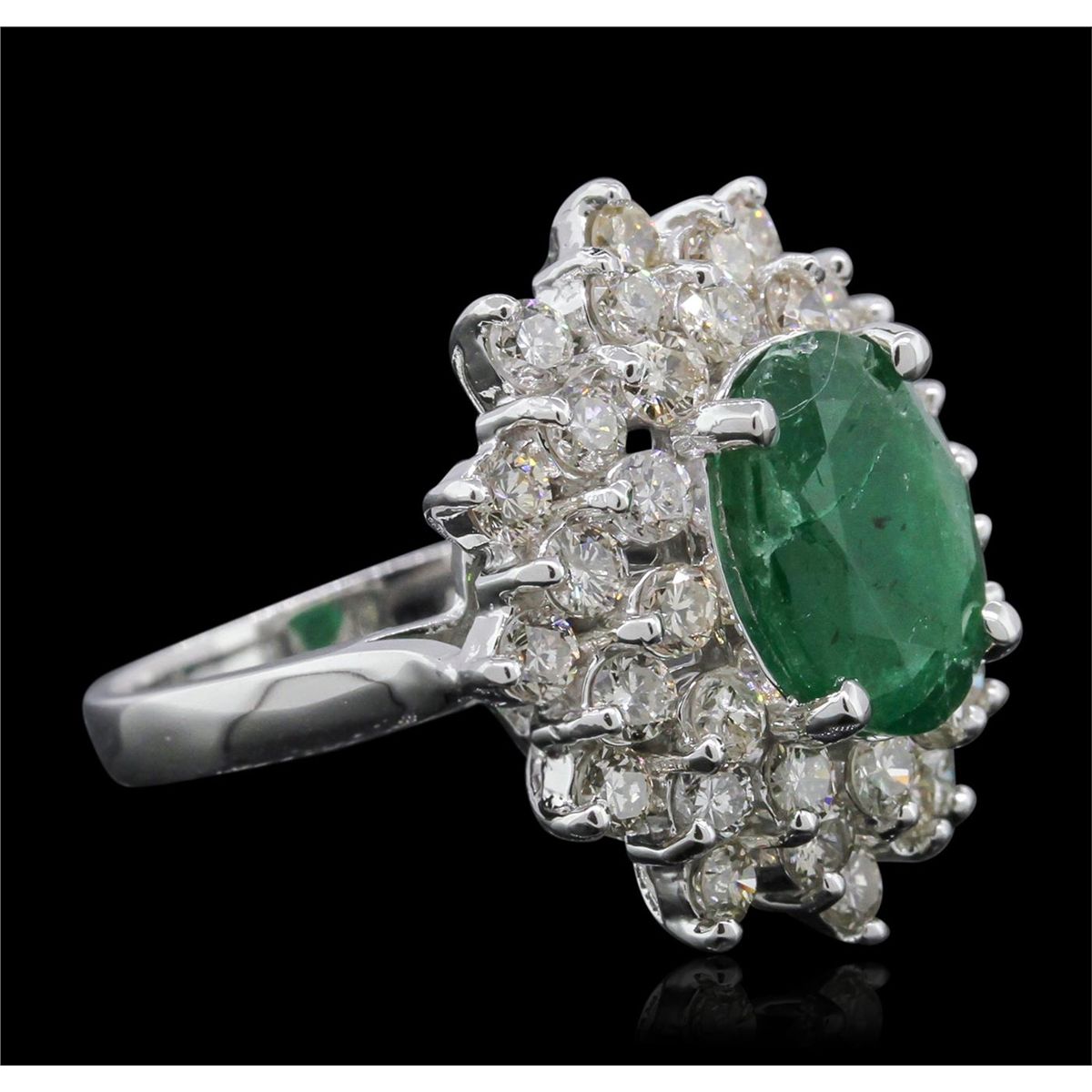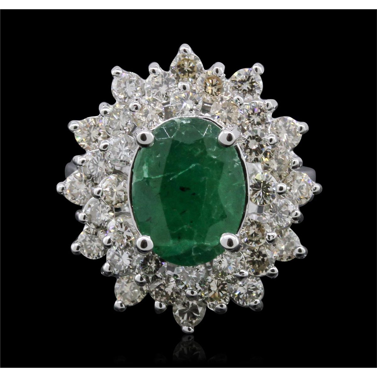 One electronically tested 14KT white gold Ladies combination cast & assembled fancy ring with a high polish finish. Condition is new. Identified with markings of "14K". Containing: One prong set oval modified brilliant cut natural emerald, measuring 11.00 x 8.30 x 5.80mm, approximate weight of 2.94ct., clarity is heavily included, type III, medium dark, moderately strong, green color, (GIA G 6/4), cut is good. Colored gemstones are presumed to have been subjected to commonly used and possible undetectable color/clarity enhancement processes. Thirty-Six prong set round brilliant cut diamonds, measuring 2.50 - 2.40 x 1.63mm (depth est.) approximate total weight of 36 Stones = 2.15ct. Clarity of SI-2 to I-1, Color of M - N, Cut is Good. Total Weight of Colored Stones 2.94ct. Total Weight of Diamonds 2.15ct. Total Weight of Ring 7.90 grams. GGL Appraised at $12,025.00.