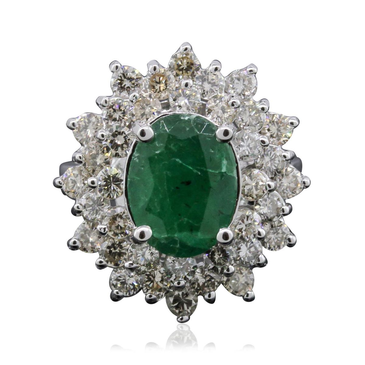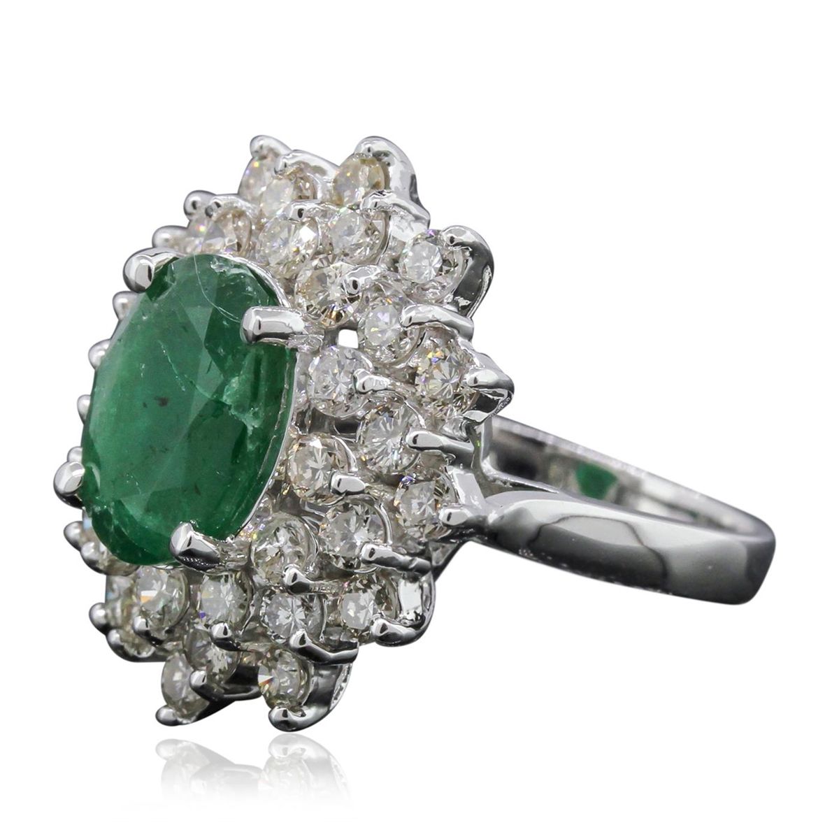 One electronically tested 14KT white gold Ladies combination cast & assembled fancy ring with a high polish finish. Condition is new. Identified with markings of "14K". Containing: One prong set oval modified brilliant cut natural emerald, measuring 11.00 x 8.30 x 5.80mm, approximate weight of 2.94ct., clarity is heavily included, type III, medium dark, moderately strong, green color, (GIA G 6/4), cut is good. Colored gemstones are presumed to have been subjected to commonly used and possible undetectable color/clarity enhancement processes. Thirty-Six prong set round brilliant cut diamonds, measuring 2.50 - 2.40 x 1.63mm (depth est.) approximate total weight of 36 Stones = 2.15ct. Clarity of SI-2 to I-1, Color of M - N, Cut is Good. Total Weight of Colored Stones 2.94ct. Total Weight of Diamonds 2.15ct. Total Weight of Ring 7.90 grams. GGL Appraised at $12,025.00.