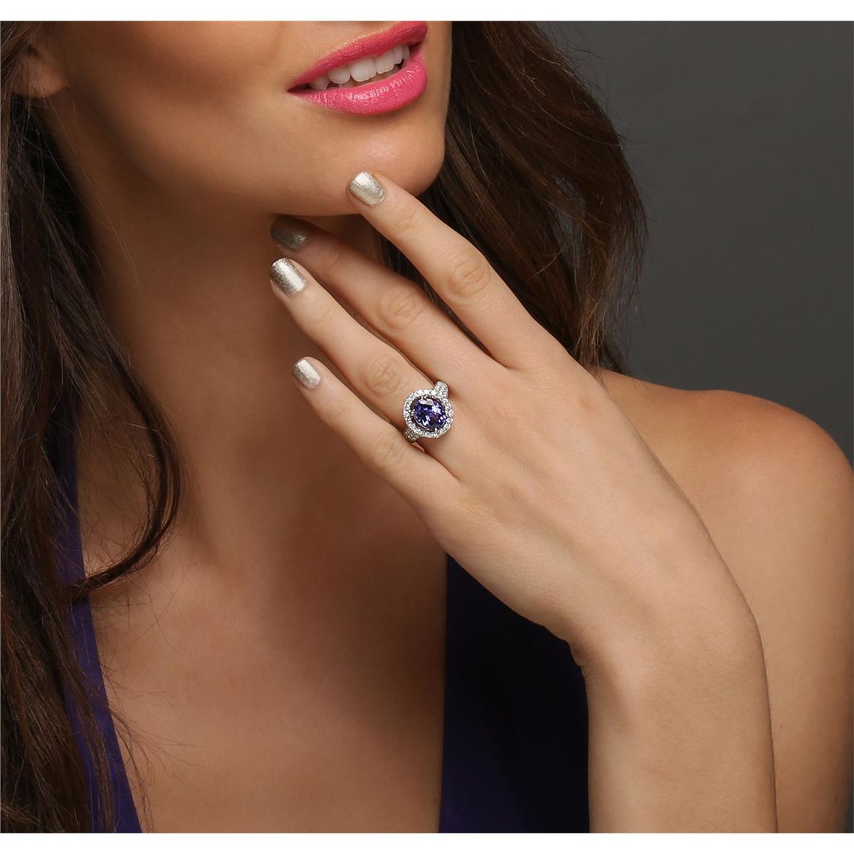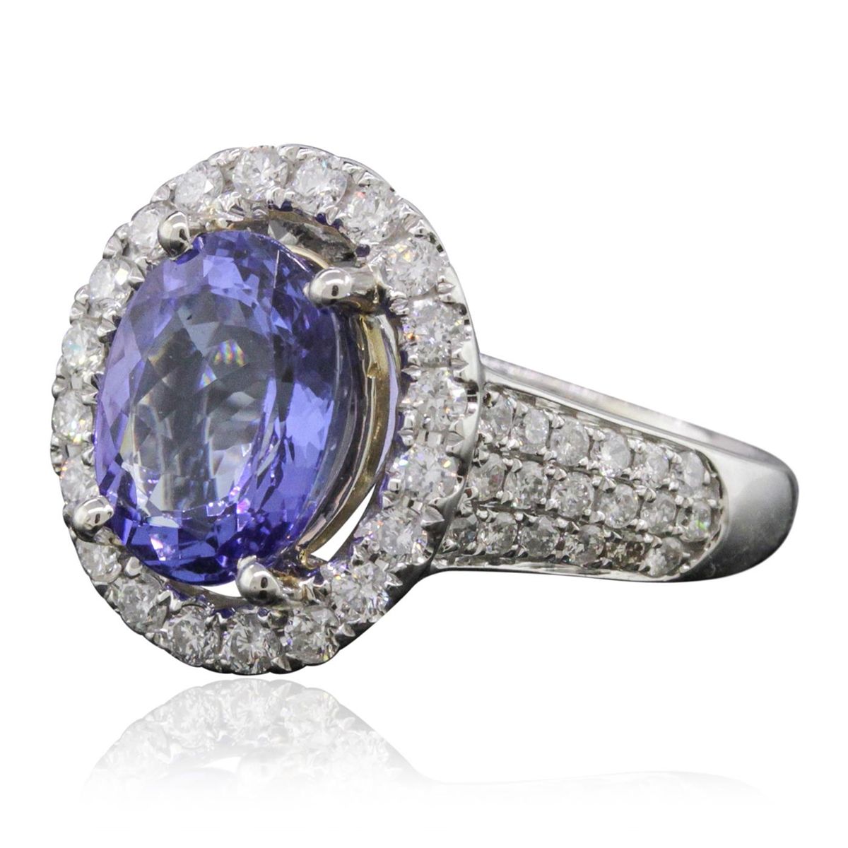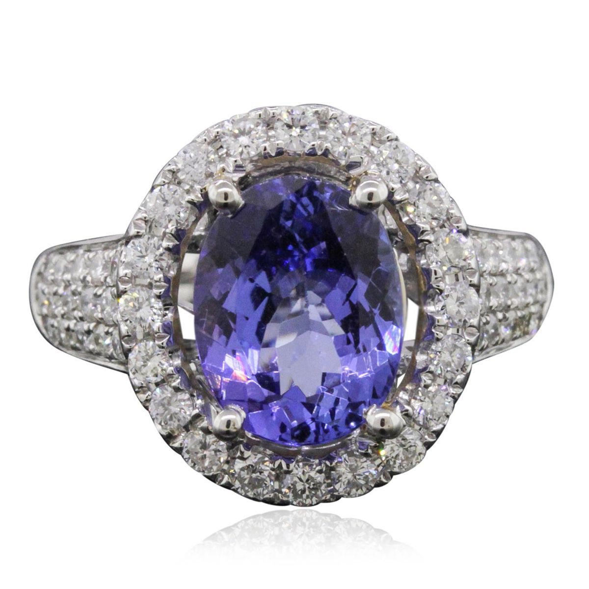 One electronically tested 14KT white gold ladies combination cast & assembled tanzanite and diamond ring with a flat shank with a bright polish finish. Identified with markings of "14K". Condition is new. Containing: One prong set oval modified brilliant cut natural tanzanite, measuring 10.64 x 8.24 x 4.93mm, approximate weight of 2.94ct., clarity is eye clean, type I, medium, very slightly grayish, violet color, (GIA V 5/3), cut is good. Fifty-Five prong set round brilliant cut diamonds, measuring 1.60 - 1.30 x 0.87mm (depth est.) stated total weight of 55 Stones = 0.61ct. Clarity: I-1 to I-2. Color: I - J, Cut is Good. Colored gemstones are presumed to have been subjected to commonly used enhancement processes. All diamonds and colored gemstones are graded in the mounting, unless otherwise stated total weight of Colored Stones 2.94ct. Total Weight of Diamonds 0.61ct. Total Weight of Ring 6.80 grams. GGL Appraised at $7,800.00.