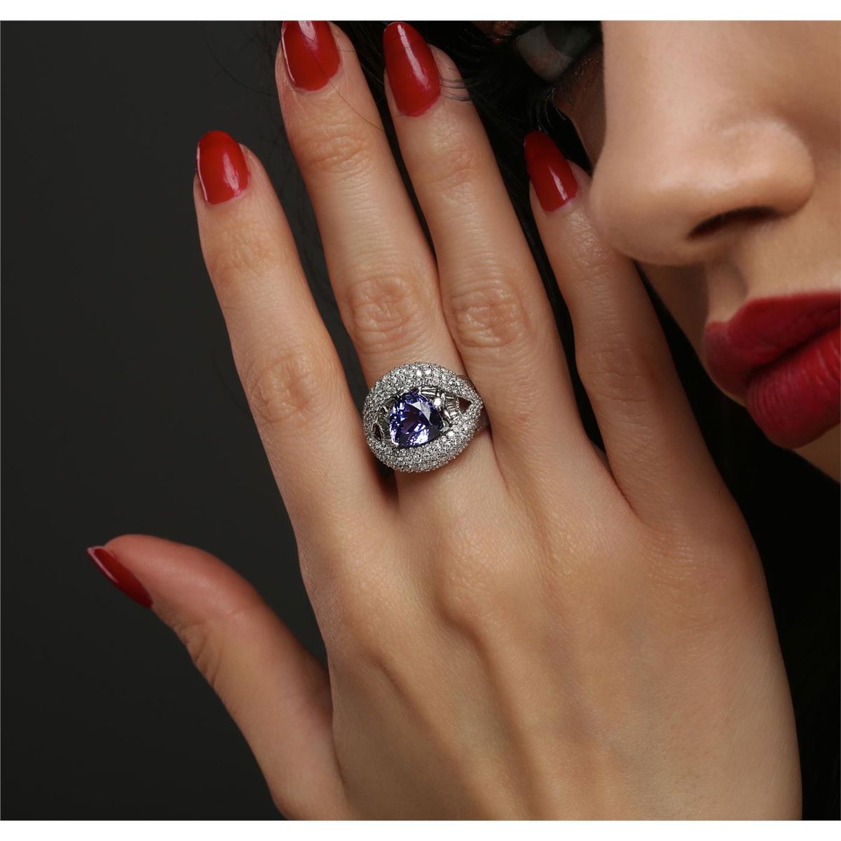One electronically tested 14KT white gold ladies cast tanzanite and diamond ring with a bright polish finish. The featured tanzanite is set within an elaborate diamond set curvature supported by diamond set shoulders, completed by a two and one-half millimeter wide band. Trademark is Orianne. Identified with markings of "14K". Condition is new, good workmanship. Containing: One prong set triangle brilliant cut natural tanzanite, measuring 9.00 x 8.90 x 5.75mm, 6% bulge factor, approximate weight of 2.94ct., clarity is eye clean, type I, medium dark, very slightly grayish, bluish violet color, (GIA bV 6/3), cut is good. Transmitting light with no distortion, transparent. Graded in the setting. Tanzanite is a very rare gemstone that is only found in the country of Tanzania. Originally discovered in 1967. Tiffany & Company, named the stone Tanzanite. It is found in the Usumburu Mountains that border the Umba Valley of northern Tanzania. Tanzanite occurs in gray, brown, violet, blue, reddish-purple, & green. The gem is interesting because of its exceptional pleochroism. Rotated in different directions a tanzanite will exhibit multiple changes of color. Tanzanite has a low tolerance to ultrasonic cleaning, and should not be cleaned using this method. Eighty-Three prong set round brilliant cut diamonds, measuring 1.50 - 1.30 x 0.84mm (depth est.) approximate total weight of 83 Stones = 0.93ct. Graded in the setting. Clarity: I-2 to I-3. Color: H - J Thirty-Eight channel set baguette cut diamonds, measuring from 2.00 x 1.10 x 0.77mm (depth est.) to 2.10 x 1.20 x 0.84mm (depth est.) approximate total weight of 38 Stones = 0.65ct. Graded in the setting. Clarity: SI-2 to I-1. Color: G - I. Total Weight of Colored Stones 2.94ct. Total Weight of Diamonds 1.58ct. Total Weight of Ring 7.54 grams. AIG Appraised at $11,310.00.