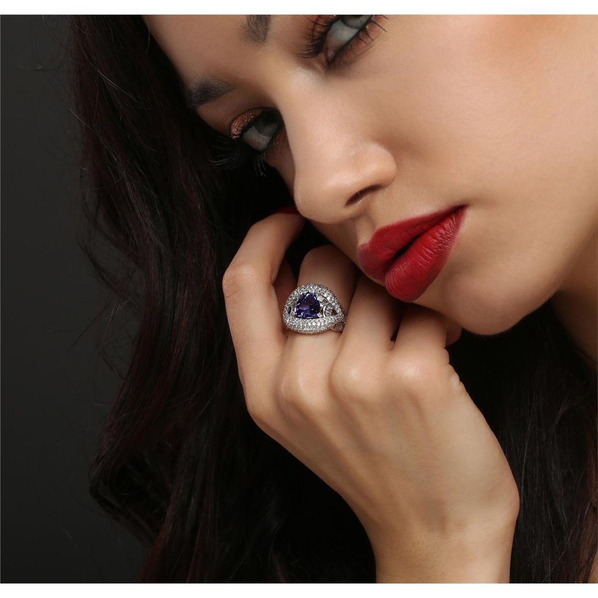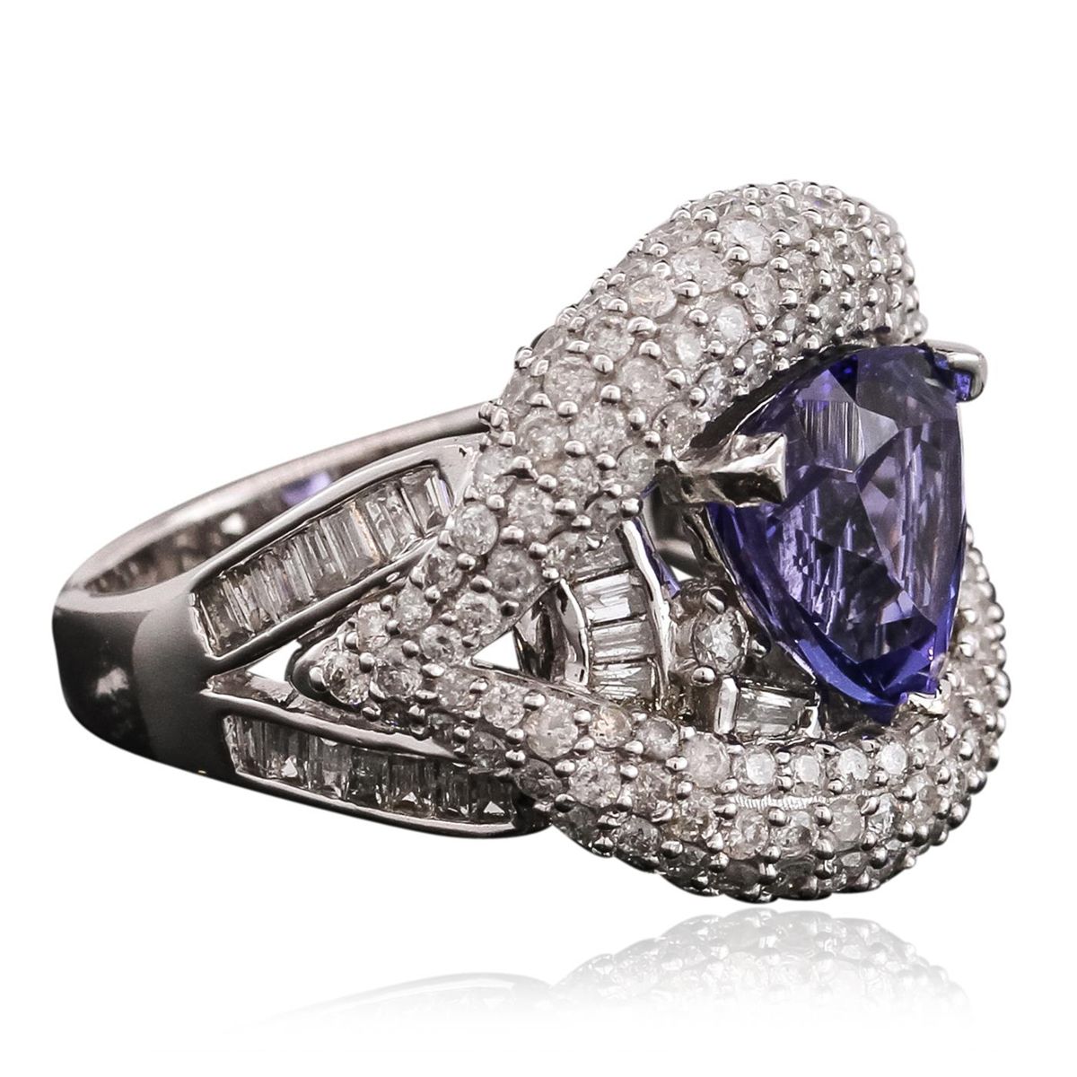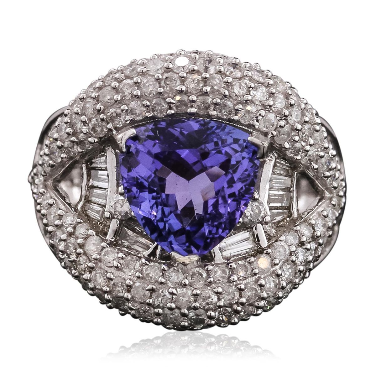 One electronically tested 14KT white gold ladies cast tanzanite and diamond ring with a bright polish finish. The featured tanzanite is set within an elaborate diamond set curvature supported by diamond set shoulders, completed by a two and one-half millimeter wide band. Trademark is Orianne. Identified with markings of "14K". Condition is new, good workmanship. Containing: One prong set triangle brilliant cut natural tanzanite, measuring 9.00 x 8.90 x 5.75mm, 6% bulge factor, approximate weight of 2.94ct., clarity is eye clean, type I, medium dark, very slightly grayish, bluish violet color, (GIA bV 6/3), cut is good. Transmitting light with no distortion, transparent. Graded in the setting. Tanzanite is a very rare gemstone that is only found in the country of Tanzania. Originally discovered in 1967. Tiffany & Company, named the stone Tanzanite. It is found in the Usumburu Mountains that border the Umba Valley of northern Tanzania. Tanzanite occurs in gray, brown, violet, blue, reddish-purple, & green. The gem is interesting because of its exceptional pleochroism. Rotated in different directions a tanzanite will exhibit multiple changes of color. Tanzanite has a low tolerance to ultrasonic cleaning, and should not be cleaned using this method. Eighty-Three prong set round brilliant cut diamonds, measuring 1.50 - 1.30 x 0.84mm (depth est.) approximate total weight of 83 Stones = 0.93ct. Graded in the setting. Clarity: I-2 to I-3. Color: H - J Thirty-Eight channel set baguette cut diamonds, measuring from 2.00 x 1.10 x 0.77mm (depth est.) to 2.10 x 1.20 x 0.84mm (depth est.) approximate total weight of 38 Stones = 0.65ct. Graded in the setting. Clarity: SI-2 to I-1. Color: G - I. Total Weight of Colored Stones 2.94ct. Total Weight of Diamonds 1.58ct. Total Weight of Ring 7.54 grams. AIG Appraised at $11,310.00.