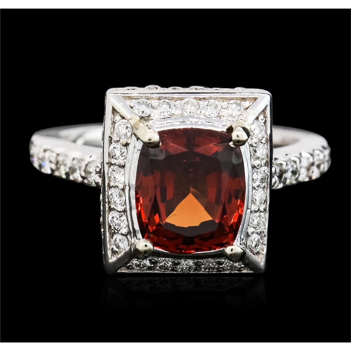 One electronically tested 14KT white gold ladies cast pyrope-almandite garnet & diamond ring with a bright polish finish. The featured pyrope-almandite garnet is set within tiered diamond bezels supported by diamond set shoulders, completed by a one and one-half millimeter wide band. Identified with markings of "14K". Condition is new, good workmanship. Containing: One prong set rectangular cushion mixed cut natural pyrope-almandite garnet, measuring 8.65 x 7.50 x 4.50mm, 6%. bulge factor, approximate weight of 2.95ct., clarity is eye clean, dark, slightly brownish, orangy red color, (GIA oR 7/2), cut is good. Transmitting light with no distortion, transparent, Refractive index testing results of 1.76. This is a conclusive result for pyrope-almandite garnet. Graded in the setting. Sixty prong set round brilliant cut diamonds, measuring 1.70 - 1.50 x 0.96mm (depth est.) approximate total weight of 60 Stones = 1.00ct. Graded in the setting. Clarity: SI-1 to I-1. Color: G - I. Total Weight of Colored Stones 2.95ct. Total Weight of Diamonds 1.00ct. Total Weight of Ring 7.81 grams. AIG Appraised at $4,450.00.