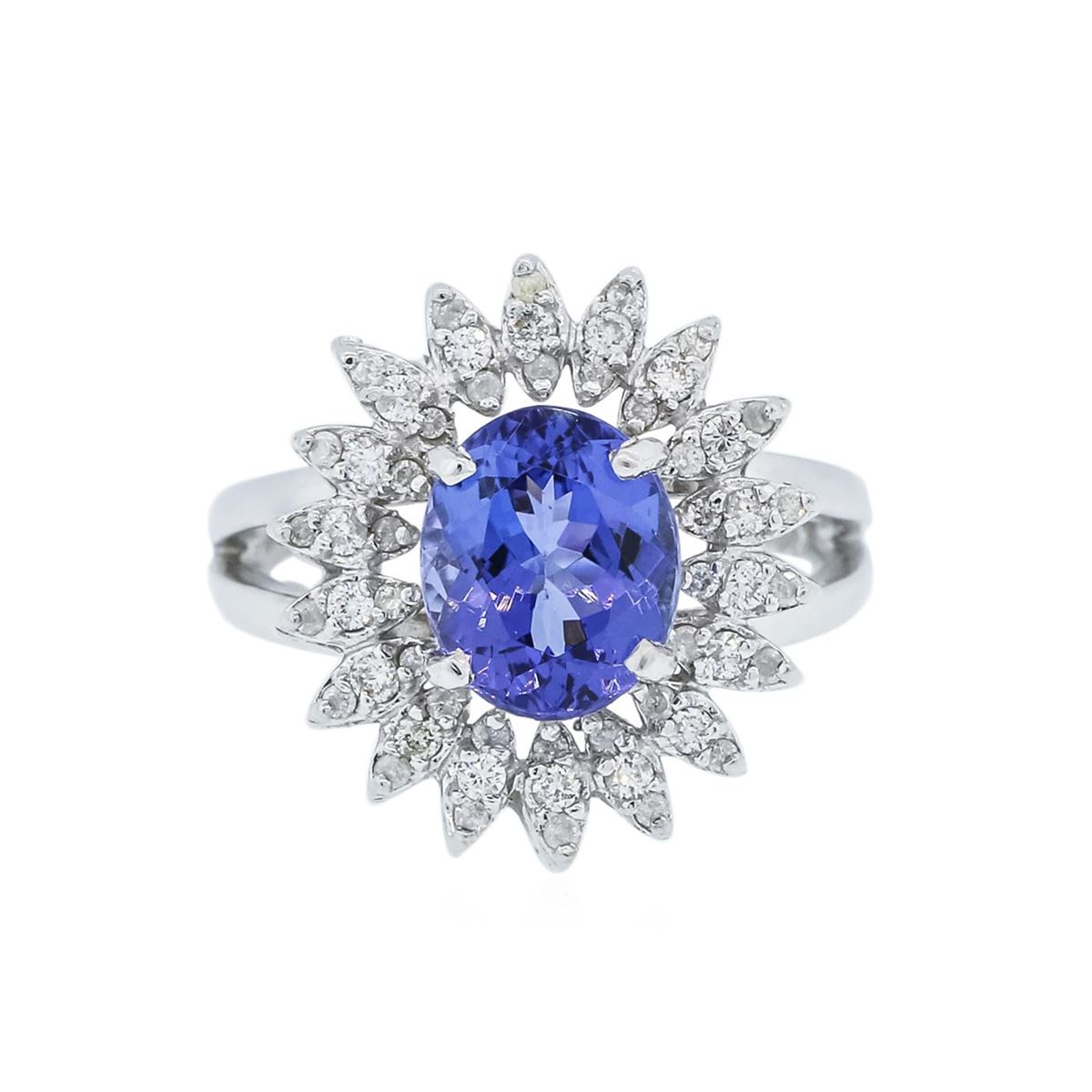 One electronically tested 14KT white gold ladies cast tanzanite and diamond ring with a bright polish finish. Identified with markings of "K14". Condition is new. Containing: One prong set oval modified brilliant cut natural tanzanite, measuring 9.29 x 7.60 x 5.31mm, approximate weight of 2.95ct., clarity is eye clean, type I, medium, very slightly grayish, violet color, (GIA V 5/3), cut is good. Fifty-Four prong set round brilliant cut diamonds, measuring 1.30 - 1.30 x 0.78mm (depth est.) approximate total weight of 54 Stones = 0.43ct. Clarity: SI-2 to I-1. Color: H - I, Cut is Good. Colored gemstones are presumed to have been subjected to commonly used enhancement processes. All diamonds and colored gemstones are graded in the mounting, unless otherwise stated. Total Weight of Colored Stones 2.95ct. Total Weight of Diamonds 0.43ct. Total Weight of Ring 6.10 grams. GGL Appraised at $4,825.00.