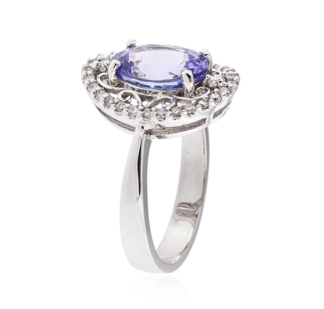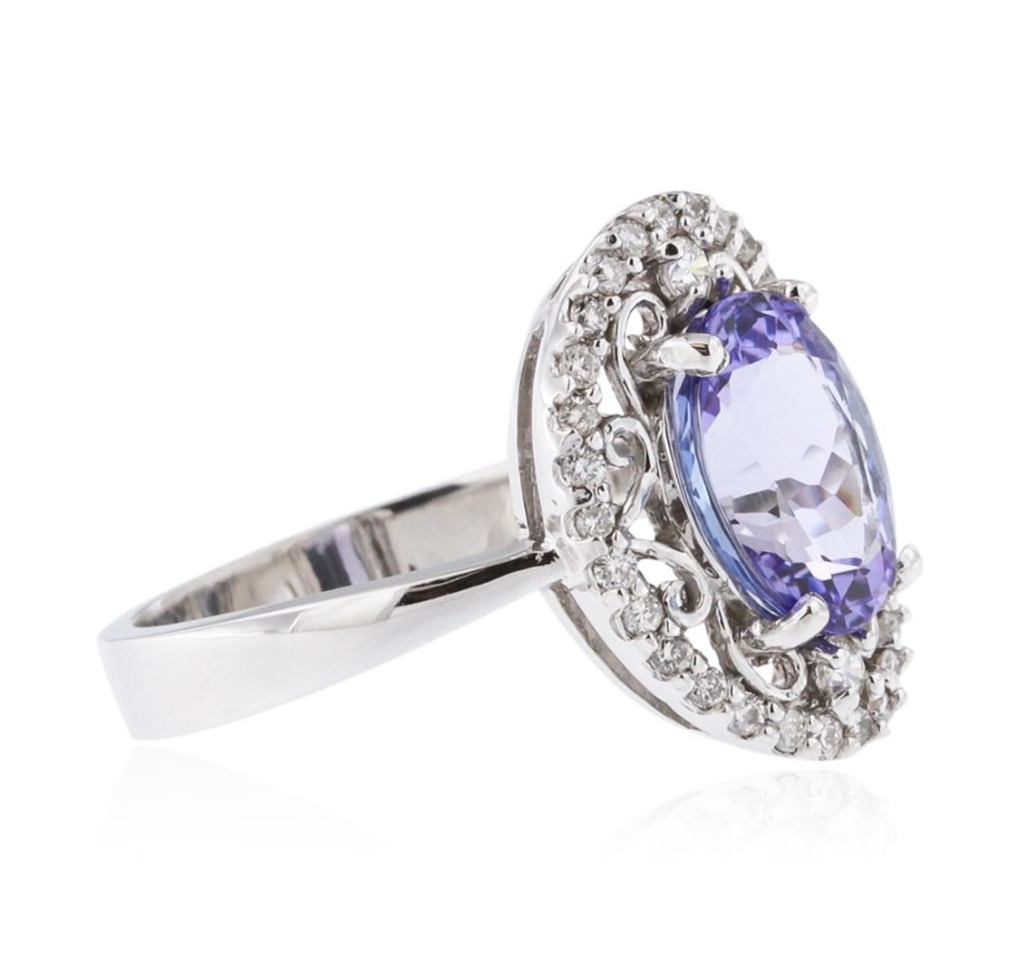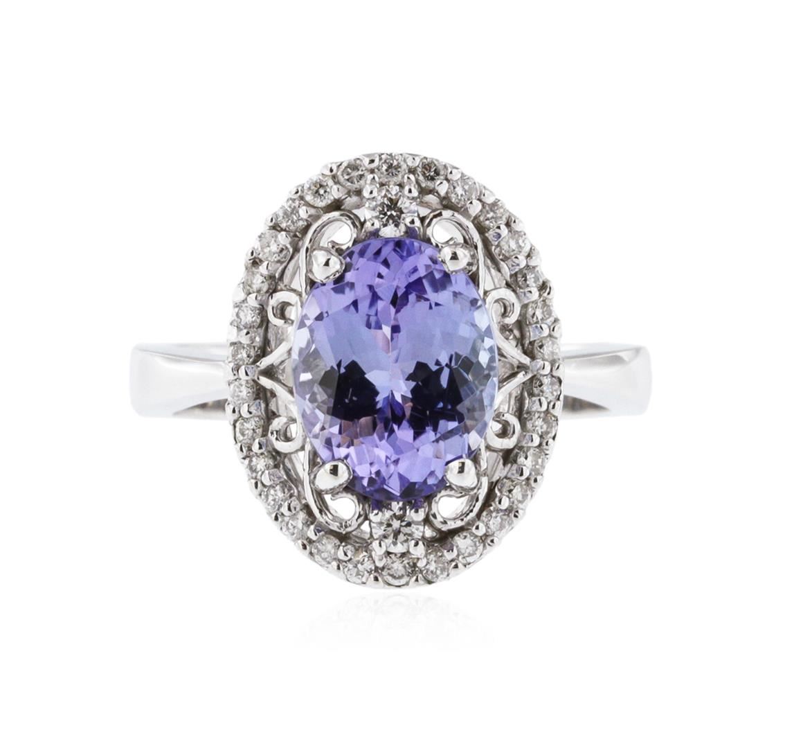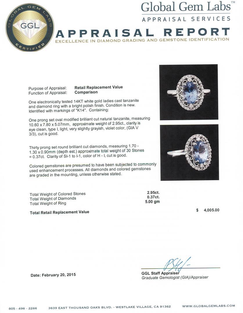 One electronically tested 14KT white gold ladies cast tanzanite and diamond ring with a bright polish finish. Identified with markings of "K14". Condition is new. Containing: One prong set oval modified brilliant cut natural tanzanite, measuring 10.60 x 7.80 x 5.07mm, approximate weight of 2.95ct., clarity is eye clean, type I, light, very slightly grayish, violet color, (GIA V 3/3), cut is good. Thirty prong set round brilliant cut diamonds, measuring 1.70 - 1.30 x 0.90mm (depth est.) approximate total weight of 30 Stones = 0.37ct. Clarity: SI-1 to I-1. Color: H - I, Cut is Good. Colored gemstones are presumed to have been subjected to commonly used enhancement processes. All diamonds and colored gemstones are graded in the mounting, unless otherwise stated. Total Weight of Colored Stones 2.95ct. Total Weight of Diamonds 0.37ct. Total Weight of Ring 5.00 grams. GGL Appraised at $4,005.00.