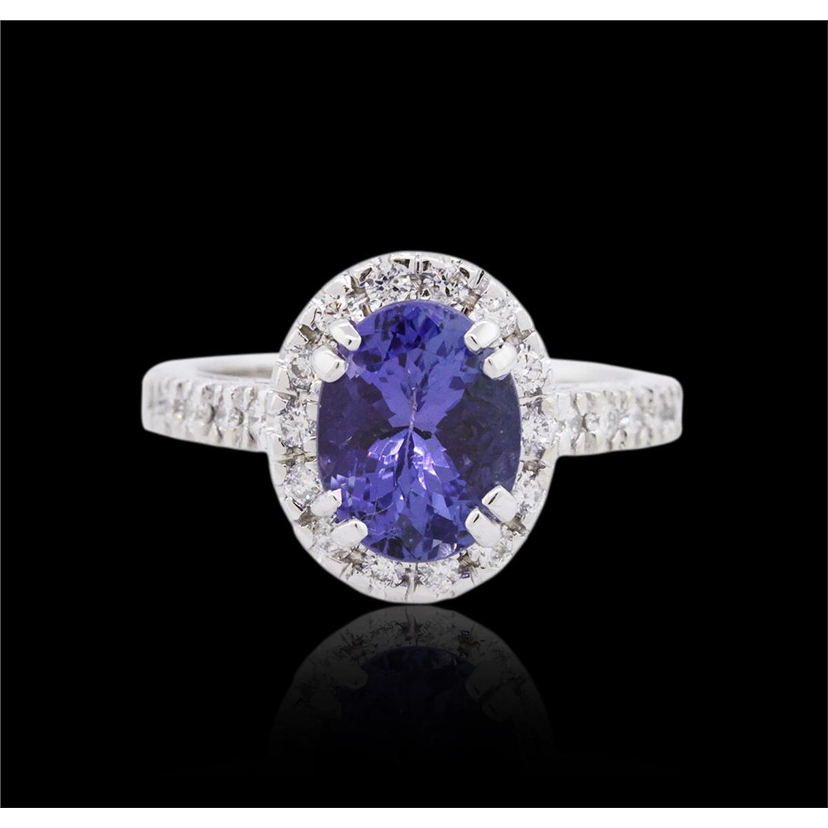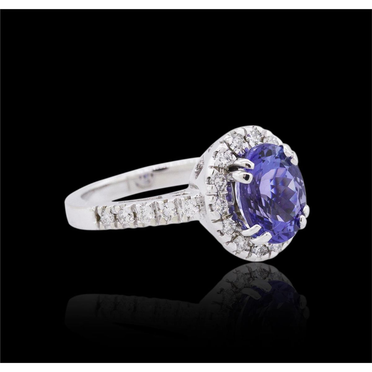 One electronically tested 14KT white gold ladies combination cast & assembled tanzanite and diamond ring with a flat shank with a bright polish finish. Identified with markings of "14K". Condition is new. Containing: One prong set oval modified brilliant cut natural tanzanite, measuring 9.43 x 7.40 x 6.00mm, approximate weight of 2.95ct., clarity is eye clean, type I, medium light, moderately strong, violet color, (GIA V 4/4), cut is good. Twenty-Four prong set round brilliant cut diamonds, measuring 1.50 - 1.50 x 0.90mm (depth est.) approximate total weight of 24 Stones = 0.30ct. Clarity: SI-2 to I-1. Color: I - J, Cut is Good. All diamonds and colored gemstones are graded in the mounting, unless otherwise stated. Colored gemstones are presumed to have been subjected to commonly used enhancement processes. Total Weight of Colored Stones 2.95ct. Total Weight of Diamonds 0.30ct. Total Weight of Ring 5.90 grams. GGL Appraised at $5,935.00.