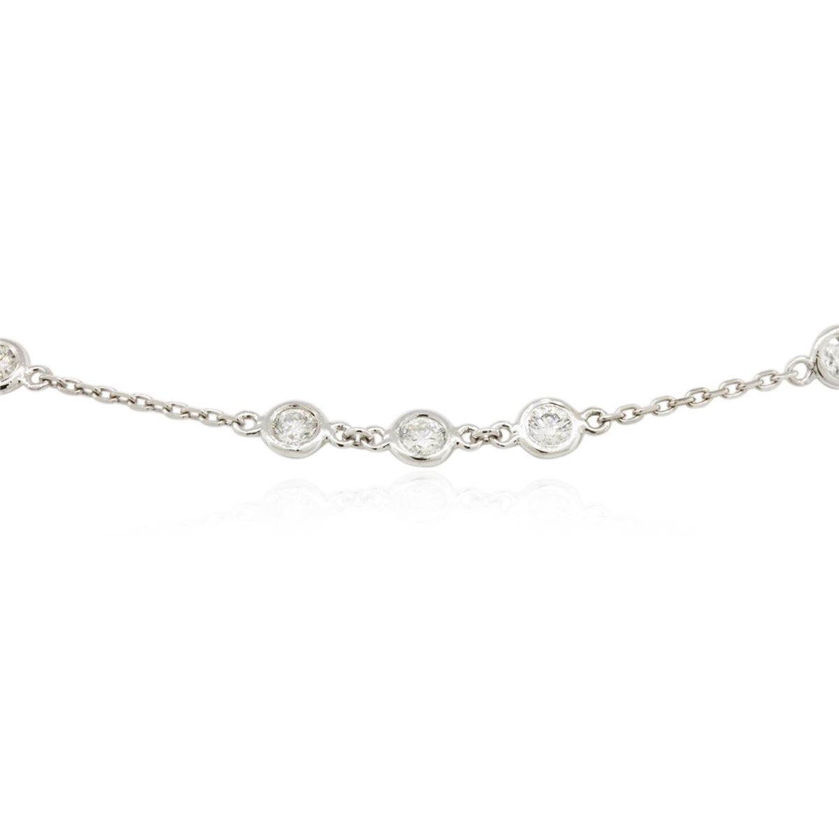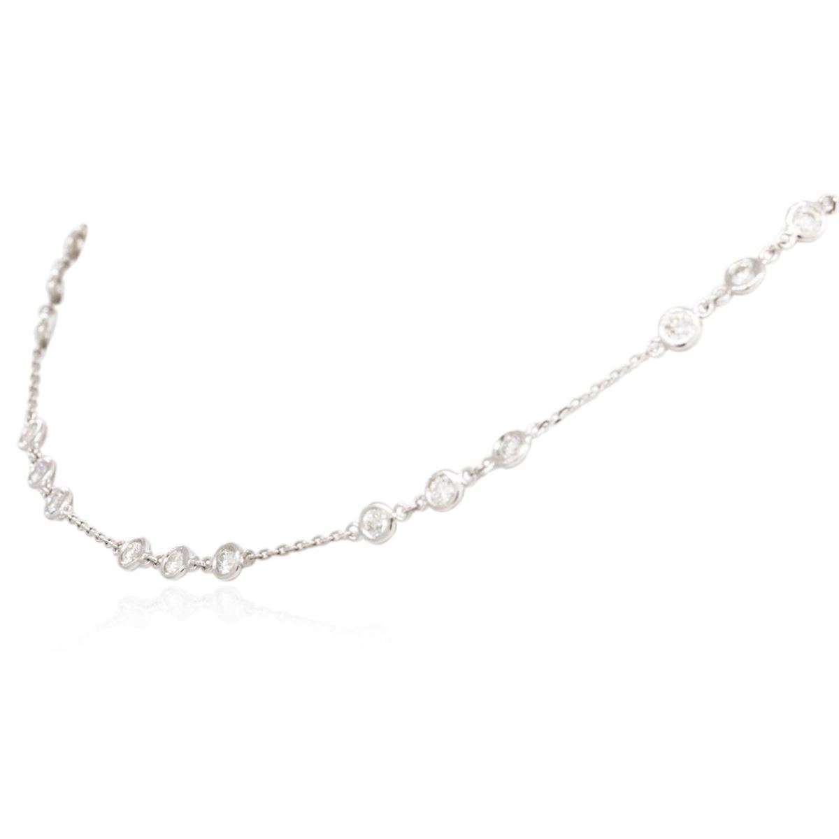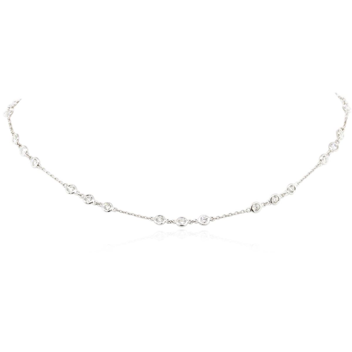 One electronically tested 14KT white gold ladies cast diamond necklace with a lobster claw clasp with a bright polish finish. Measurements: 16" in length Identified with markings of "K14". Condition is new. Containing: Thirty bezel set round brilliant cut diamonds, measuring 3.00 - 3.00 x 1.80mm (depth est.) approximate total weight of 30 Stones = 2.96ct. Clarity: SI-1 to SI-2. Color: H - I, Cut is Good. All diamonds are graded in the mounting, unless otherwise stated. Total Weight of Diamonds 2.96ct. Total Weight of Necklace 5.40 grams. GGL Appraised at $6,225.00.