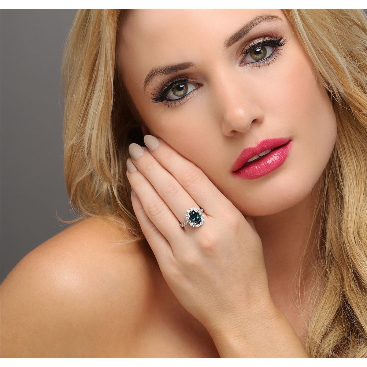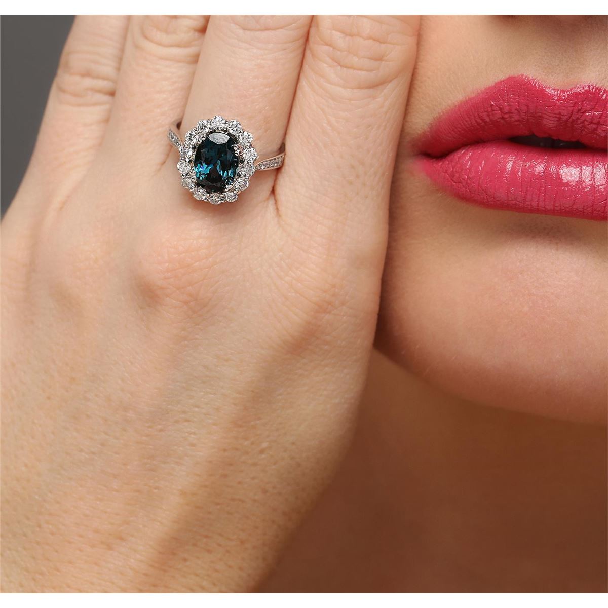One electronically tested 14KT white gold ladies cast blue spinel and diamond ring with a bright polish finish. The featured blue spinel is set within a diamond bezel supported by diamond set shoulders, completed by a two and one-half millimeter wide band. Identified with markings of "K14". Condition is new, good workmanship. Containing: One prong set oval mixed cut natural blue spinel, measuring 9.80 x 7.15 x 5.40mm, 6%. bulge factor, approximate weight of 2.96ct., clarity is eye clean, type II, dark, very slightly grayish, very slightly greenish blue color, (GIA vslgB 7/3), cut is good. Transmitting light with no distortion, transparent. Refractive index testing results of 1.72. This is a conclusive result for spinel. Graded in the setting. Fourteen prong set round brilliant cut diamonds, measuring 2.20 - 2.10 x 1.29mm (depth est.) approximate total weight of 14 Stones = 0.60ct. Graded in the setting. Clarity: SI-1 to I-1. Color: H - J Twelve prong set round brilliant cut diamonds, measuring 1.20 - 1.10 x 0.69mm (depth est.) approximate total weight of 12 Stones = 0.10ct. Graded in the setting. Clarity: I-1 to I-2. Color: G - I. Total Weight of Colored Stones 2.96ct. Total Weight of Diamonds 0.70ct. Total Weight of Ring 5.18 grams. AIG Appraised at $4,070.00.