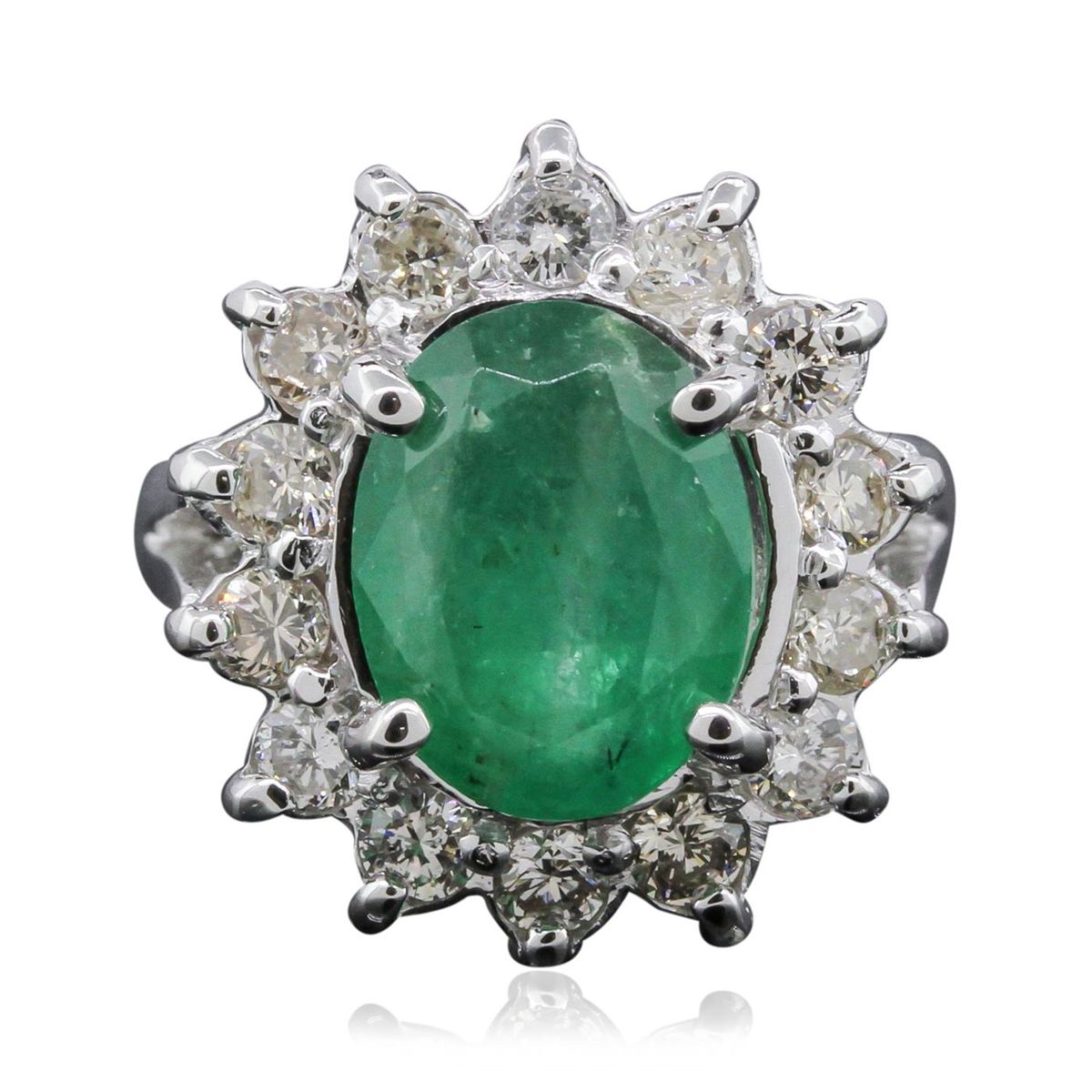 One electronically tested 14KT white gold Ladies combination cast & assembled fancy ring with a high polish finish. Condition is new. Identified with markings of "14K". Containing: One prong set oval modified brilliant cut natural emerald, measuring 11.30 x 8.80 x 5.40mm, approximate weight of 2.97ct., clarity is heavily included, type III, medium, moderately strong, green color, (GIA G 5/4), cut is good. Colored gemstones are presumed to have been subjected to commonly used and possible undetectable color/clarity enhancement processes. Fourteen prong set round brilliant cut diamonds, measuring 2.50 - 2.50 x 1.67mm (depth est.) approximate total weight of 14 Stones = 1.00ct. Clarity of SI-2 to I-1, Color of K - L, Cut is Good. Total Weight of Colored Stones 2.97ct. Total Weight of Diamonds 1.00ct. Total Weight of Ring 8.50 grams. GGL Appraised at $10,470.00.