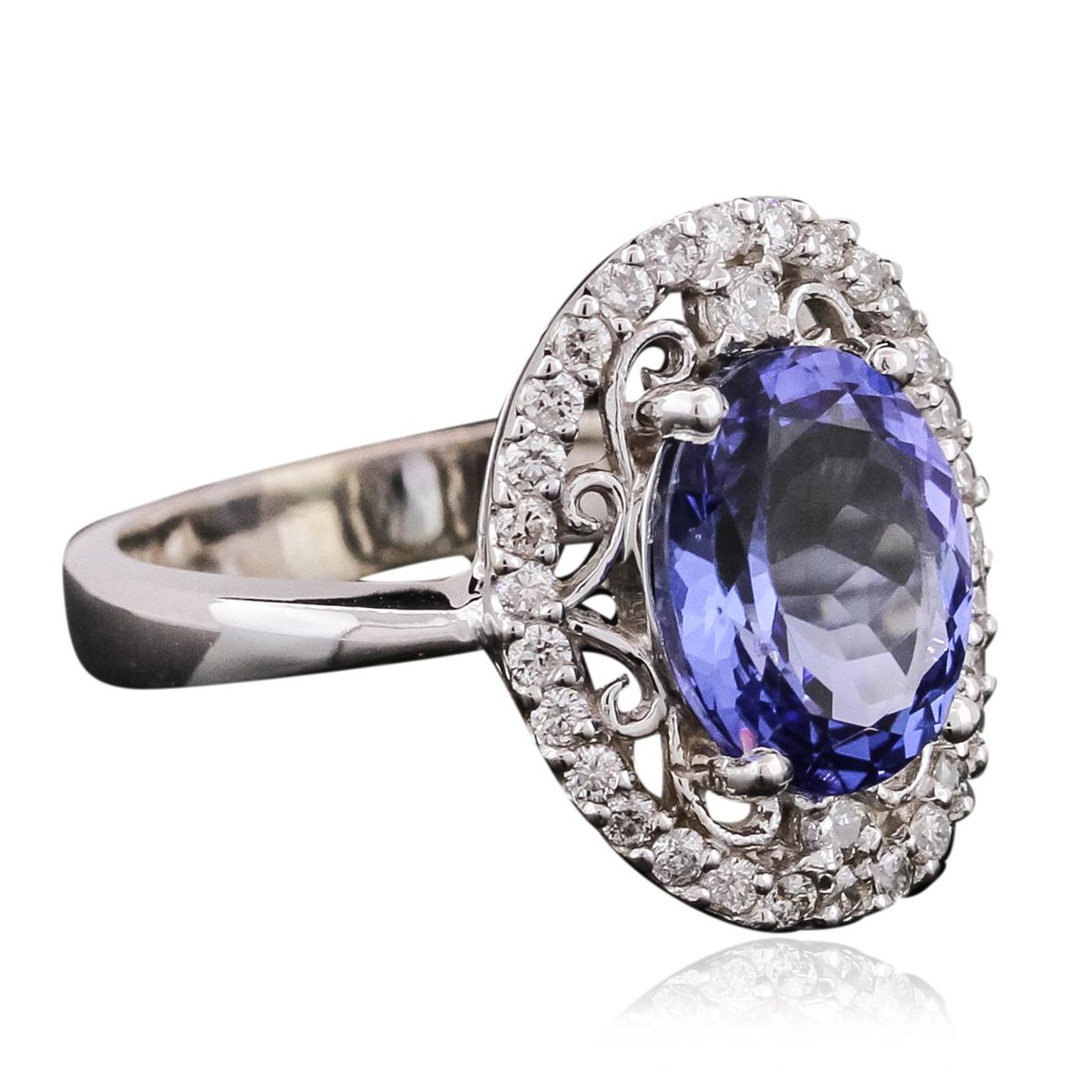 One electronically tested 14KT White Gold ladies cast tanzanite and diamond ring with a bright polish finish. The featured tanzanite is set within a diamond bezel, completed by a three millimeter wide band. Identified with markings of "K14". Condition is new, good workmanship. Containing: One prong set oval brilliant cut natural tanzanite, measuring 10.15 x 8.05 x 4.95mm, 8% bulge factor, approximate weight of 2.97ct., clarity is eye clean, type I, medium dark, very slightly grayish, bluish violet color, (GIA bV 6/3), cut is good. Transmitting light with no distortion, transparent. Graded in the setting. Tanzanite is a very rare gemstone that is only found in the country of Tanzania. Originally discovered in 1967. Tiffany & Company, named the stone Tanzanite. It is found in the Usumburu Mountains that border the Umba Valley of northern Tanzania. Tanzanite occurs in gray, brown, violet, blue, reddish-purple, & green. The gem is interesting because of its exceptional pleochroism. Rotated in different directions a tanzanite will exhibit multiple changes of color. Tanzanite has a low tolerance to ultrasonic cleaning, and should not be cleaned using this method. Thirty-Two prong set round brilliant cut diamonds, measuring 1.40 - 1.30 x 0.81mm (depth est.) approximate total weight of 32 Stones = 0.38ct. Graded in the setting. Clarity: SI-1 to I-1. Color: G - I. Total Weight of Colored Stones 2.97ct. Total Weight of Diamonds 0.38ct. Total Weight of Ring 5.04 grams. AIG Appraised at $8,785.00.
