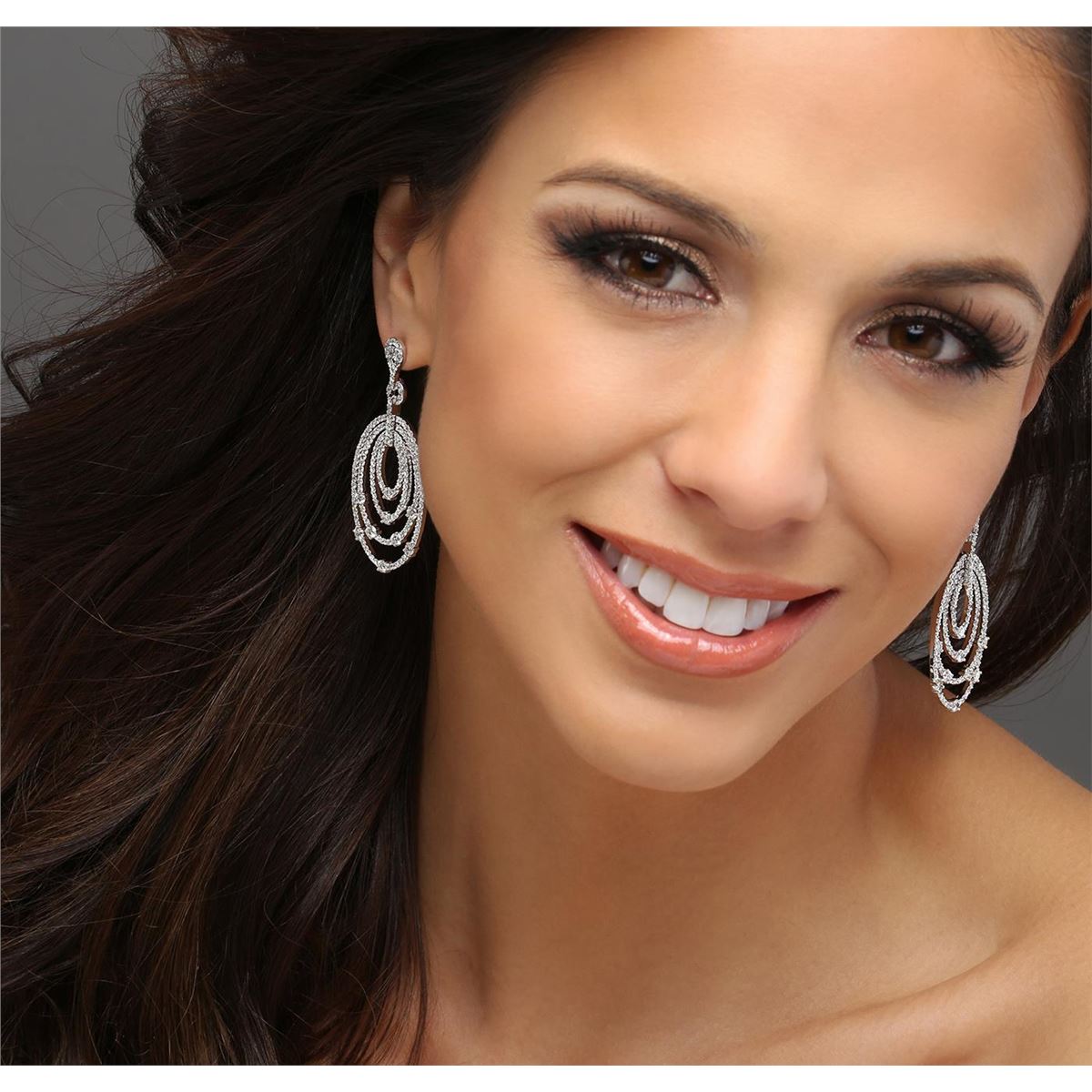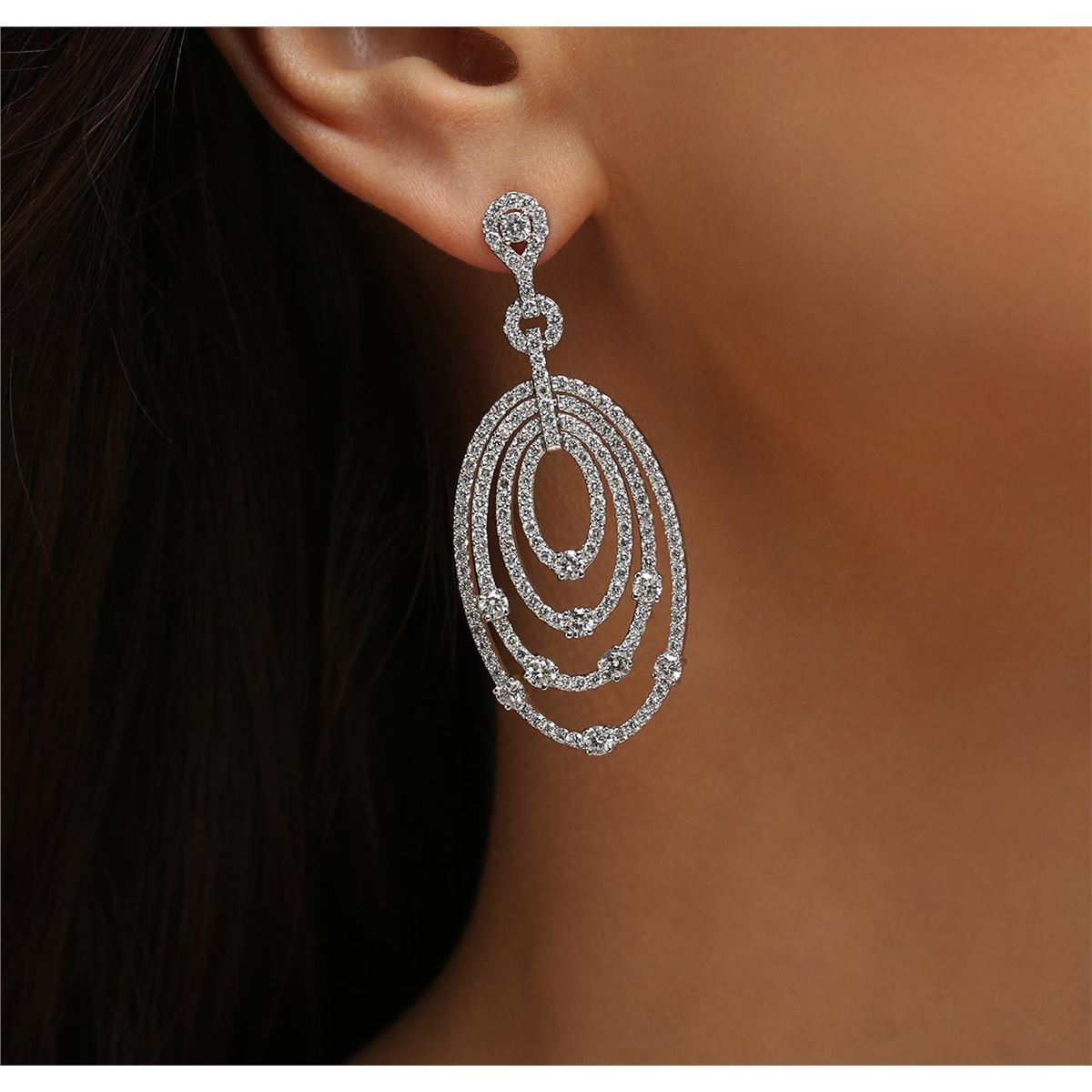 One pair electronically tested 14KT white gold ladies cast diamond earrings with hinged clip backs with a bright polish finish. Identified with markings of "585". Condition is new. Containing: Three Hundred Twenty prong set round brilliant cut diamonds, measuring 1.10 - 1.10 x 0.66mm (depth est.) approximate total weight of 320 Stones = 1.54ct. Clarity: SI-2 to I-1. Color: I - J, Cut is Good. Twenty prong set round brilliant cut diamonds, measuring 2.70 - 2.70 x 1.62mm (depth est.) approximate total weight of 20 Stones = 1.44ct. Clarity: SI-2. Color: I - J. All diamonds are graded in the mounting, unless otherwise stated. Total Weight of Diamonds 2.98ct. Total Weight of Earrings 11.90 grams. GGL Appraised at $8,855.00.