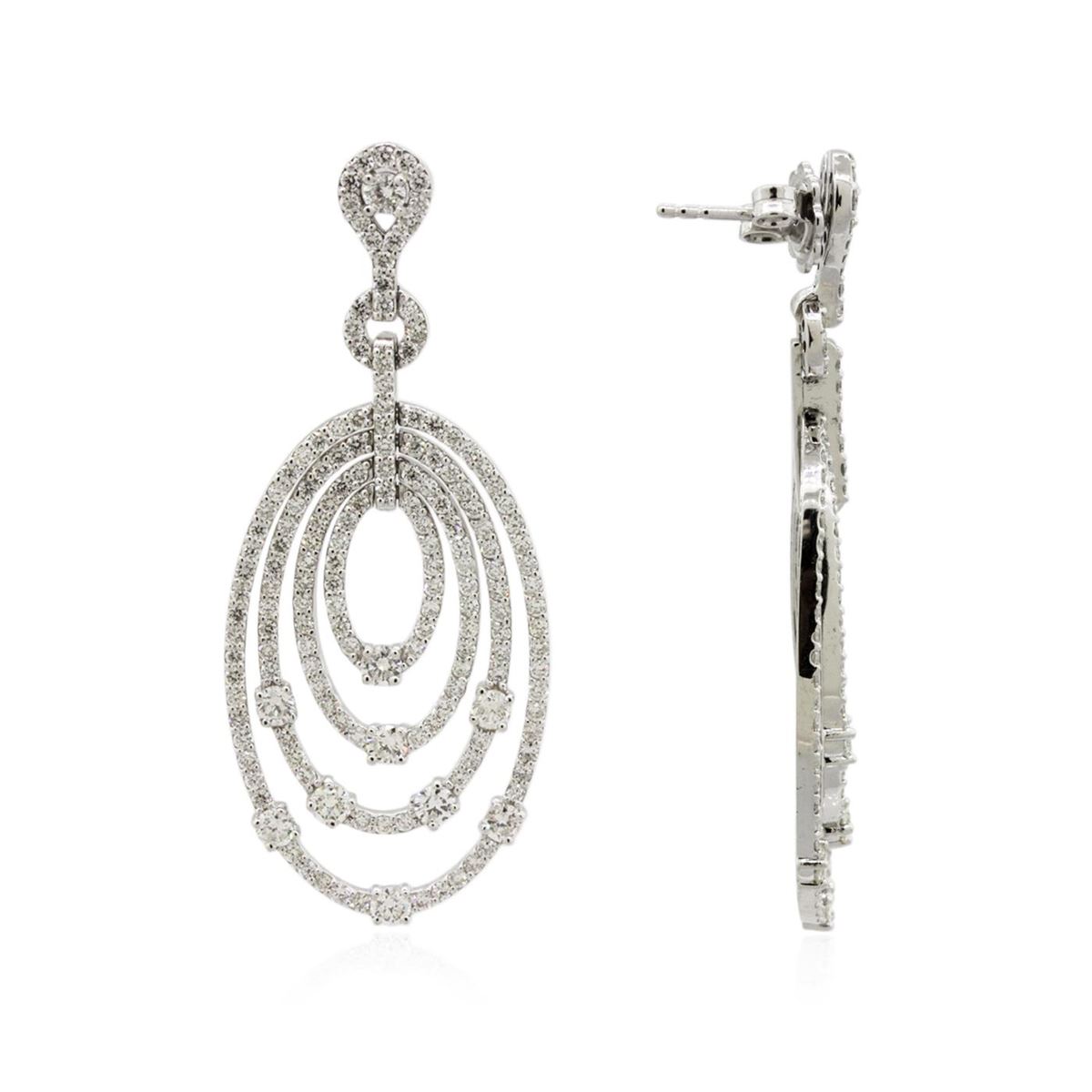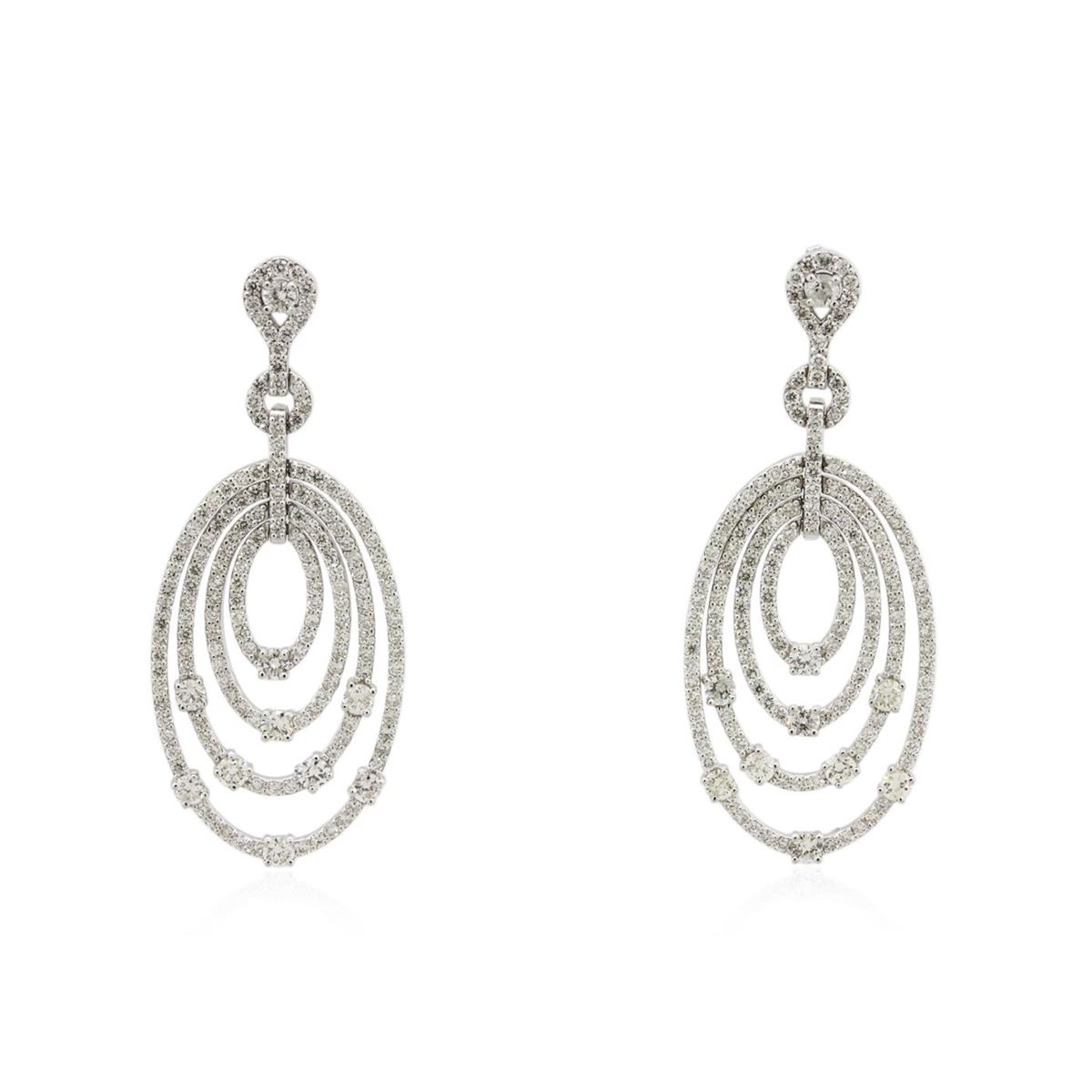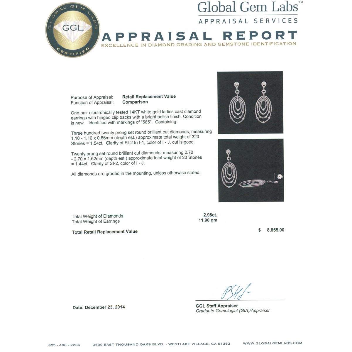 One pair electronically tested 14KT white gold ladies cast diamond earrings with hinged clip backs with a bright polish finish. Identified with markings of "585". Condition is new. Containing: Three Hundred Twenty prong set round brilliant cut diamonds, measuring 1.10 - 1.10 x 0.66mm (depth est.) approximate total weight of 320 Stones = 1.54ct. Clarity: SI-2 to I-1. Color: I - J, Cut is Good. Twenty prong set round brilliant cut diamonds, measuring 2.70 - 2.70 x 1.62mm (depth est.) approximate total weight of 20 Stones = 1.44ct. Clarity: SI-2. Color: I - J. All diamonds are graded in the mounting, unless otherwise stated. Total Weight of Diamonds 2.98ct. Total Weight of Earrings 11.90 grams. GGL Appraised at $8,855.00.