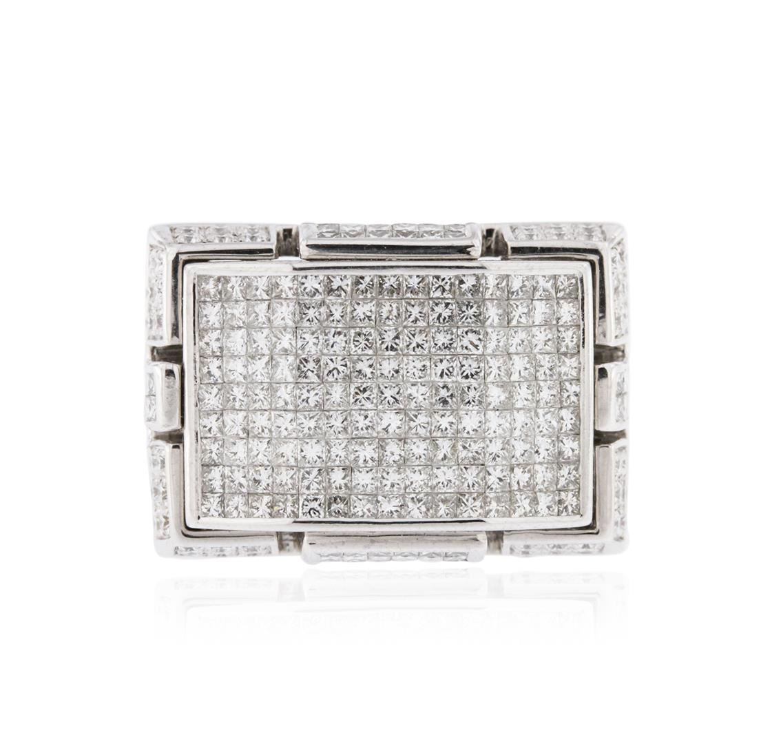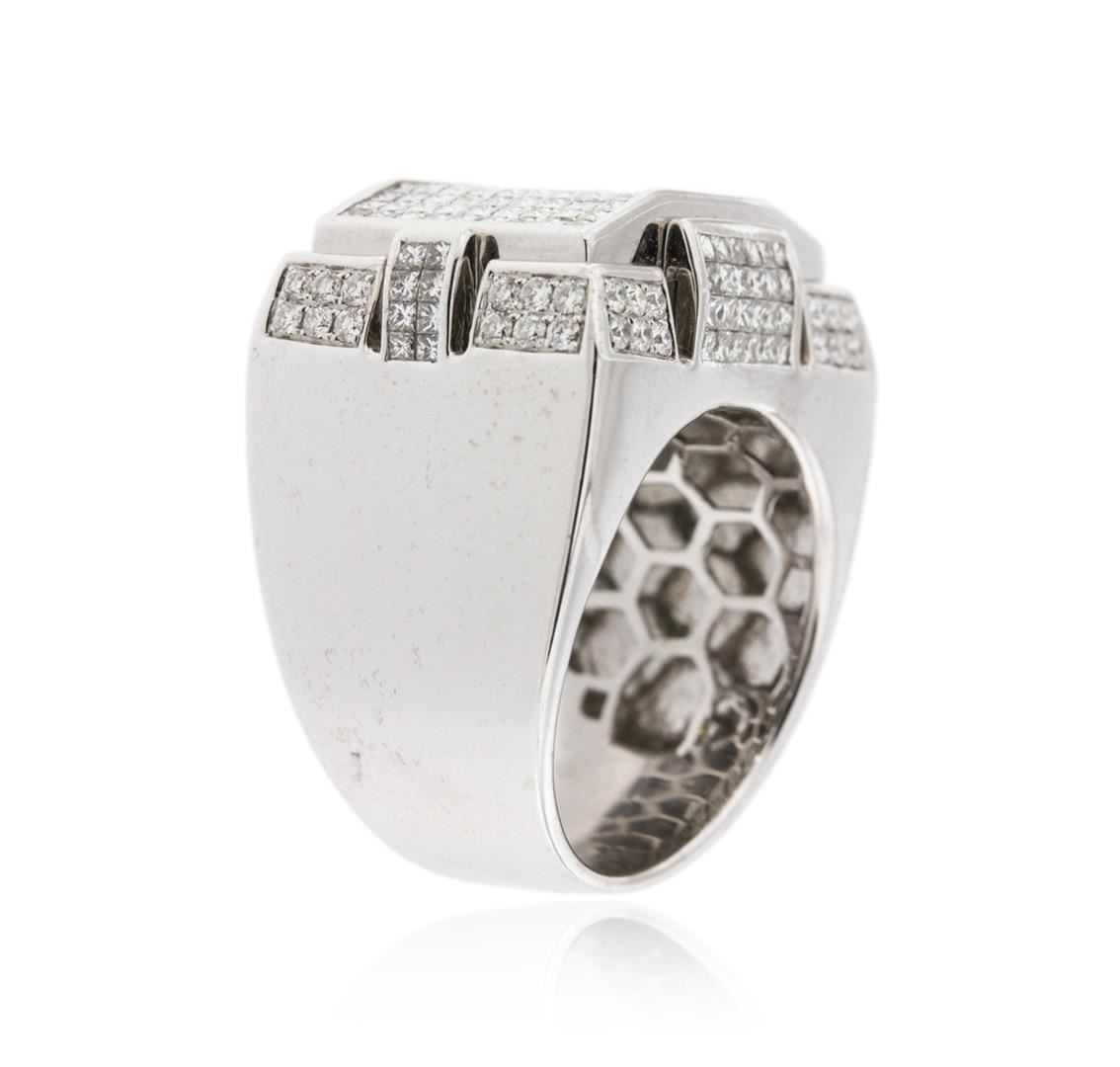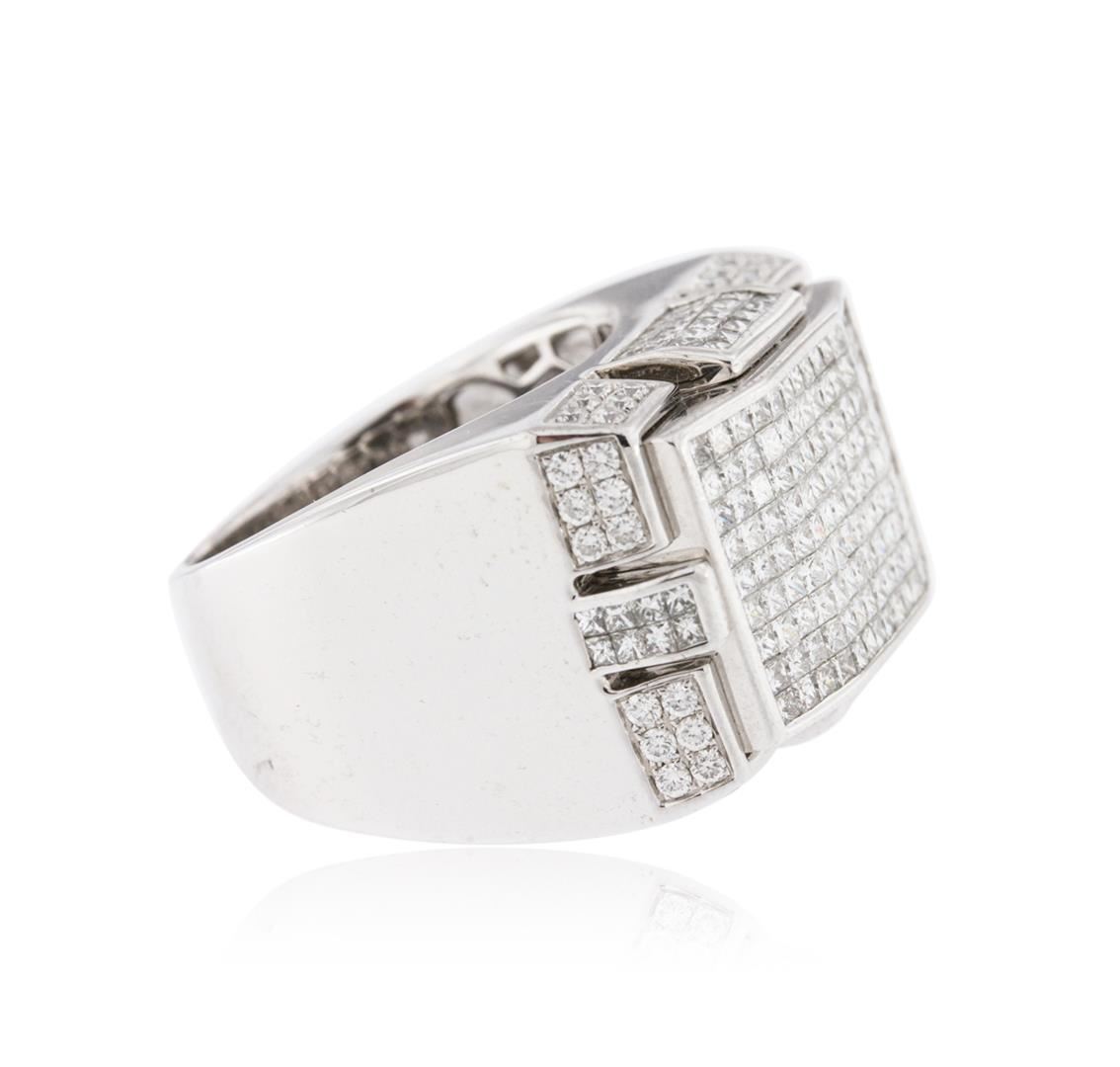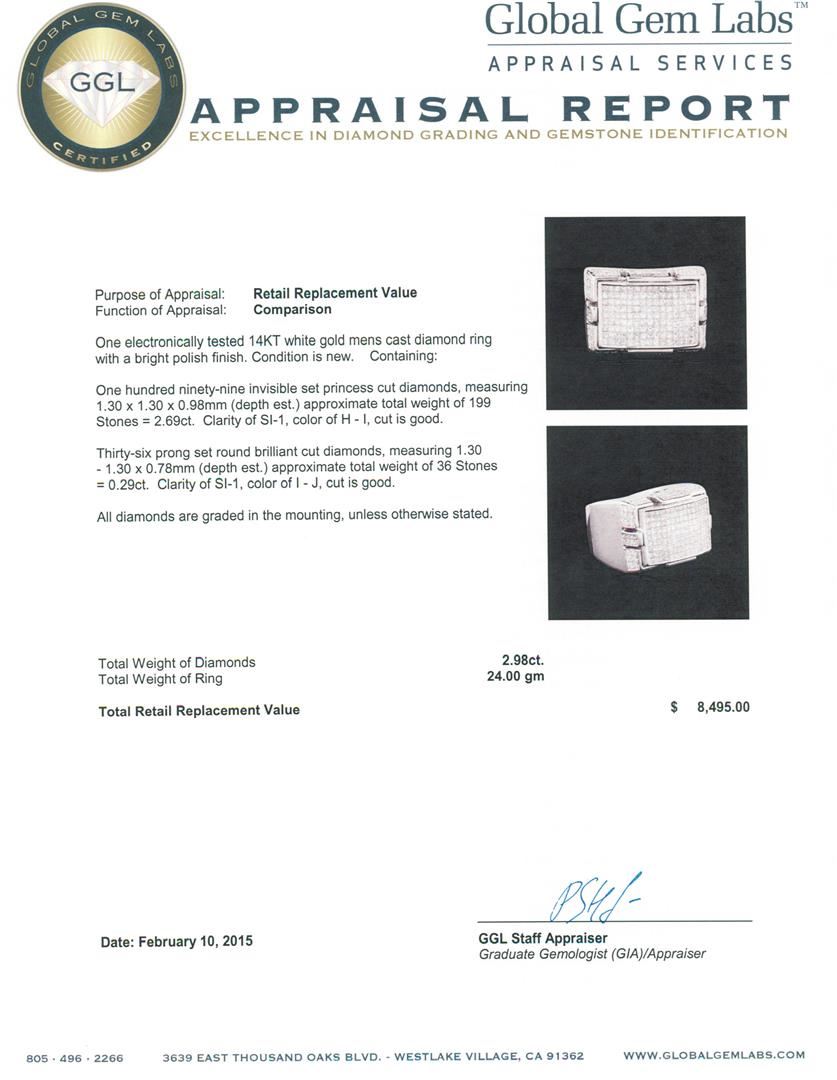 One electronically tested 14KT white gold mens cast diamond ring with a bright polish finish. Condition is new. Containing: One Hundred Ninety-Nine invisible set princess cut diamonds, measuring 1.30 x 1.30 x 0.98mm (depth est.) approximate total weight of 199 Stones = 2.69ct. Clarity: SI-1. Color: H - I, Cut is Good. Thirty-Six prong set round brilliant cut diamonds, measuring 1.30 - 1.30 x 0.78mm (depth est.) approximate total weight of 36 Stones = 0.29ct. Clarity: SI-1. Color: I - J, Cut is Good. All diamonds are graded in the mounting, unless otherwise stated. Total Weight of Diamonds 2.98ct. Total Weight of Ring 24.00 grams. GGL Appraised at $8,495.00.