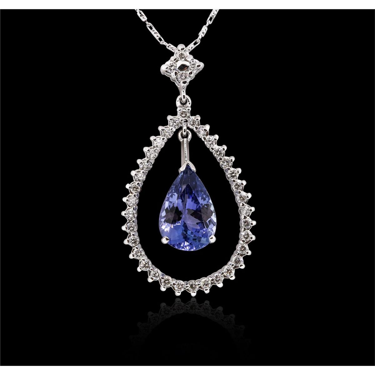 One electronically tested 14KT white gold ladies combination cast & assembled tanzanite and diamond pendant & chain 18.0" long, round bar link with a lobster claw clasp with a bright polish finish. Condition is new. Containing: One prong set pear modified brilliant cut natural tanzanite, measuring 11.64 x 8.05 x 5.10mm, exact weight 2.98ct., clarity is eye clean, type I, medium light, very slightly grayish, violet color, (GIA V 4/3), cut is good. Thirty-Eight prong set round brilliant cut diamonds, measuring 1.50 - 1.50 x 0.90mm (depth est.) approximate total weight of 38 Stones = 0.47ct. Clarity: SI-2 to I-1. Color: I - J, Cut is Good. All diamonds and colored gemstones are graded in the mounting, unless otherwise stated. Colored gemstones are presumed to have been subjected to commonly used enhancement processes. Total Weight of Colored Stones 2.98ct. Total Weight of Diamonds 0.47ct. Total Weight of Pendant & Chain 5.50 grams. GGL Appraised at $5,695.00.
