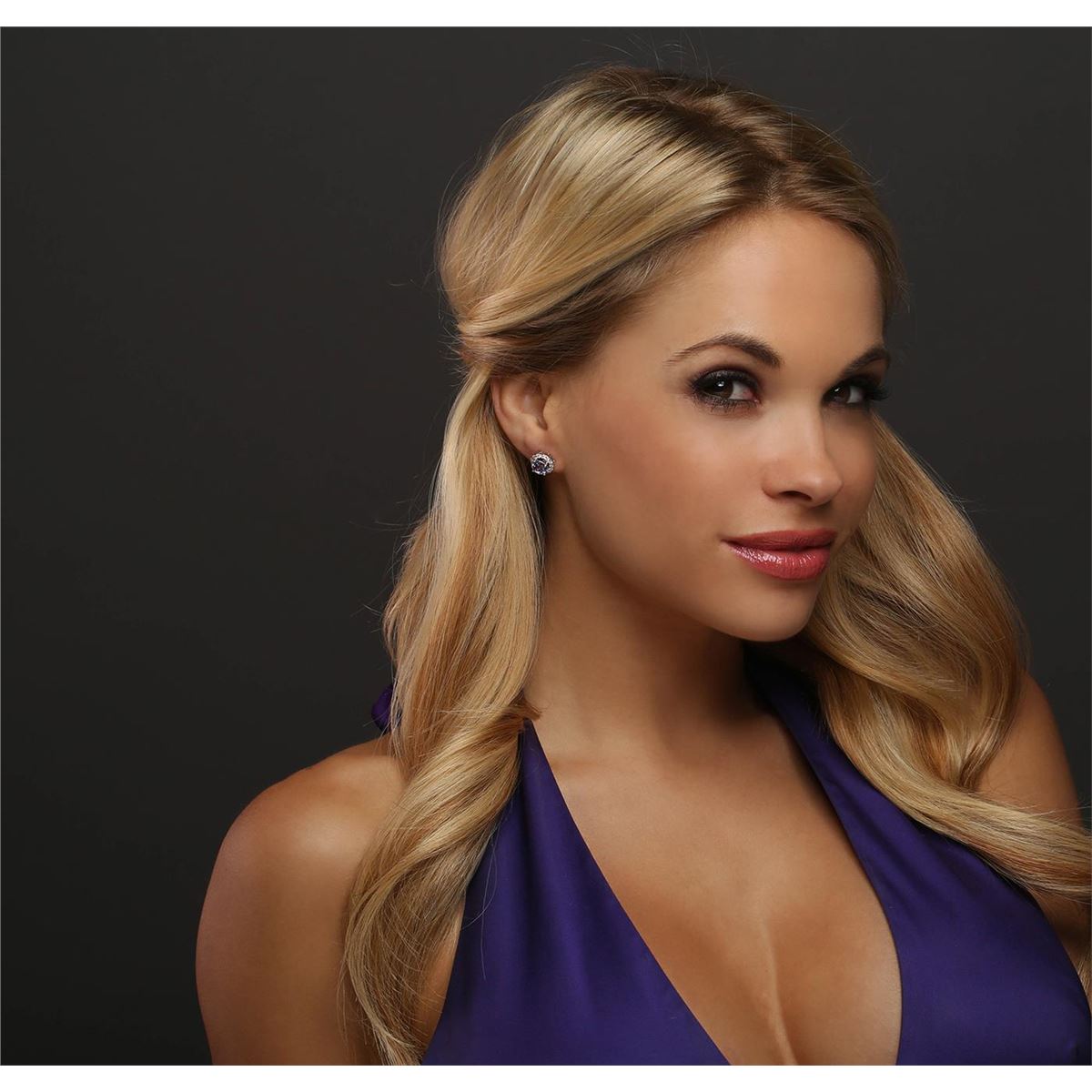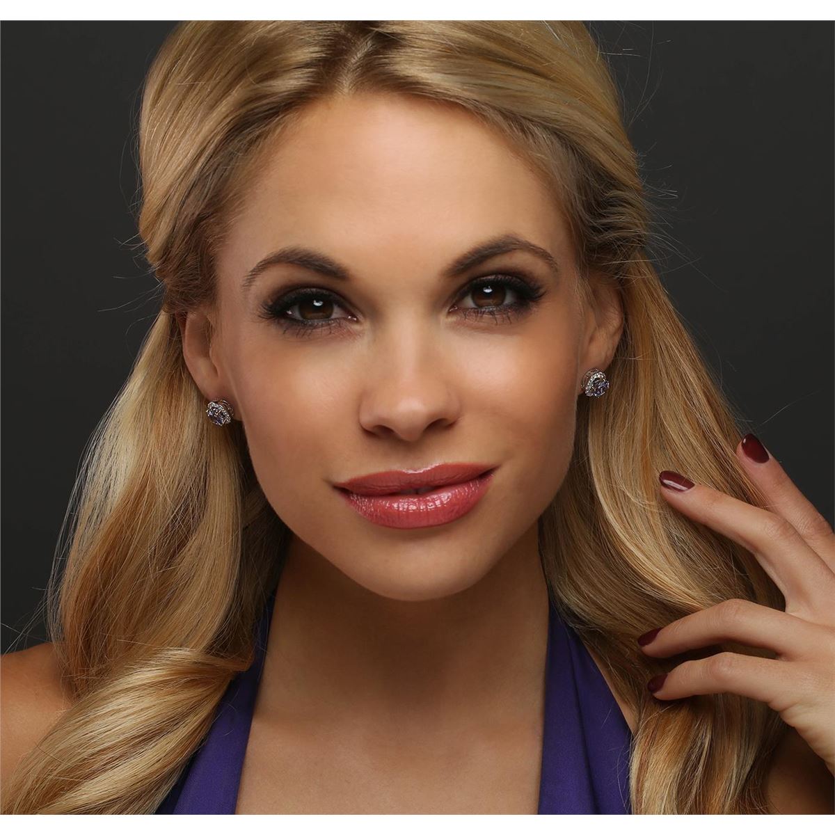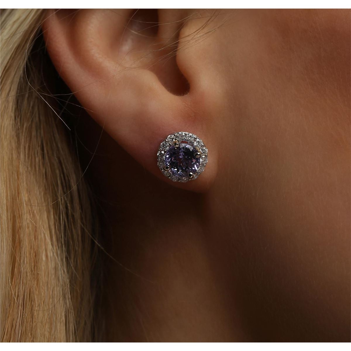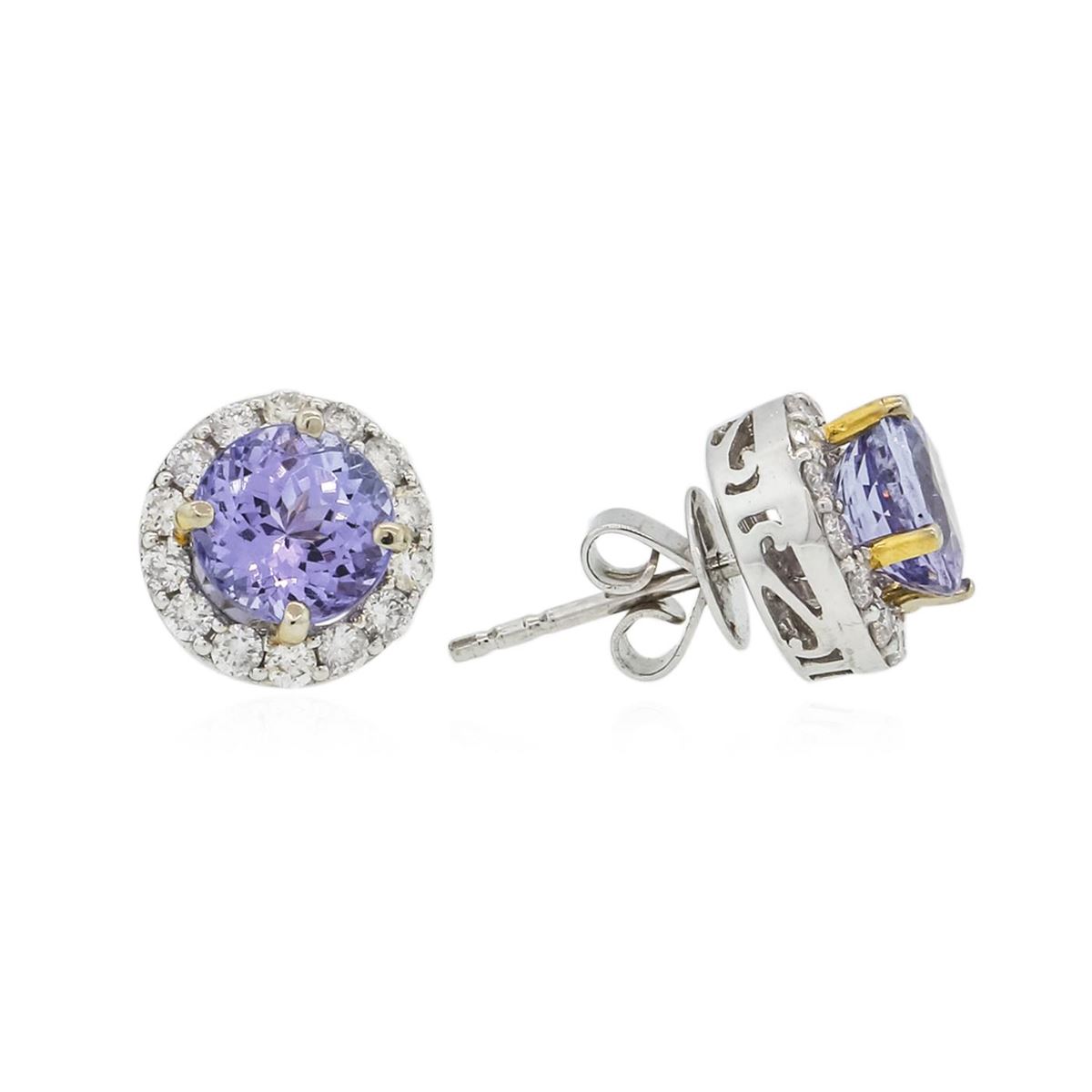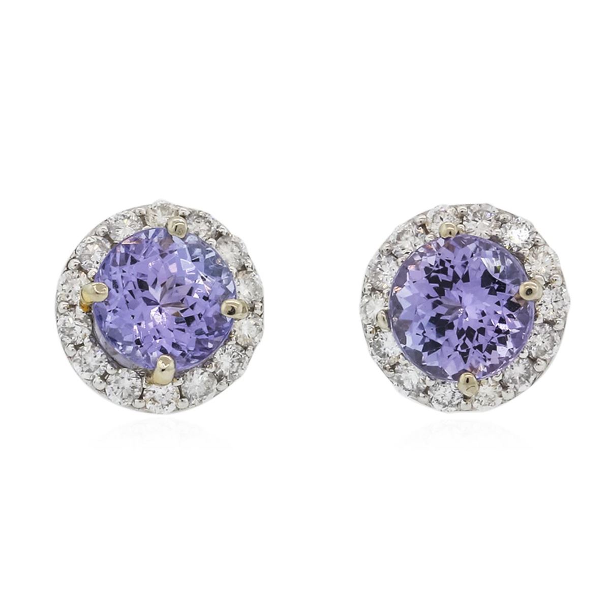 One pair electronically tested 14KT white gold ladies combination cast & assembled stud earrings with friction posts with a bright polish finish. Identified with markings of "14K". Condition is new. Containing: Two prong set round modified brilliant cut natural tanzanites, measuring 7.00. - 7.00 x 4.55 mm, approximate total weight of 2.98ct., clarity is eye clean, type I, medium light, very slightly grayish, violet color, (GIA V 4/3), cut is good. Twenty-Eight prong set round brilliant cut diamonds, measuring 1.70 - 1.70 x 1.02mm (depth est.) approximate total weight of 28 Stones = 0.50ct. Clarity: SI-2 to I-1. Color: I - J, Cut is Good. Colored gemstones are presumed to have been subjected to commonly used enhancement processes. All diamonds and colored gemstones are graded in the mounting, unless otherwise stated. Total Weight of Colored Stones 2.98ct. Total Weight of Diamonds 0.50ct. Total Weight of Earrings 3.50 grams. GGL Appraised at $4,045.00.