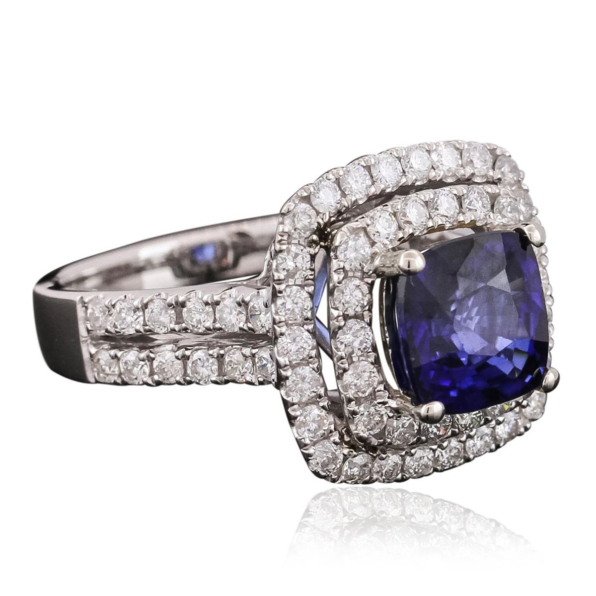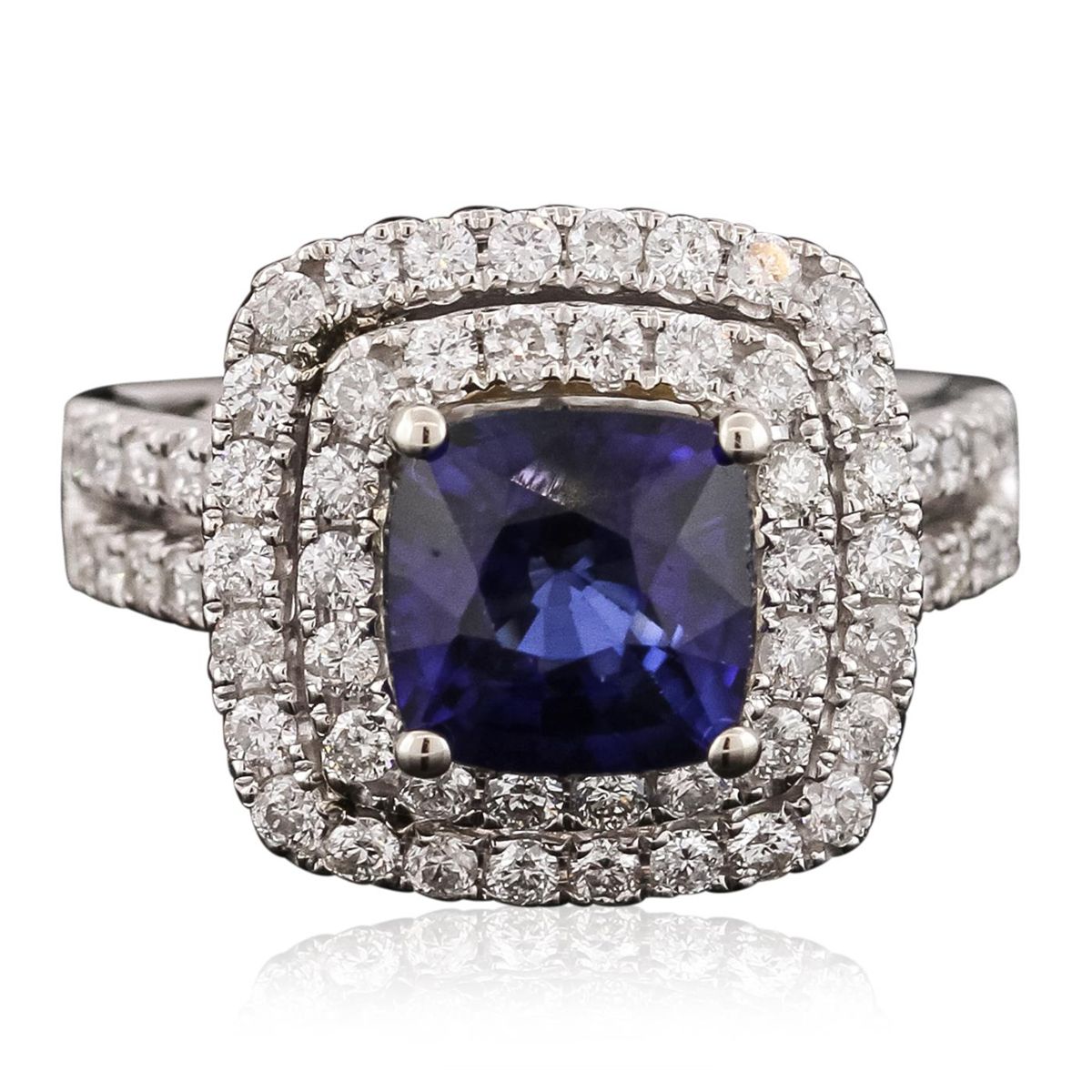 One electronically tested 14KT white gold ladies combination cast & assembled ring with a bright polish finish. Identified with markings of "14K". Condition is new. Containing: One prong set square cushion modified brilliant cut natural blue sapphire, measuring 7.88 x 7.88 x 5.12mm, approximate weight of 2.99ct., clarity is eye clean, type II, medium dark, moderately strong, blue color, (GIA B 6/4), cut is good. Sixty-Eight prong set round brilliant cut diamonds, measuring 1.60 - 1.60 x 0.96mm (depth est.) approximate total weight of 68 Stones = 1.01ct. Clarity: SI-2 to I-2. Color: I - J, Cut is Good. Colored gemstones are presumed to have been subjected to commonly used enhancement processes. All diamonds and colored gemstones are graded in the mounting, unless otherwise stated. Total Weight of Colored Stones 2.99ct. Total Weight of Diamonds 1.01ct. Total Weight of Ring 6.80 grams. GGL Appraised at $7,165.00.