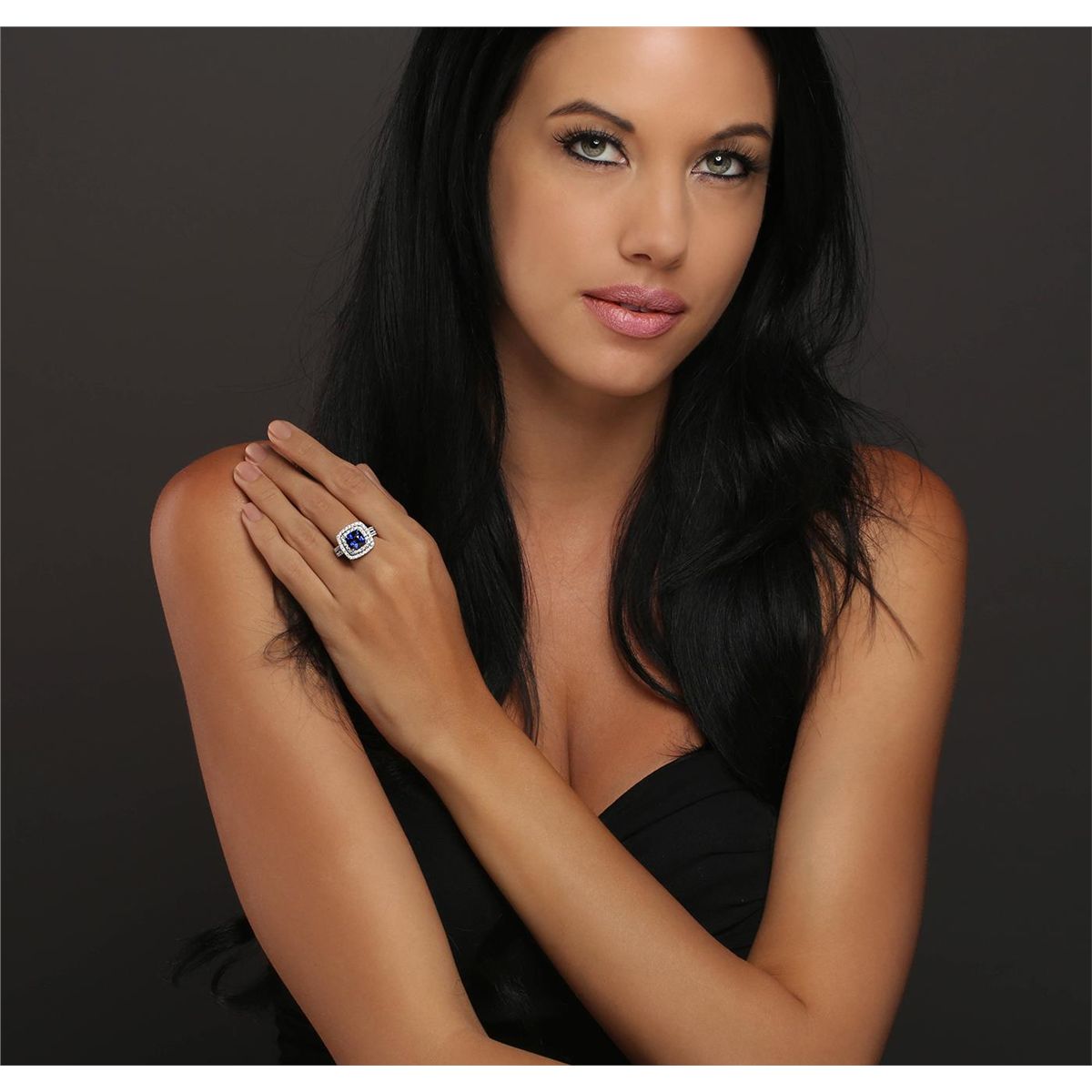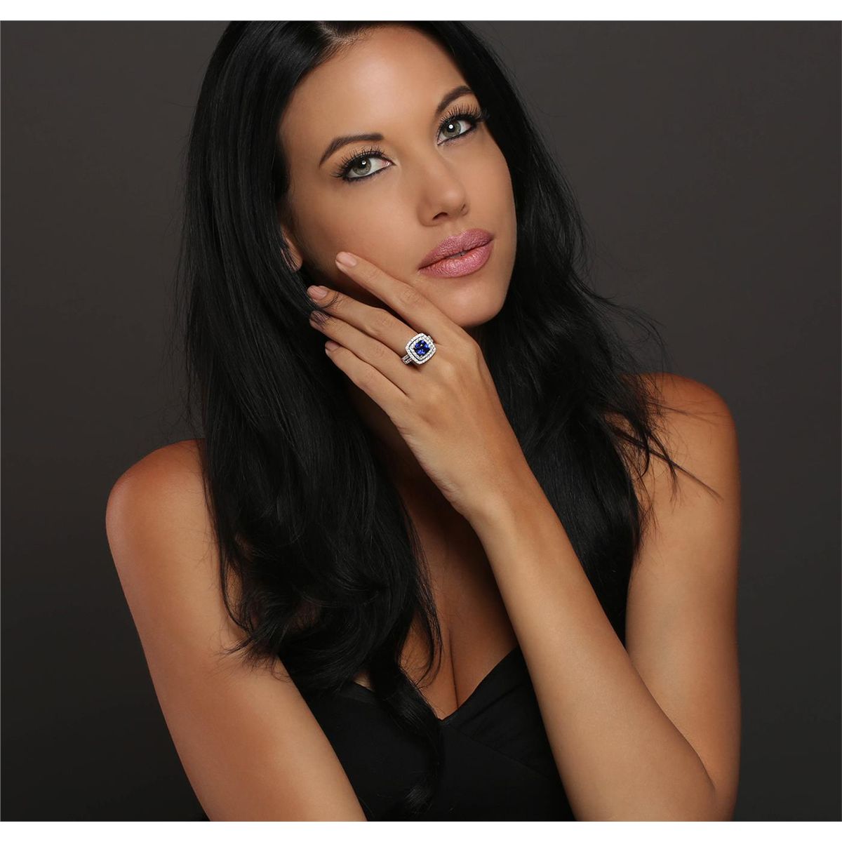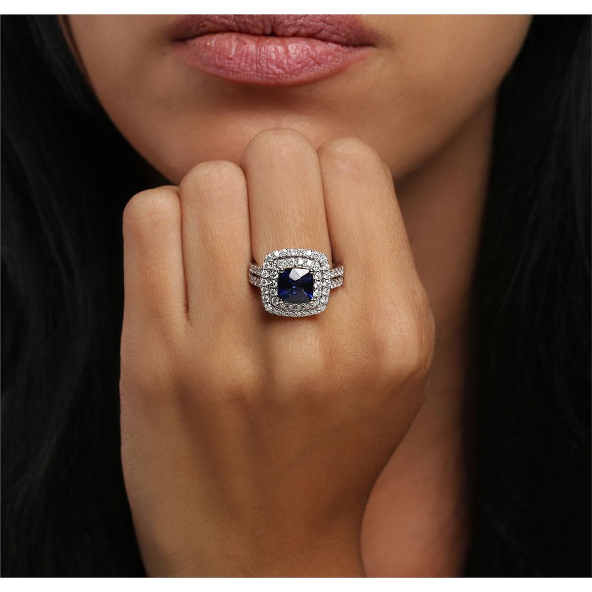 One electronically tested 14KT white gold ladies combination cast & assembled ring with a bright polish finish. Identified with markings of "14K". Condition is new. Containing: One prong set square cushion modified brilliant cut natural blue sapphire, measuring 7.88 x 7.88 x 5.12mm, approximate weight of 2.99ct., clarity is eye clean, type II, medium dark, moderately strong, blue color, (GIA B 6/4), cut is good. Sixty-Eight prong set round brilliant cut diamonds, measuring 1.60 - 1.60 x 0.96mm (depth est.) approximate total weight of 68 Stones = 1.01ct. Clarity: SI-2 to I-2. Color: I - J, Cut is Good. Colored gemstones are presumed to have been subjected to commonly used enhancement processes. All diamonds and colored gemstones are graded in the mounting, unless otherwise stated. Total Weight of Colored Stones 2.99ct. Total Weight of Diamonds 1.01ct. Total Weight of Ring 6.80 grams. GGL Appraised at $7,165.00.
