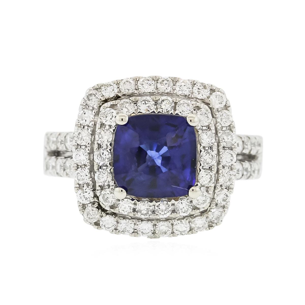 One electronically tested 14KT white gold ladies combination cast & assembled ring with a bright polish finish. Identified with markings of "14K". Condition is new. Containing: One prong set square cushion modified brilliant cut natural blue sapphire, measuring 7.88 x 7.88 x 5.12mm, approximate weight of 2.99ct., clarity is eye clean, type II, medium dark, moderately strong, blue color, (GIA B 6/4), cut is good. Sixty-Eight prong set round brilliant cut diamonds, measuring 1.60 - 1.60 x 0.96mm (depth est.) approximate total weight of 68 Stones = 1.01ct. Clarity: SI-2 to I-2. Color: I - J, Cut is Good. Colored gemstones are presumed to have been subjected to commonly used enhancement processes. All diamonds and colored gemstones are graded in the mounting, unless otherwise stated. Total Weight of Colored Stones 2.99ct. Total Weight of Diamonds 1.01ct. Total Weight of Ring 6.80 grams. GGL Appraised at $7,165.00.