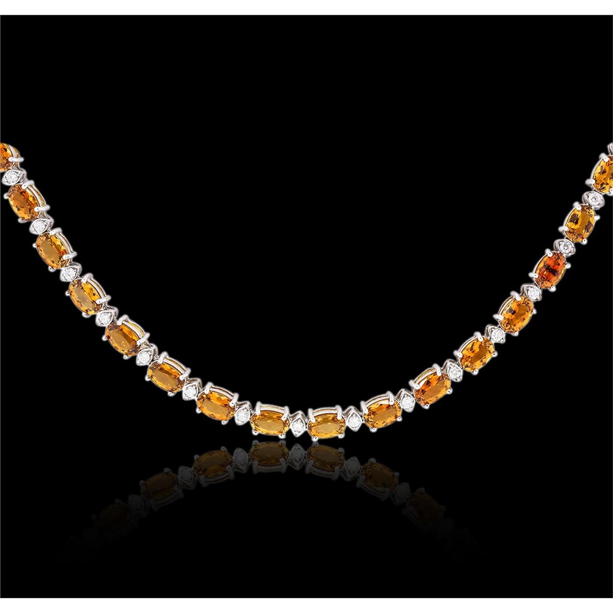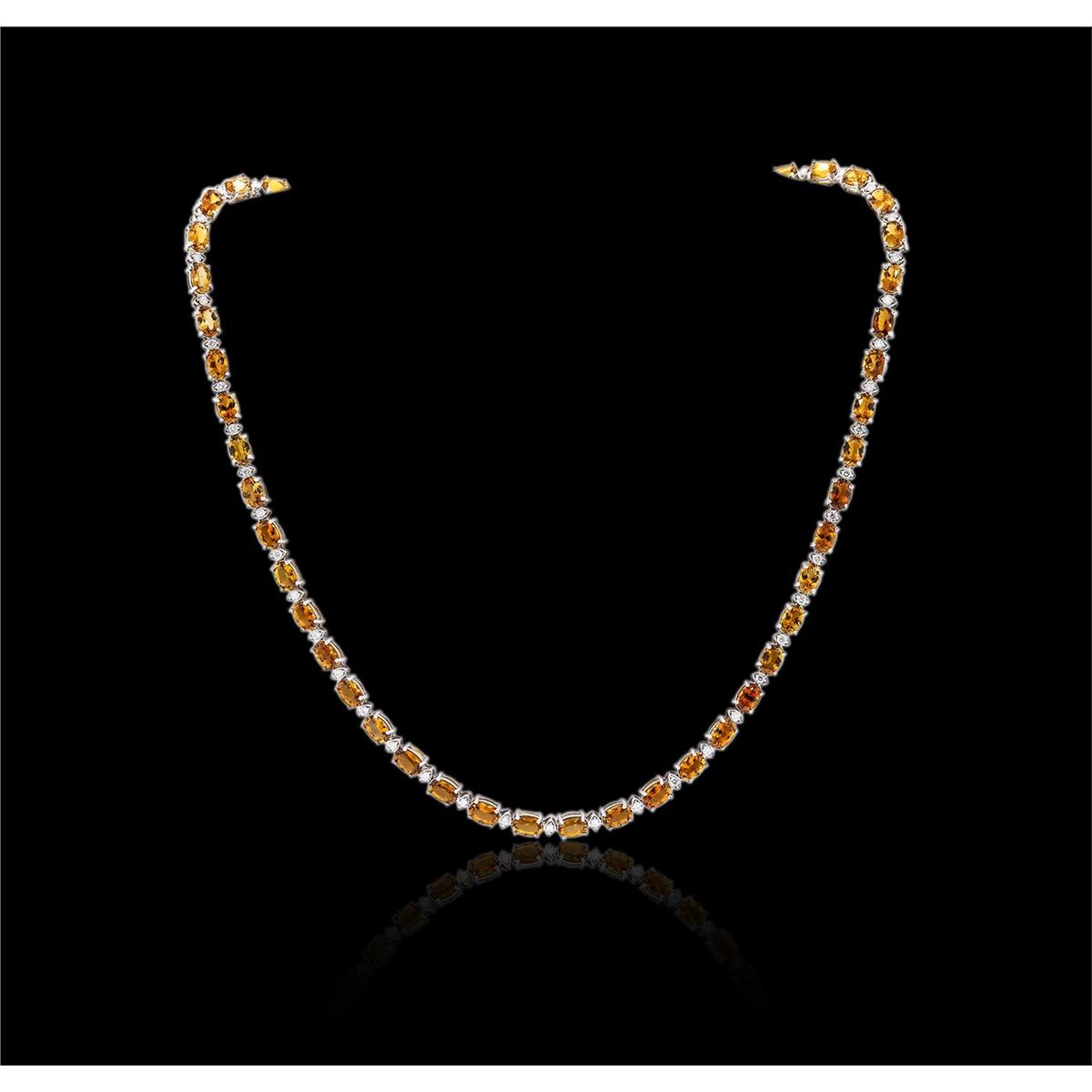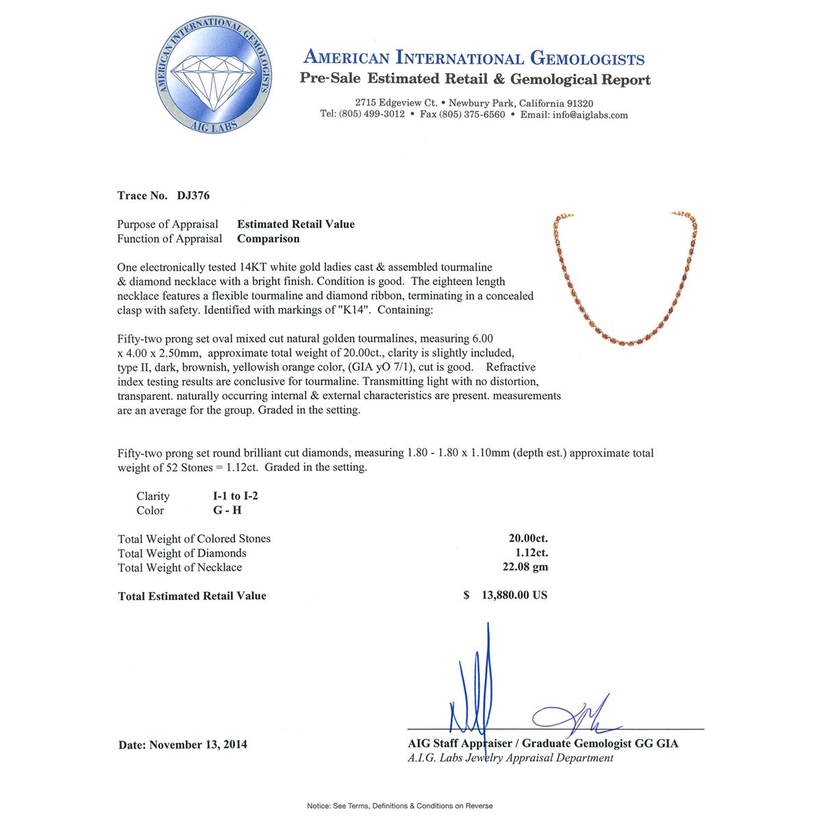 One electronically tested 14KT white gold ladies cast & assembled tourmaline & diamond necklace with a bright finish. The eighteen length necklace features a flexible tourmaline and diamond ribbon, terminating in a concealed clasp with safety. Identified with markings of "K14". Condition is good. Containing: Fifty-two prong set oval mixed cut natural golden tourmalines, measuring 6.00 x 4.00 x 2.50mm, approximate total weight of 20.00ct., clarity is slightly included, type II, dark, brownish, yellowish orange color, (GIA yO 7/1), cut is good. Refractive index testing results are conclusive for tourmaline. Transmitting light with no distortion, transparent. Naturally occurring internal & external characteristics are present. Measurements are an average for the group. Graded in the setting. Fifty-Two prong set round brilliant cut diamonds, measuring 1.80 - 1.80 x 1.10mm (depth est.) approximate total weight of 52 Stones = 1.12ct. Graded in the setting. Clarity I-1 to I-2. Color G - H. Total Weight of Colored Stones 20.00ct. Total Weight of Diamonds 1.12ct. Total Weight of Necklace 22.08 grams. AIG Appraised at $13,880.00.