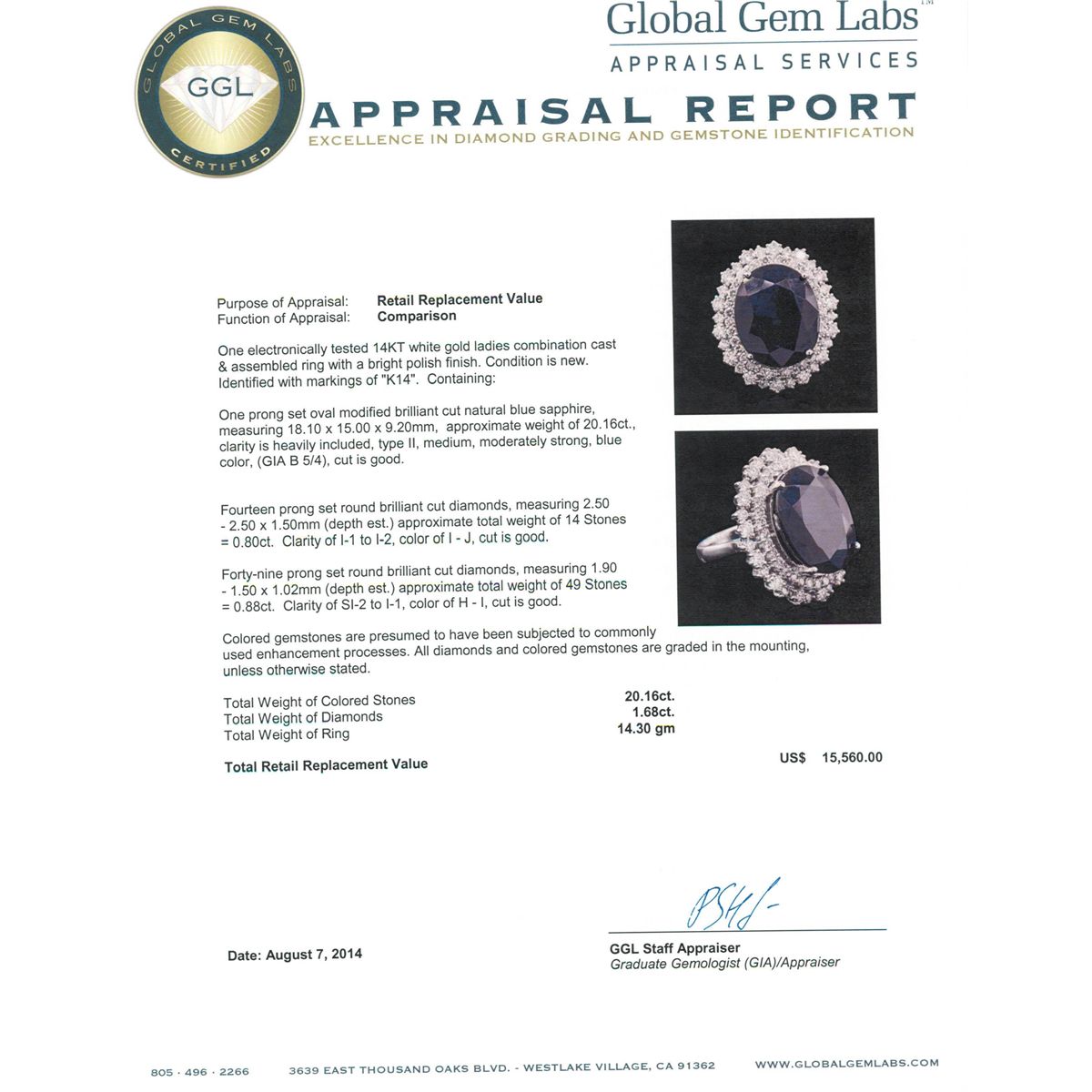 One electronically tested 14KT white gold ladies combination cast & assembled ring with a bright polish finish. Identified with markings of "K14". Condition is new. Containing: One prong set oval modified brilliant cut natural blue sapphire, measuring 18.10 x 15.00 x 9.20mm, approximate weight of 20.16ct., clarity is heavily included, type II, medium, moderately strong, blue color, (GIA B 5/4), cut is good. Fourteen prong set round brilliant cut diamonds, measuring 2.50 - 2.50 x 1.50mm (depth est.) approximate total weight of 14 Stones = 0.80ct. Clarity: I-1 to I-2. Color: I - J, Cut is Good. Forty-Nine prong set round brilliant cut diamonds, measuring 1.90 - 1.50 x 1.02mm (depth est.) approximate total weight of 49 Stones = 0.88ct. Clarity: SI-2 to I-1. Color: H - I, Cut is Good. Colored gemstones are presumed to have been subjected to commonly used enhancement processes. All diamonds and colored gemstones are graded in the mounting, unless otherwise stated. Total Weight of Colored Stones 20.16ct. Total Weight of Diamonds 1.68ct. Total Weight of Ring 14.30 grams. GGL Appraised at $15,560.00.