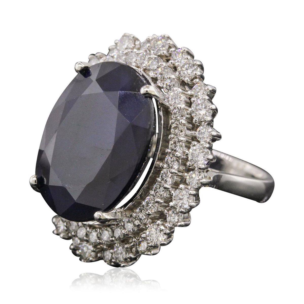One electronically tested 14KT white gold ladies combination cast & assembled ring with a bright polish finish. Identified with markings of "K14". Condition is new. Containing: One prong set oval modified brilliant cut natural blue sapphire, measuring 18.10 x 15.00 x 9.20mm, approximate weight of 20.16ct., clarity is heavily included, type II, medium, moderately strong, blue color, (GIA B 5/4), cut is good. Fourteen prong set round brilliant cut diamonds, measuring 2.50 - 2.50 x 1.50mm (depth est.) approximate total weight of 14 Stones = 0.80ct. Clarity: I-1 to I-2. Color: I - J, Cut is Good. Forty-Nine prong set round brilliant cut diamonds, measuring 1.90 - 1.50 x 1.02mm (depth est.) approximate total weight of 49 Stones = 0.88ct. Clarity: SI-2 to I-1. Color: H - I, Cut is Good. Colored gemstones are presumed to have been subjected to commonly used enhancement processes. All diamonds and colored gemstones are graded in the mounting, unless otherwise stated. Total Weight of Colored Stones 20.16ct. Total Weight of Diamonds 1.68ct. Total Weight of Ring 14.30 grams. GGL Appraised at $15,560.00.