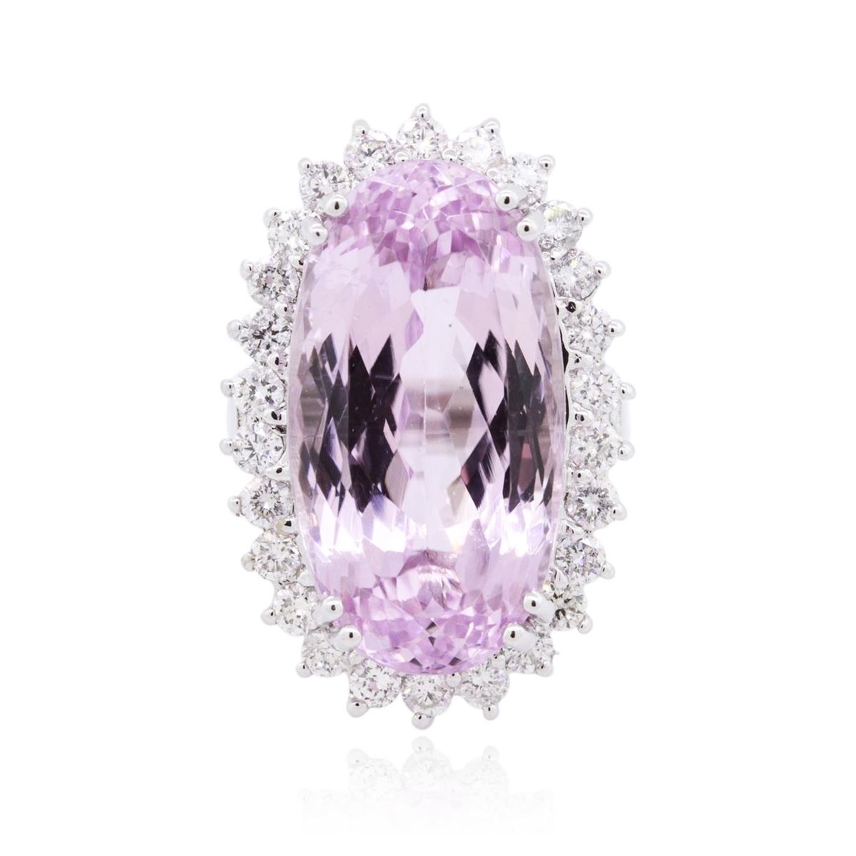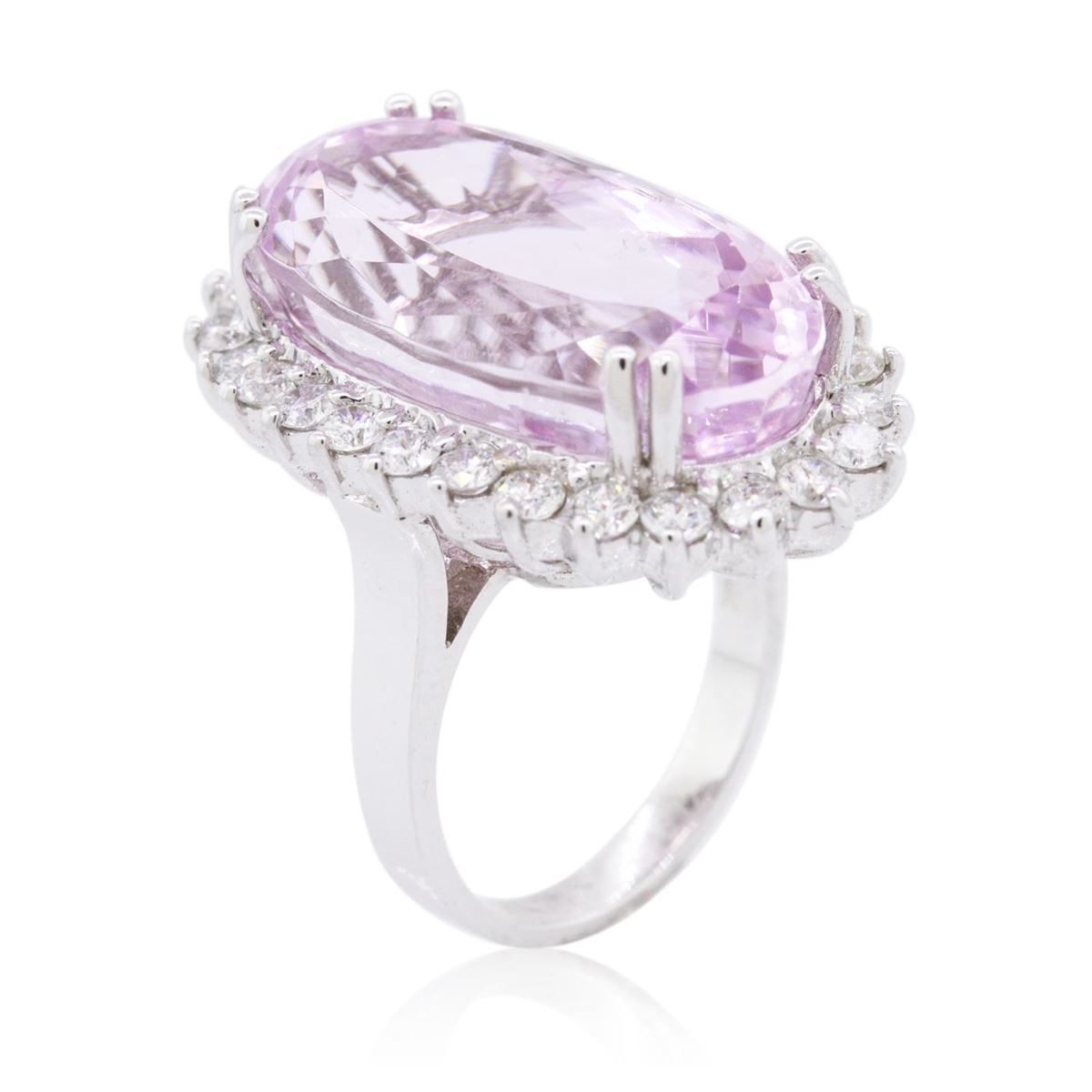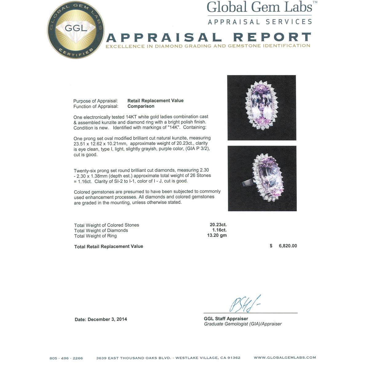 One electronically tested 14KT white gold ladies combination cast & assembled kunzite and diamond ring with a bright polish finish. Identified with markings of "14K". Condition is new. Containing: One prong set oval modified brilliant cut natural kunzite, measuring 23.51 x 12.62 x 10.21mm, approximate weight of 20.23ct., clarity is eye clean, type I, light, slightly grayish, purple color, (GIA P 3/2), cut is good. Twenty-Six prong set round brilliant cut diamonds, measuring 2.30 - 2.30 x 1.38mm (depth est.) approximate total weight of 26 Stones = 1.16ct. Clarity: SI-2 to I-1. Color: I - J, Cut is Good. Colored gemstones are presumed to have been subjected to commonly used enhancement processes. All diamonds and colored gemstones are graded in the mounting, unless otherwise stated. Total Weight of Colored Stones 20.23ct. Total Weight of Diamonds 1.16ct. Total Weight of Ring 13.20 grams. GGL Appraised at $6,820.00.