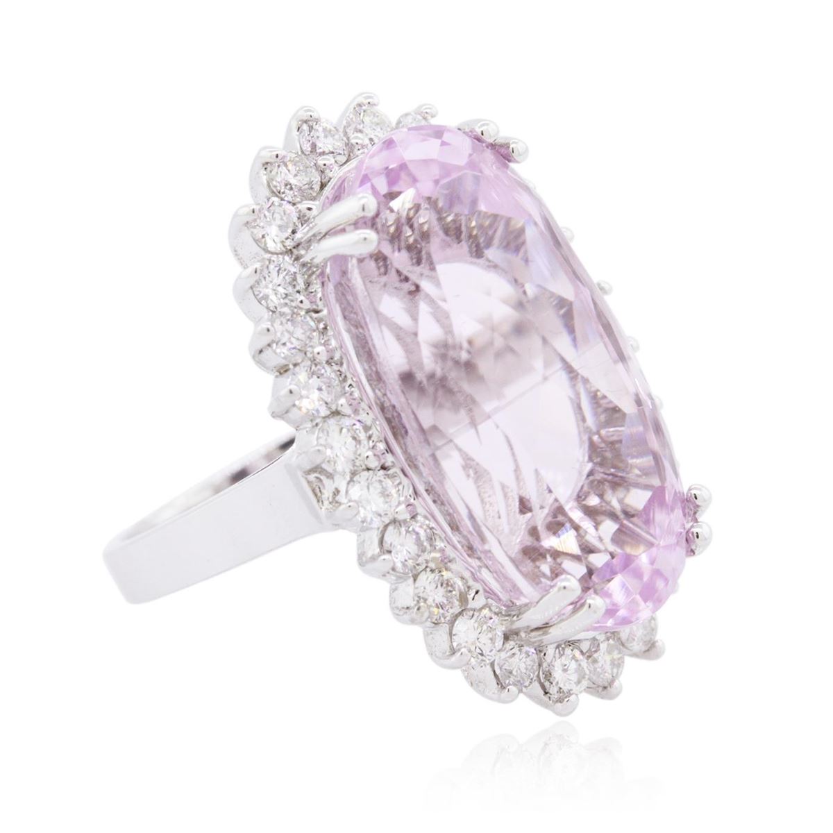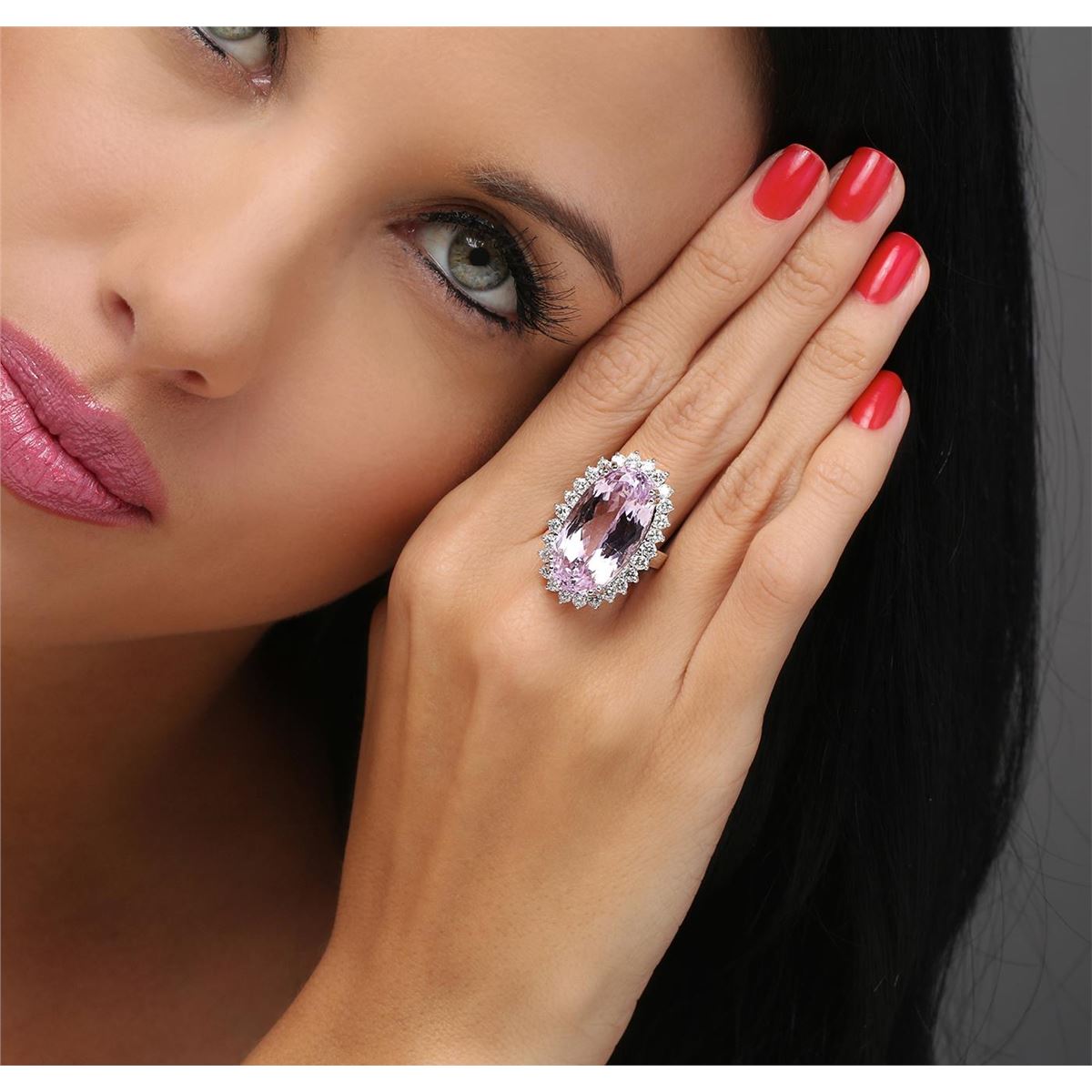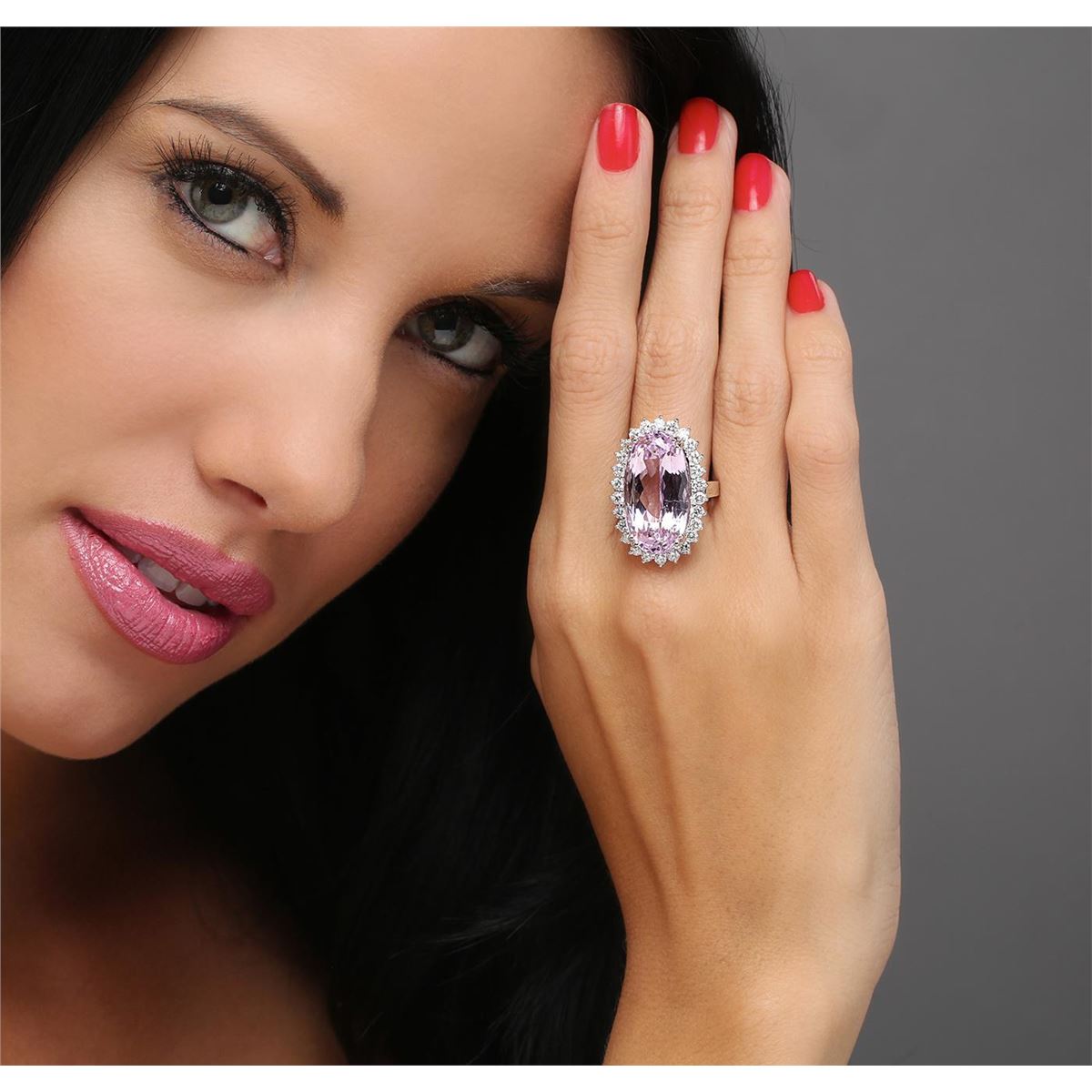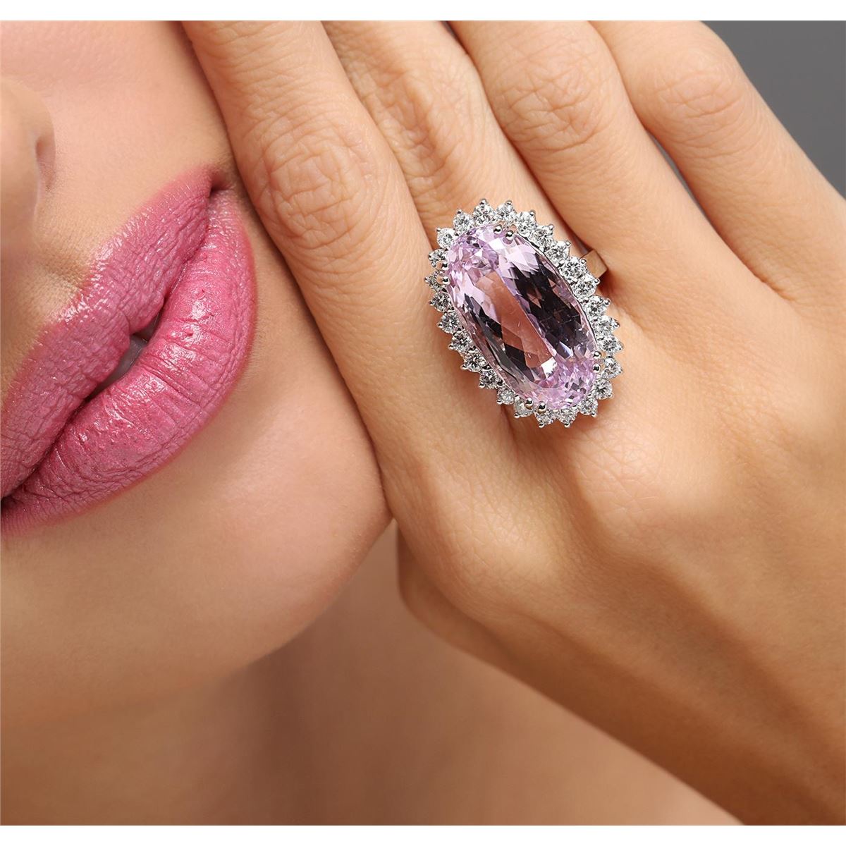 One electronically tested 14KT white gold ladies combination cast & assembled kunzite and diamond ring with a bright polish finish. Identified with markings of "14K". Condition is new. Containing: One prong set oval modified brilliant cut natural kunzite, measuring 23.51 x 12.62 x 10.21mm, approximate weight of 20.23ct., clarity is eye clean, type I, light, slightly grayish, purple color, (GIA P 3/2), cut is good. Twenty-Six prong set round brilliant cut diamonds, measuring 2.30 - 2.30 x 1.38mm (depth est.) approximate total weight of 26 Stones = 1.16ct. Clarity: SI-2 to I-1. Color: I - J, Cut is Good. Colored gemstones are presumed to have been subjected to commonly used enhancement processes. All diamonds and colored gemstones are graded in the mounting, unless otherwise stated. Total Weight of Colored Stones 20.23ct. Total Weight of Diamonds 1.16ct. Total Weight of Ring 13.20 grams. GGL Appraised at $6,820.00.