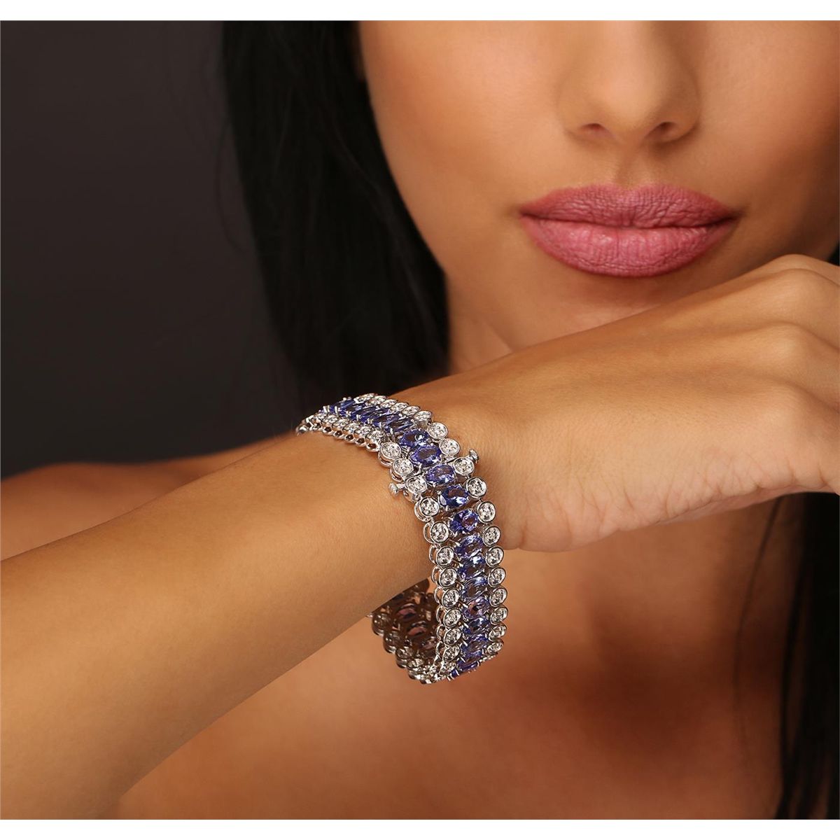 One electronically tested 14KT white gold Ladies combination cast & assembled bracelet with a hidden box clasp with a bright polish finish. Measurements: 7" in length. Condition is new. Containing: Thirty-five prong set oval modified brilliant cut natural tanzanites, measuring 6.58 x 4.99 x 2.60mm, approximate. Total Weight of 20.30ct., clarity is eye clean, type I, medium light, moderately strong, violet color, (GIA V 4/4), cut is good. Colored gemstones are presumed to have been subjected to commonly used color/clarity enhancement processes. Seventy prong set round brilliant cut diamonds, measuring 1.70 - 1.70 x 1.02mm (depth est.) approximate. Total Weight of 70 Stones = 1.25ct. Clarity: SI-2 to I-1. Color: I - K, Cut is Good. Total Weight of Colored Stones 20.30ct. Total Weight of Diamonds 1.25ct. Total Weight of Bracelet 44.20 grams. GGL Appraised at $38,980.00.