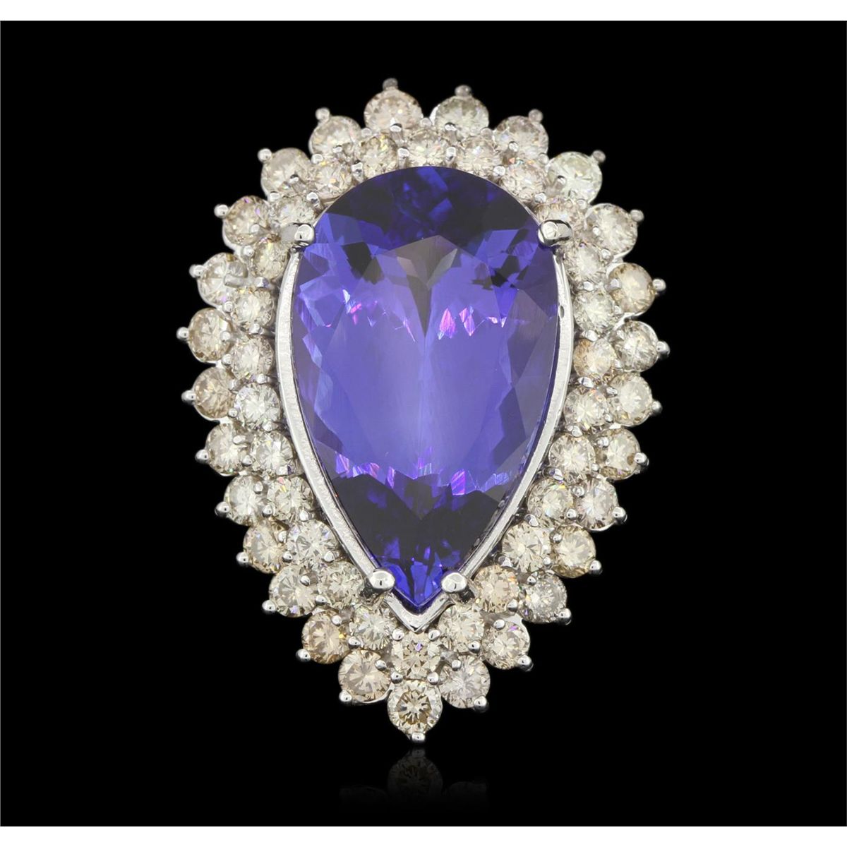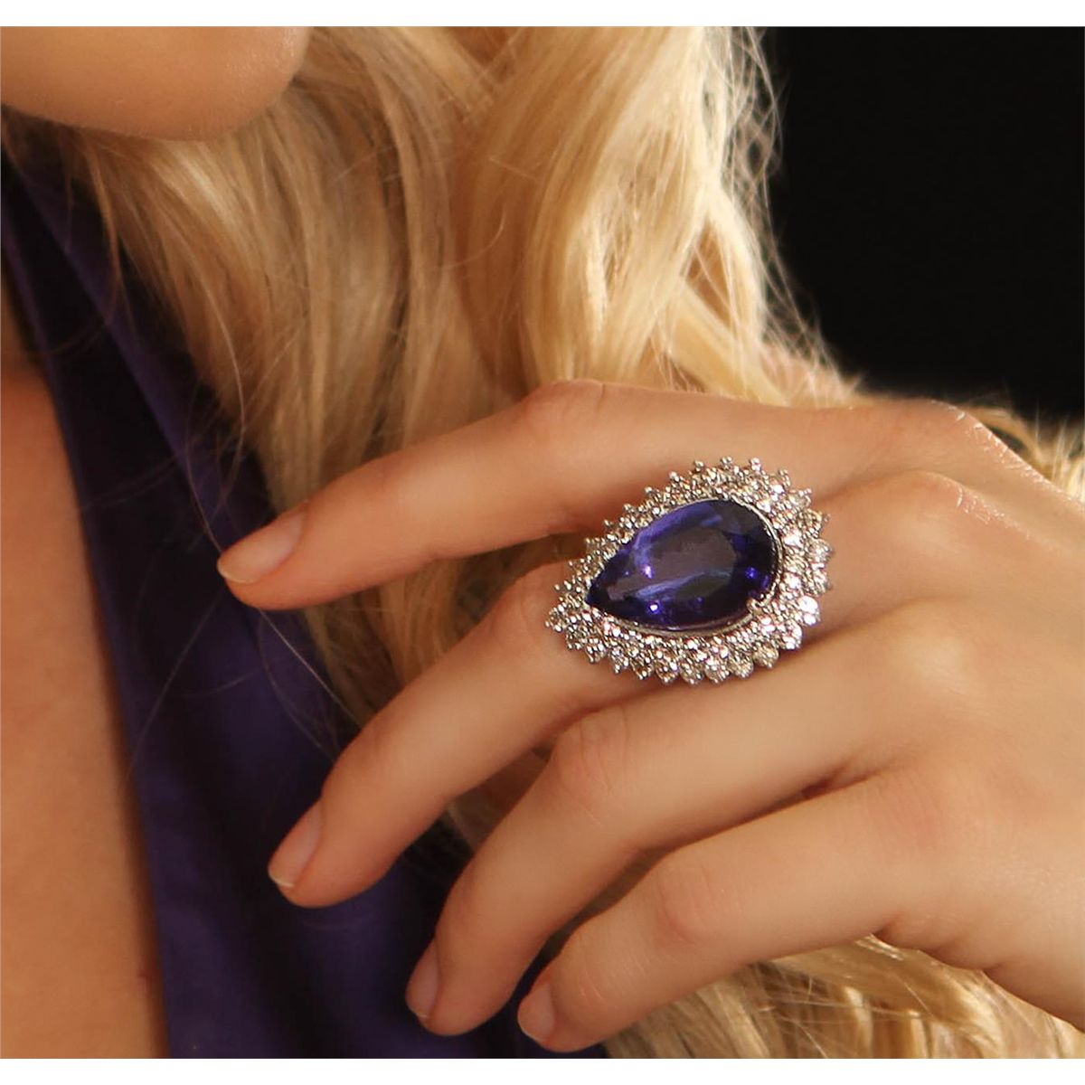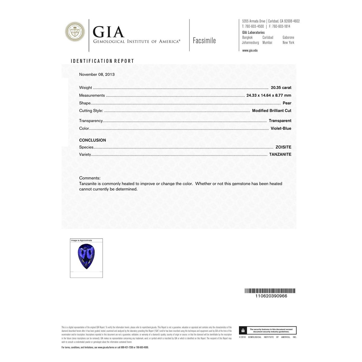 One electronically tested 14KT white gold ladies cast tanzanite and diamond ring with a bright polish finish. Condition is new, good workmanship. The featured tanzanite is set within a two tiered diamond lattice gallery, completed by a three millimeter wide band. Identified with markings of "14K". Containing: One prong set pear mixed cut natural tanzanite, measuring 24.33 x 14.64 x 8.77mm, exact total weight 20.35ct., type I, medium dark, very slightly grayish Clarity is eye clean, type I, medium dark, very slightly grayish, Violet-Blue color, (GIA VB 6/3), cut is good. Transmitting light with no distortion, transparent. GIA Colored Stone Grading Report attached. Graded loose prior to setting in the GIA Laboratory, Report # 2151735929 Tanzanite is a very rare gemstone that is only found in the country of Tanzania. Originally discovered in 1967. Tiffany & Company, named the stone Tanzanite. It is found in the Usumburu Mountains that border the Umba Valley of northern Tanzania. Tanzanite occurs in gray, brown, violet, blue, reddish-purple, & green. The gem is interesting because of its exceptional pleochroism. Rotated in different directions a tanzanite will exhibit multiple changes of color. Tanzanite has a low tolerance to ultrasonic cleaning, and should not be cleaned using this method. Fifty-three prong set round brilliant cut diamonds, measuring 2.80 - 2.70 x 1.65mm (depth est.) approximate total weight of 53 Stones = 4.81ct. Faint brown secondary color throughout. Graded in the setting. Clarity SI-1 to SI-2. Color J - L. Total Weight of Colored Stones 20.35ct. Total Weight of Diamonds 4.81ct. Total Weight of Ring 18.60gm. AIGAppraised at $66,900.00.